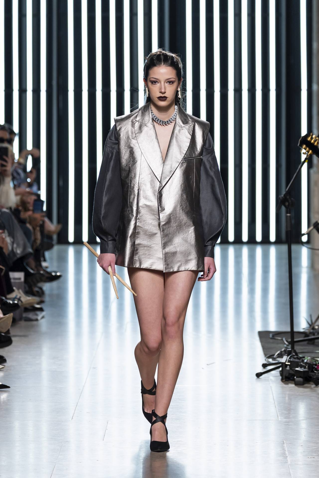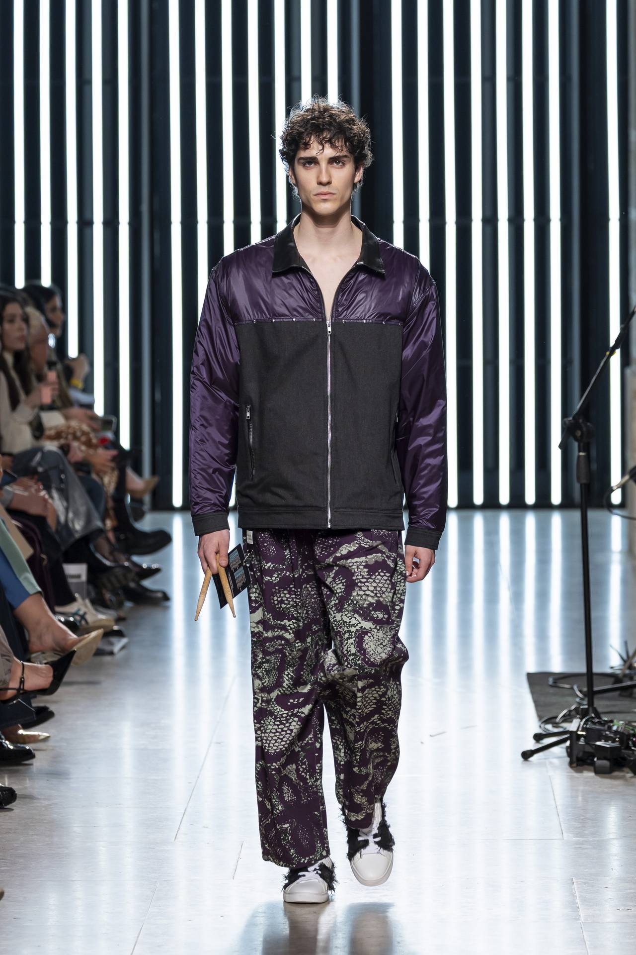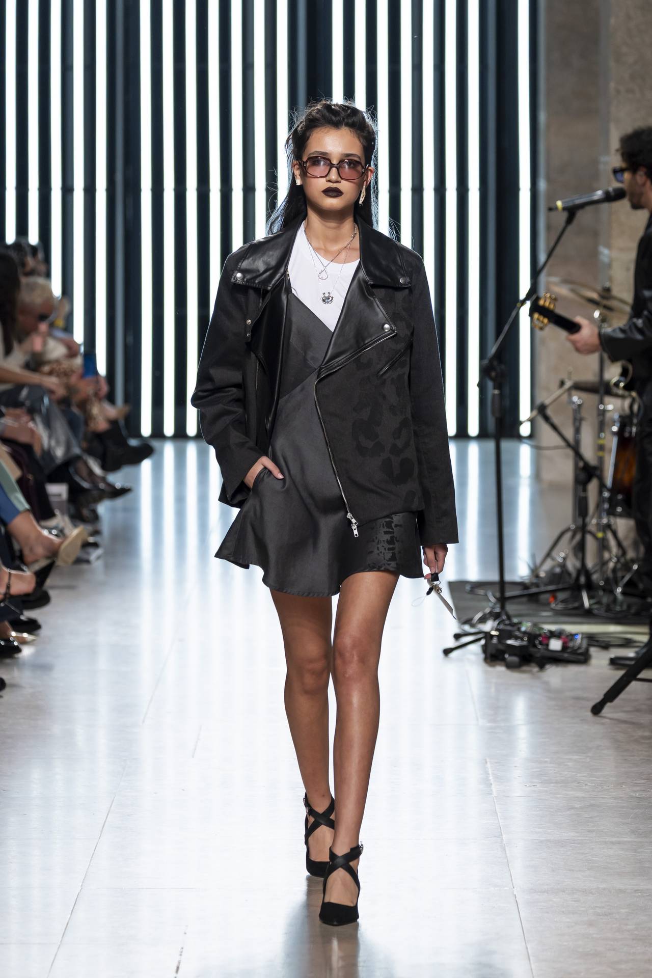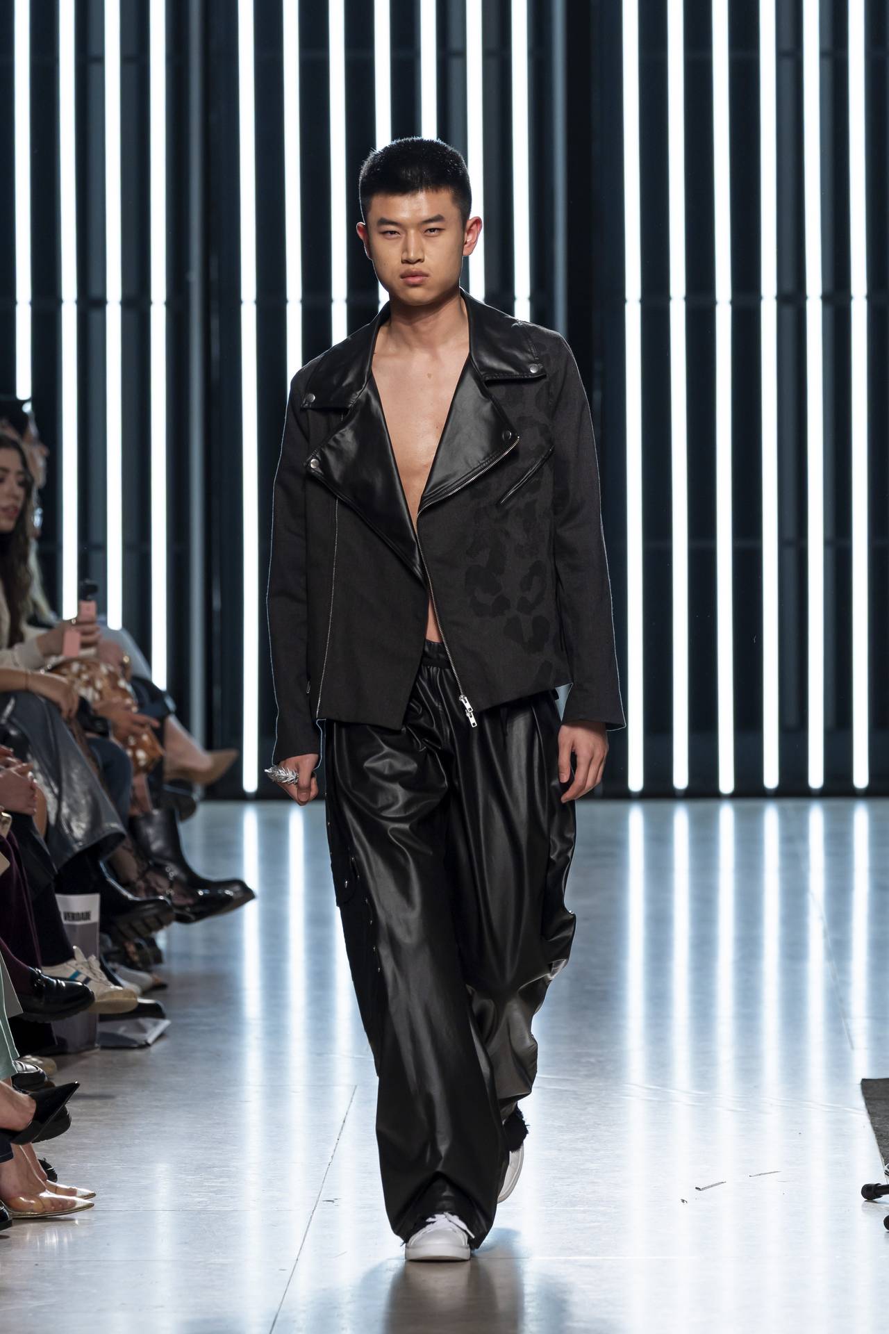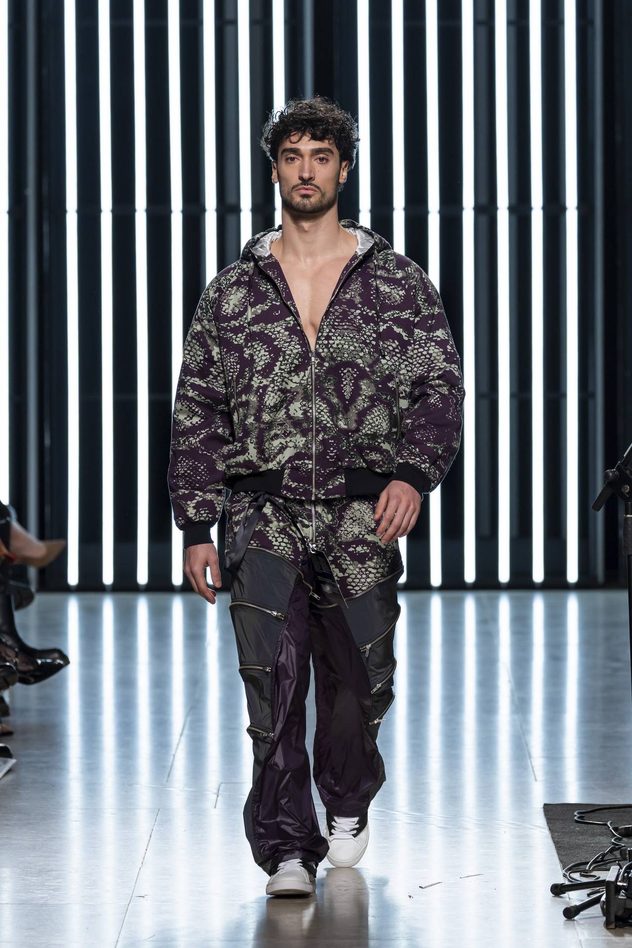 The collection moves through the blacks and greys of asphalt, pierced by the electric distortion of stage purple and light green. Metallic fabrics and details — zippers, snaps and rivets — are combined with notes of whiskey yellow and animal prints, transporting the viewer into the artists’ performative universe. A reflective fabric appears as both a functional and symbolic element, keeping paparazzi at bay.