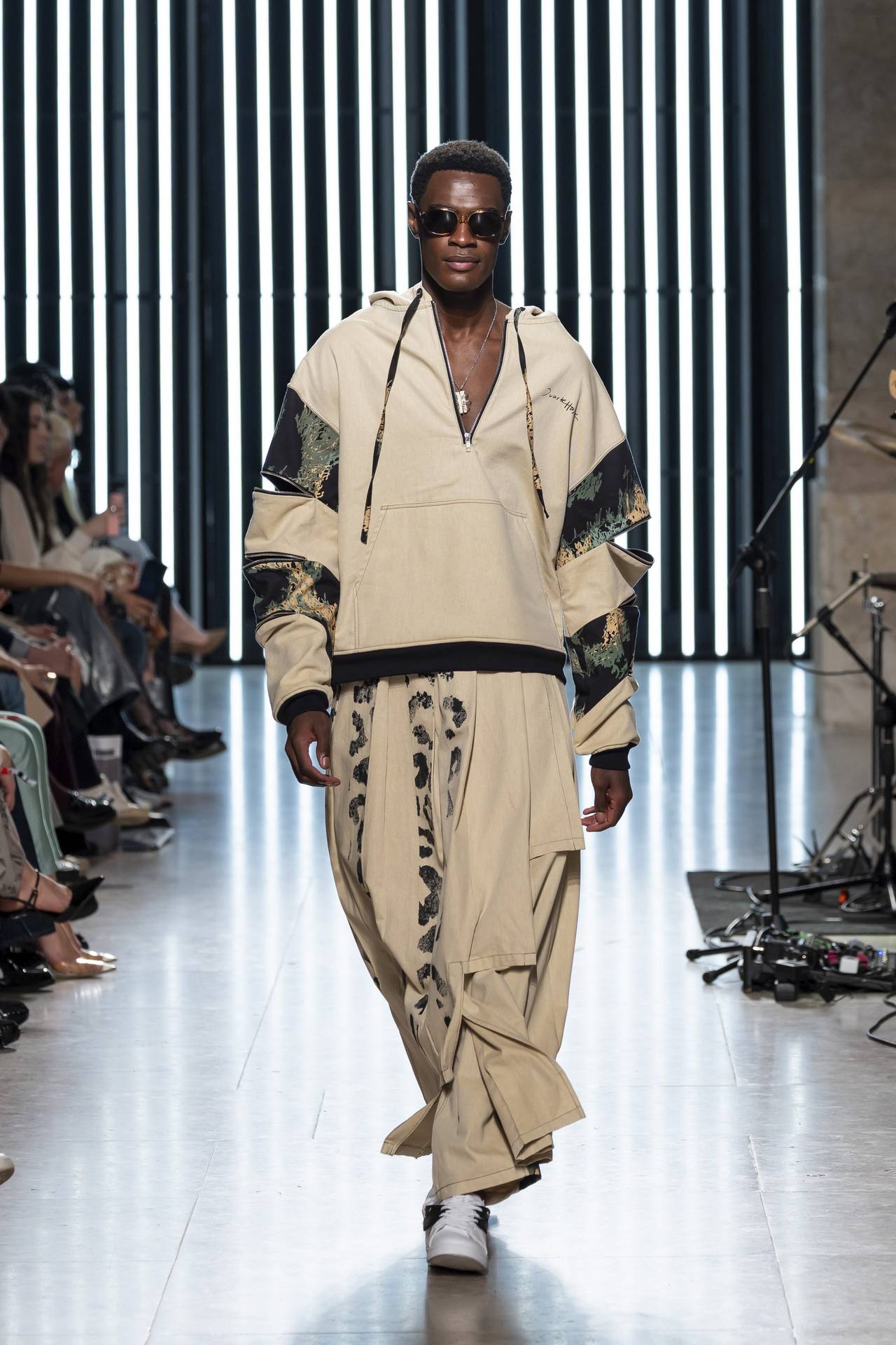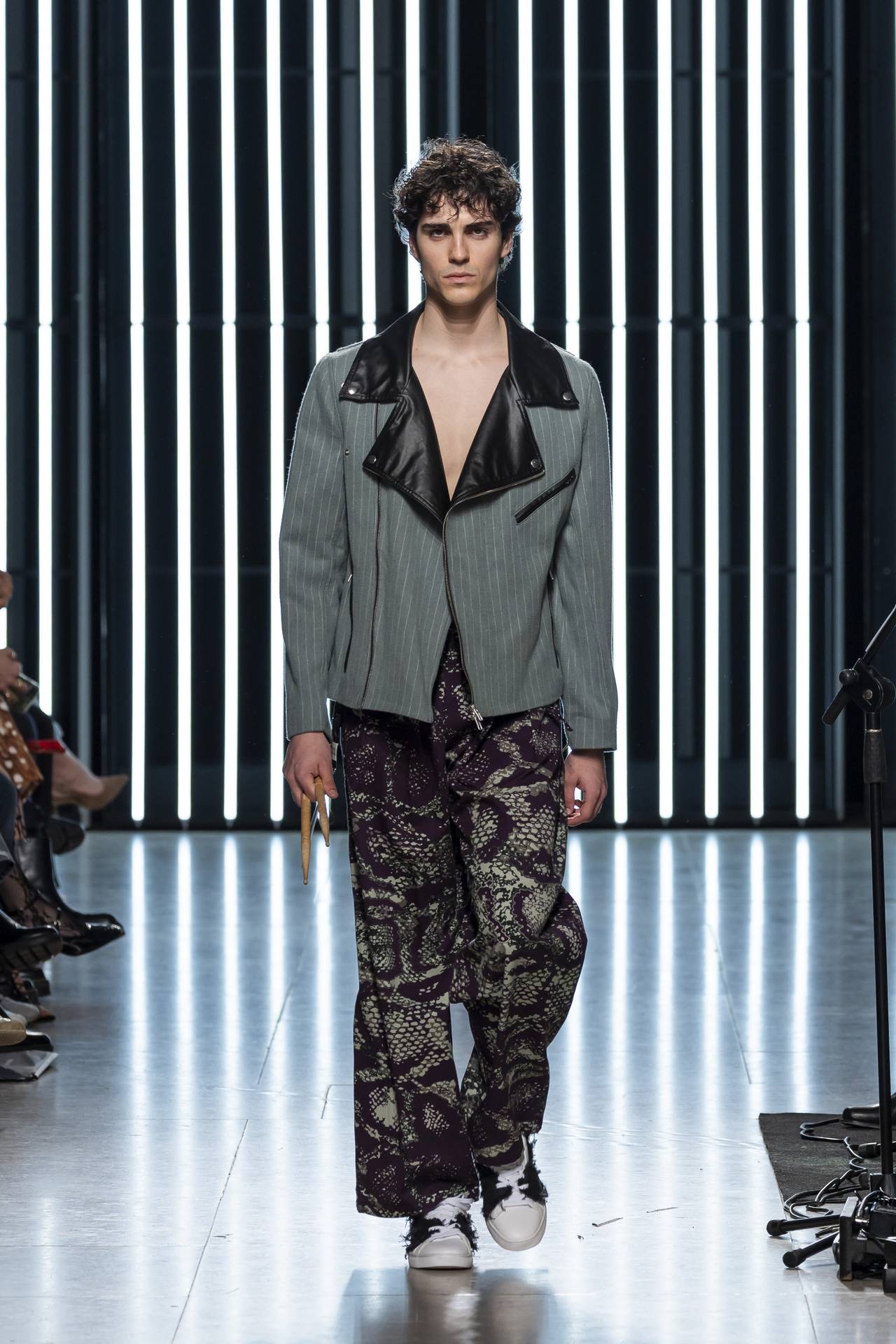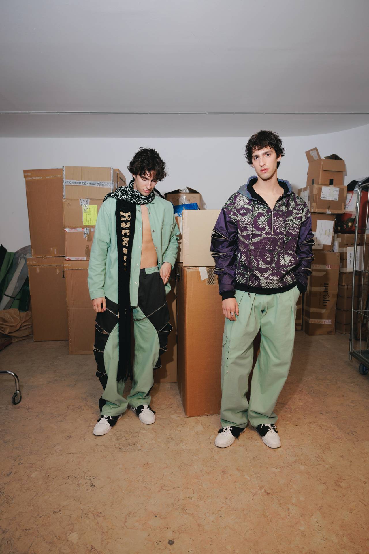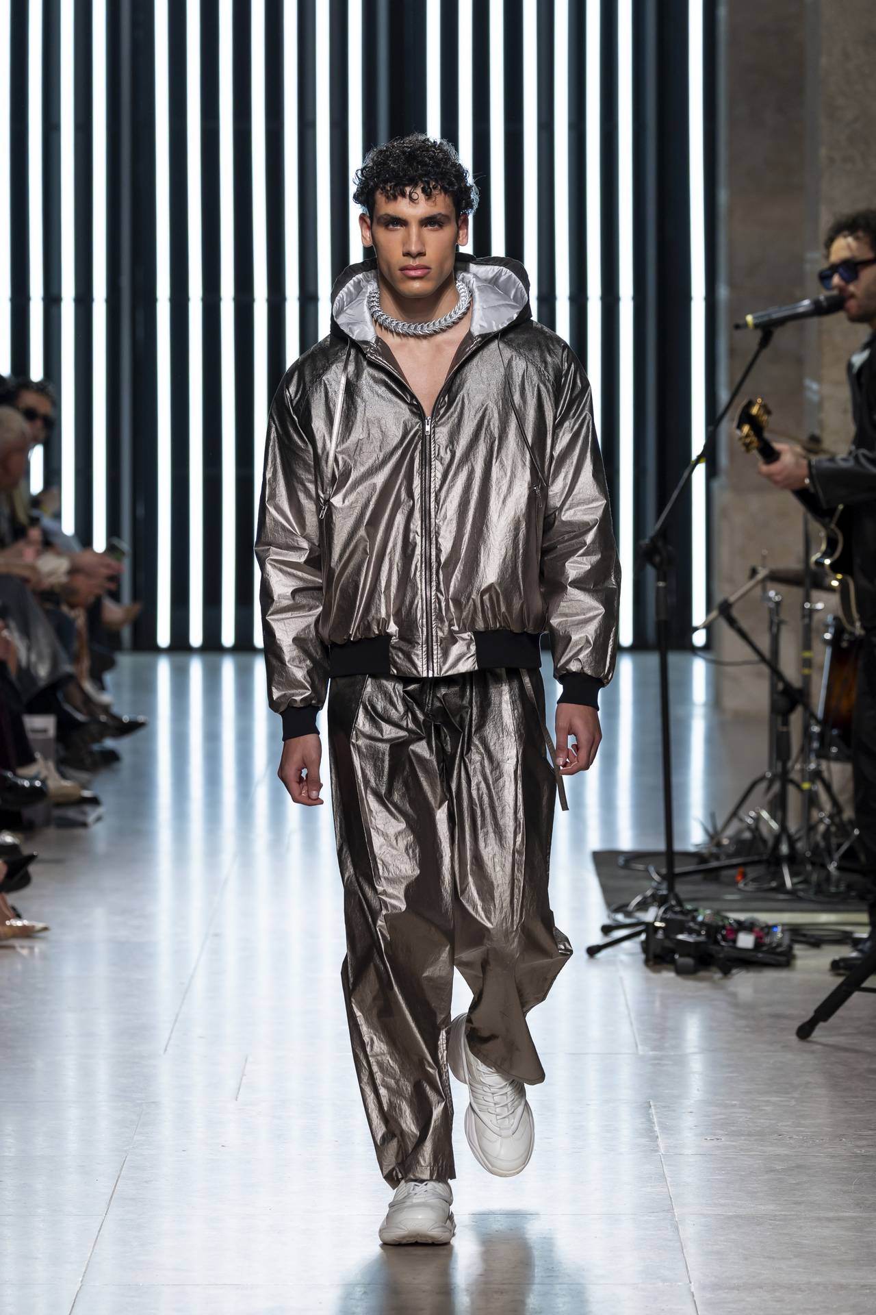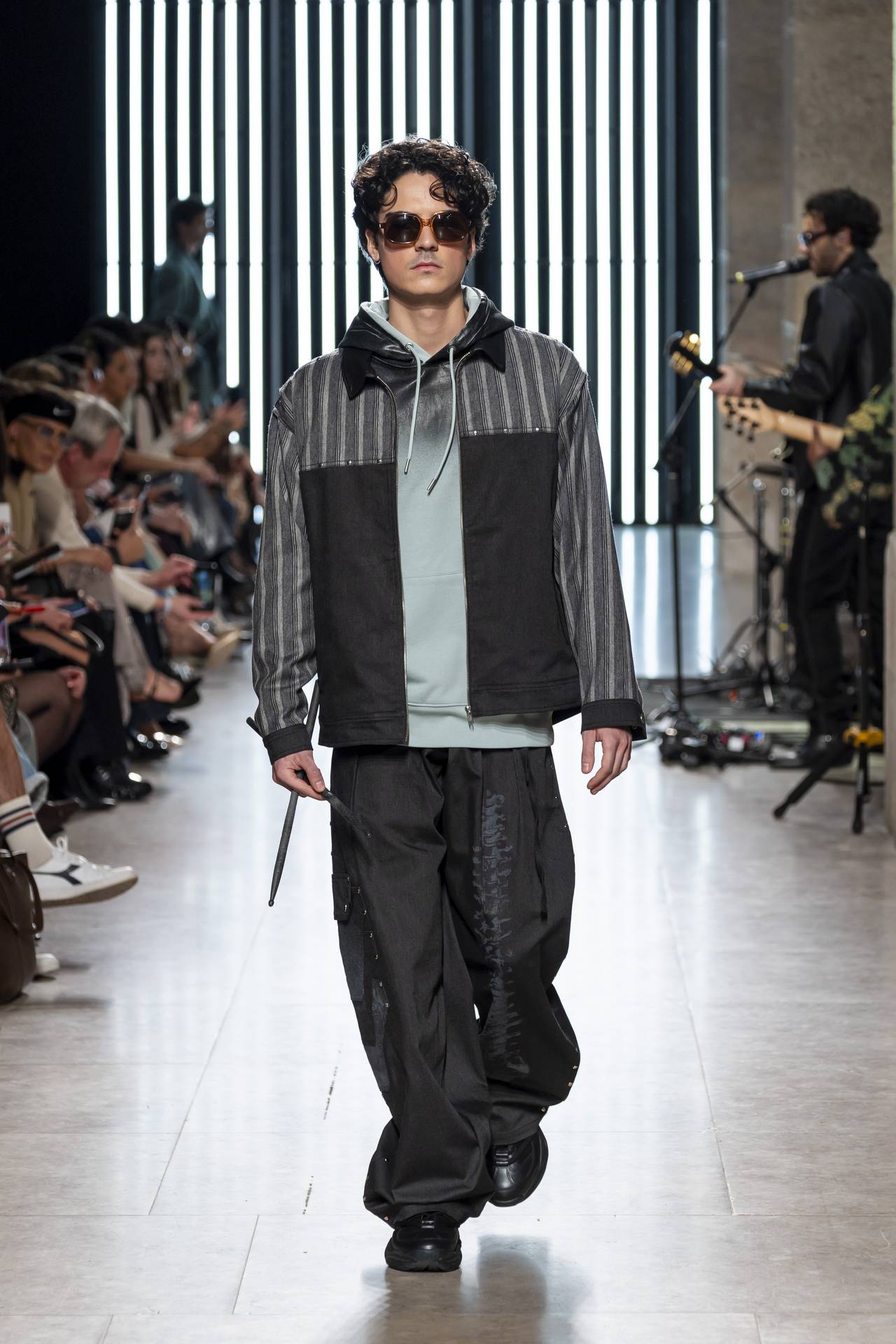 The collection moves through the blacks and greys of asphalt, pierced by the electric distortion of stage purple and light green. Metallic fabrics and details — zippers, snaps and rivets — are combined with notes of whiskey yellow and animal prints, transporting the viewer into the artists’ performative universe. A reflective fabric appears as both a functional and symbolic element, keeping paparazzi at bay.