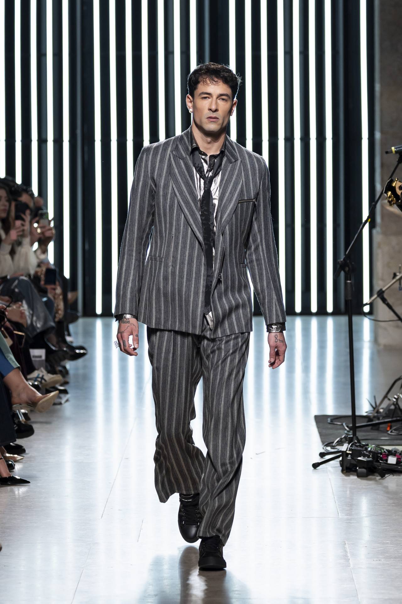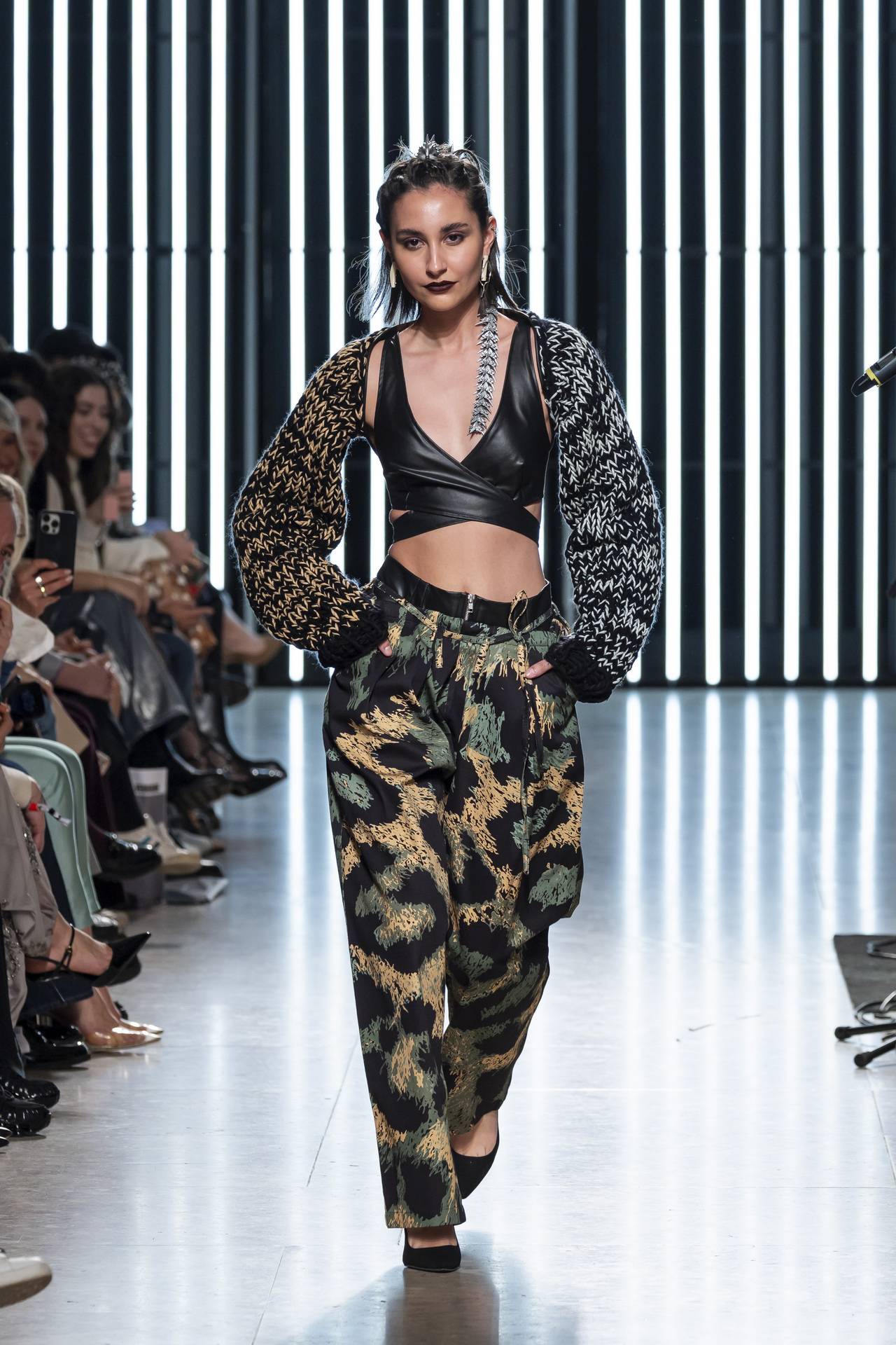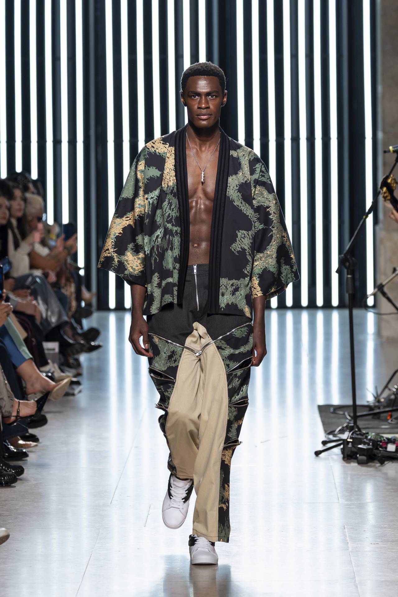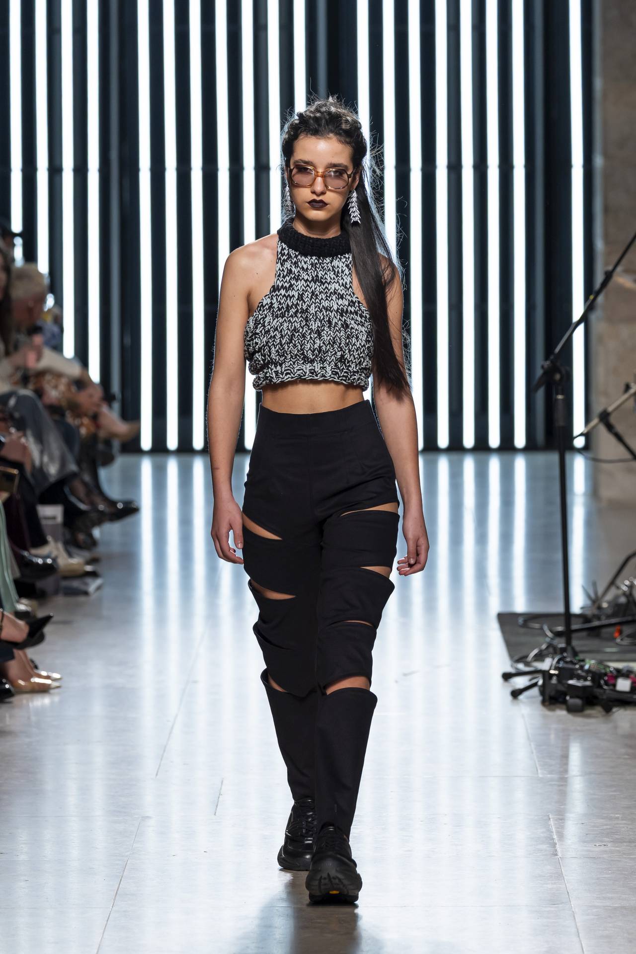 The collection moves through the blacks and greys of asphalt, pierced by the electric distortion of stage purple and light green. Metallic fabrics and details — zippers, snaps and rivets — are combined with notes of whiskey yellow and animal prints, transporting the viewer into the artists’ performative universe. A reflective fabric appears as both a functional and symbolic element, keeping paparazzi at bay.