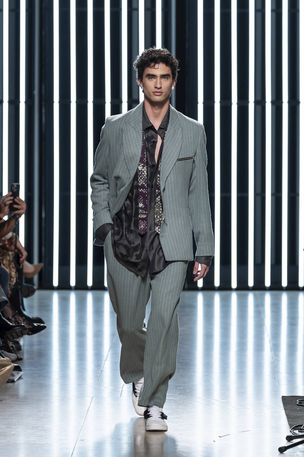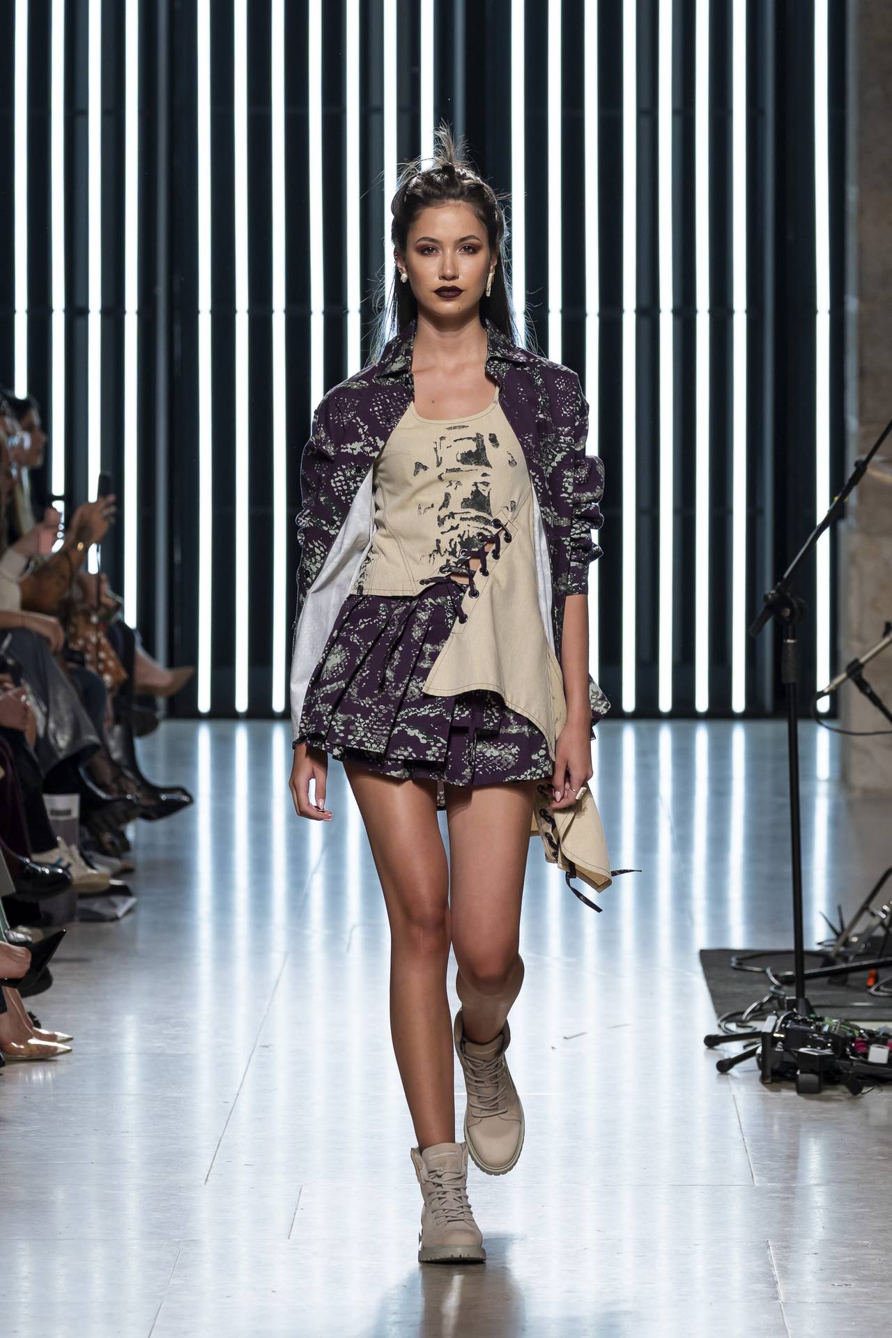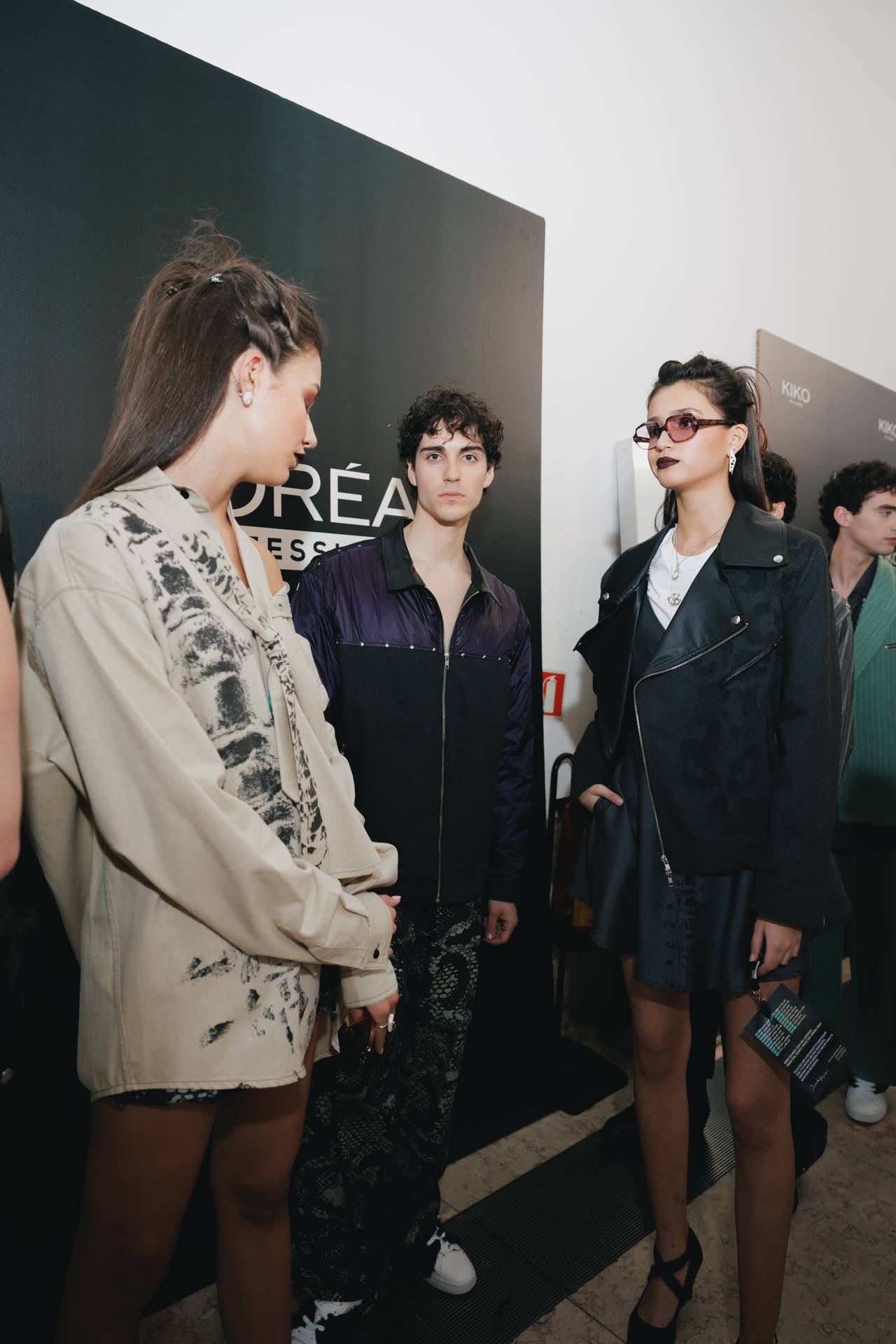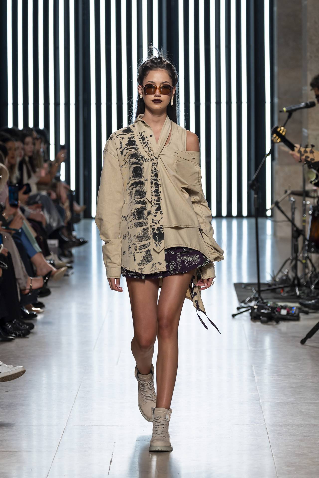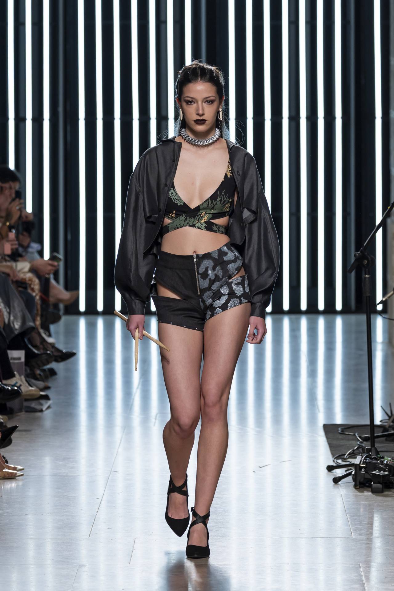 The collection moves through the blacks and greys of asphalt, pierced by the electric distortion of stage purple and light green. Metallic fabrics and details — zippers, snaps and rivets — are combined with notes of whiskey yellow and animal prints, transporting the viewer into the artists’ performative universe. A reflective fabric appears as both a functional and symbolic element, keeping paparazzi at bay.