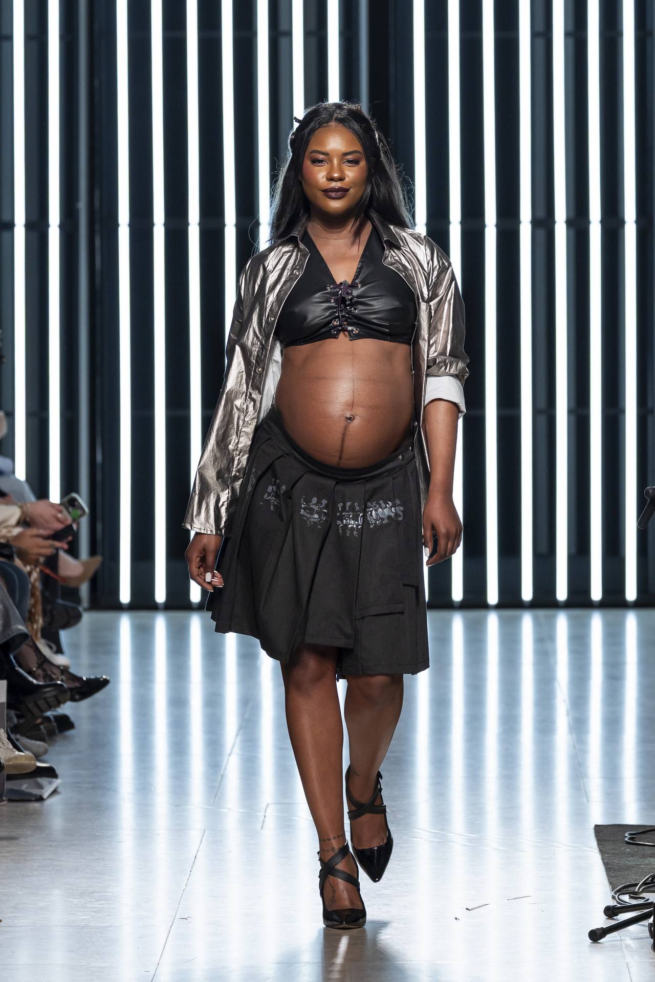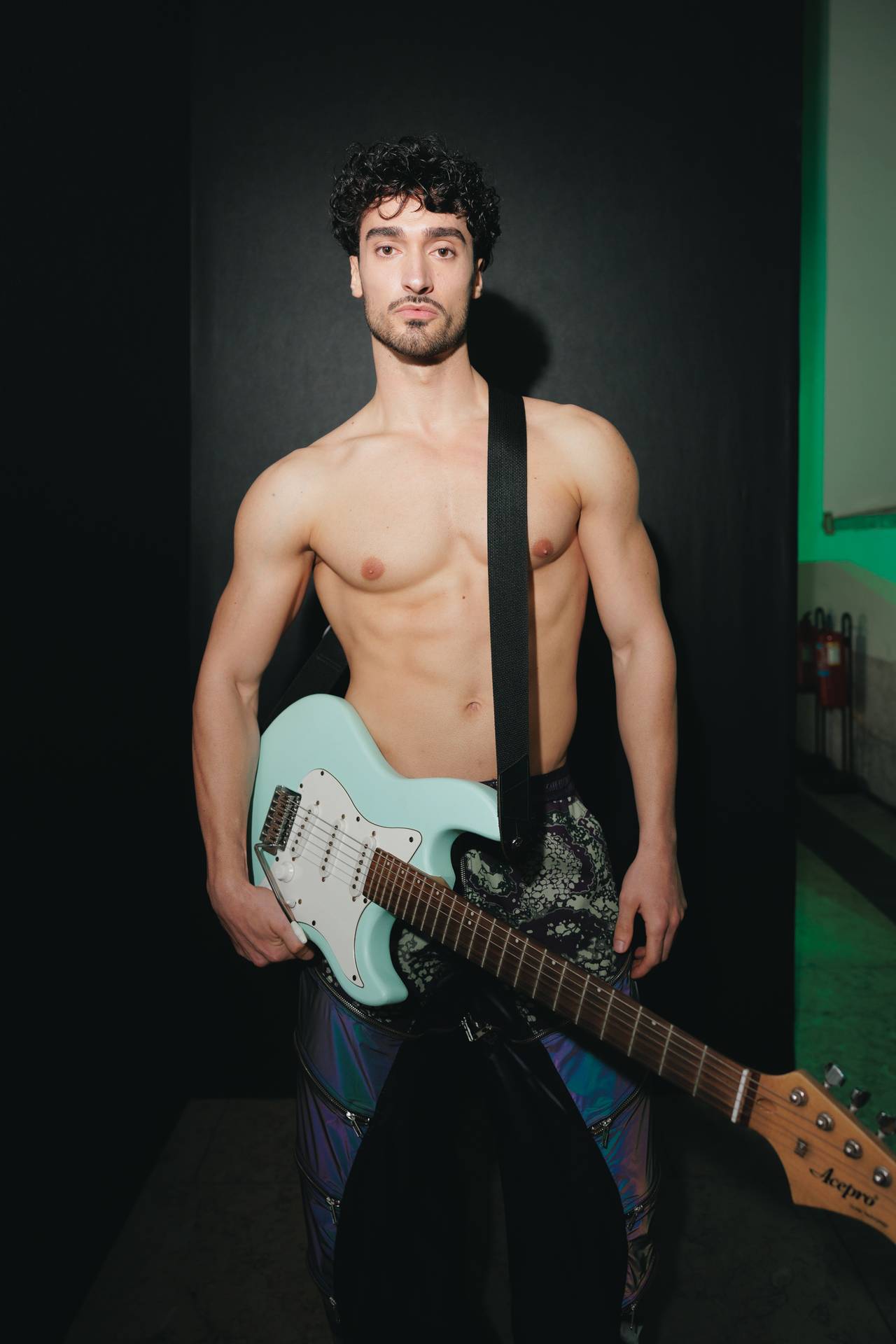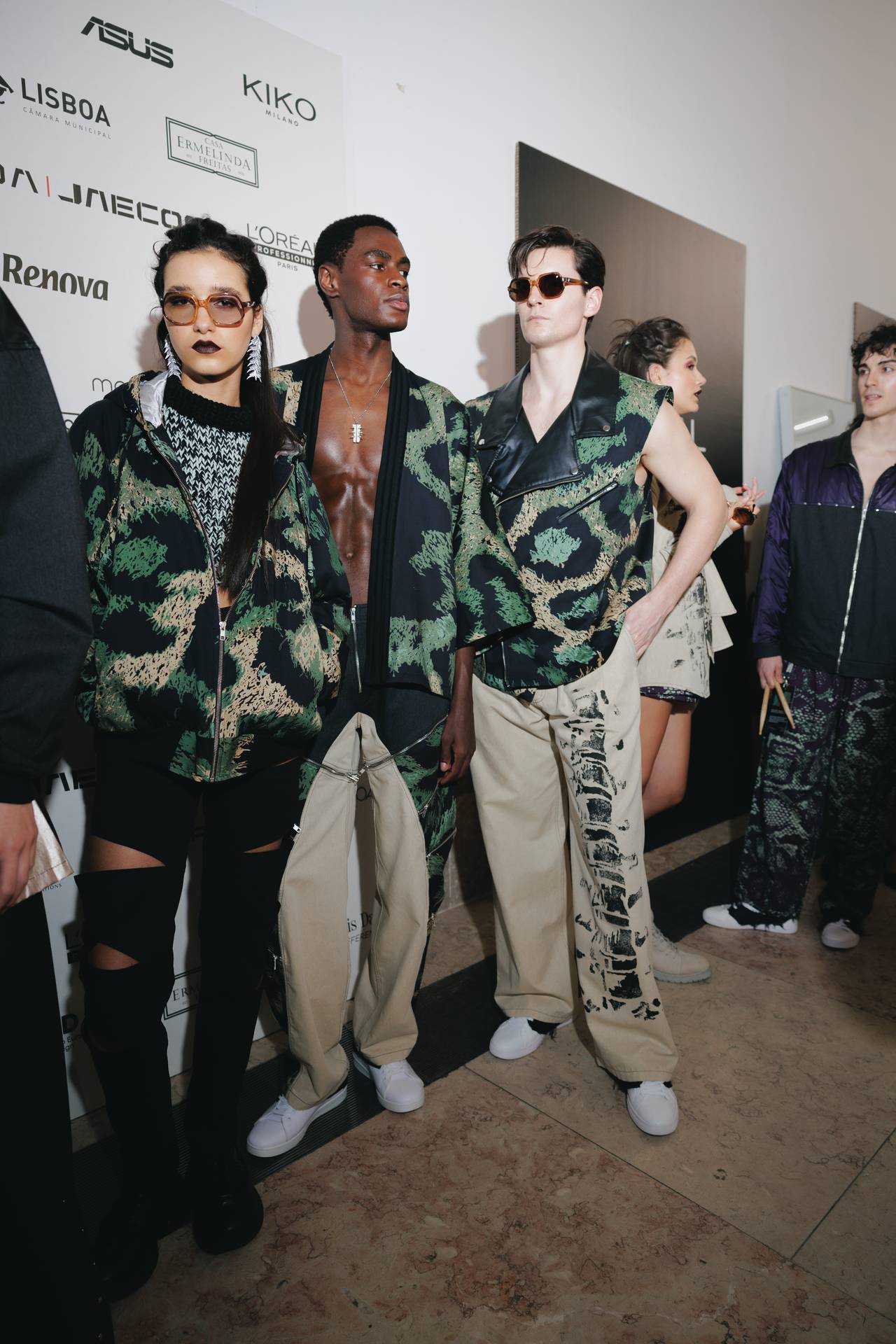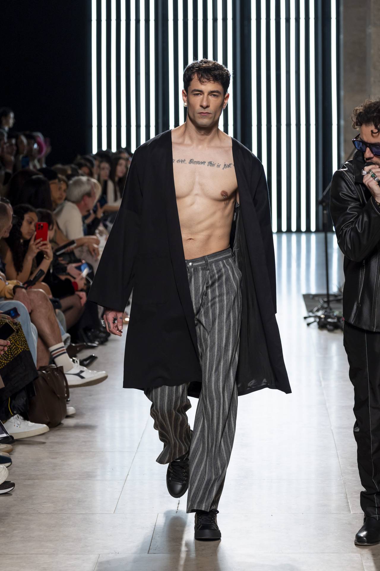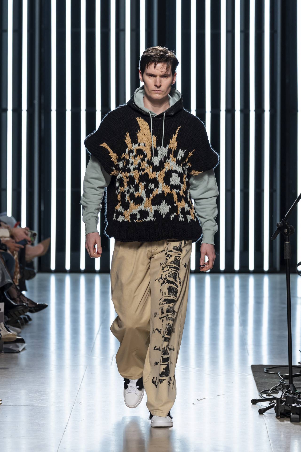 The collection moves through the blacks and greys of asphalt, pierced by the electric distortion of stage purple and light green. Metallic fabrics and details — zippers, snaps and rivets — are combined with notes of whiskey yellow and animal prints, transporting the viewer into the artists’ performative universe. A reflective fabric appears as both a functional and symbolic element, keeping paparazzi at bay.