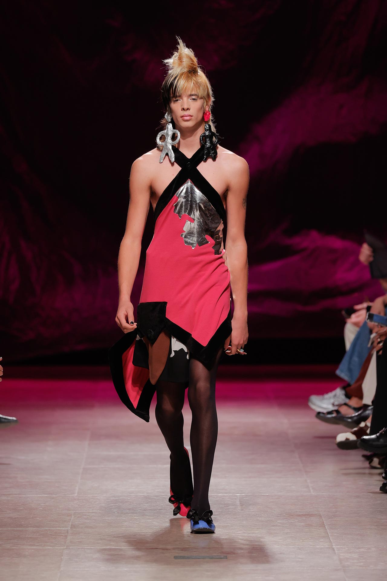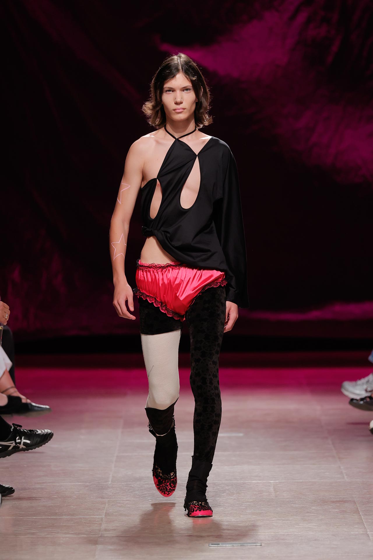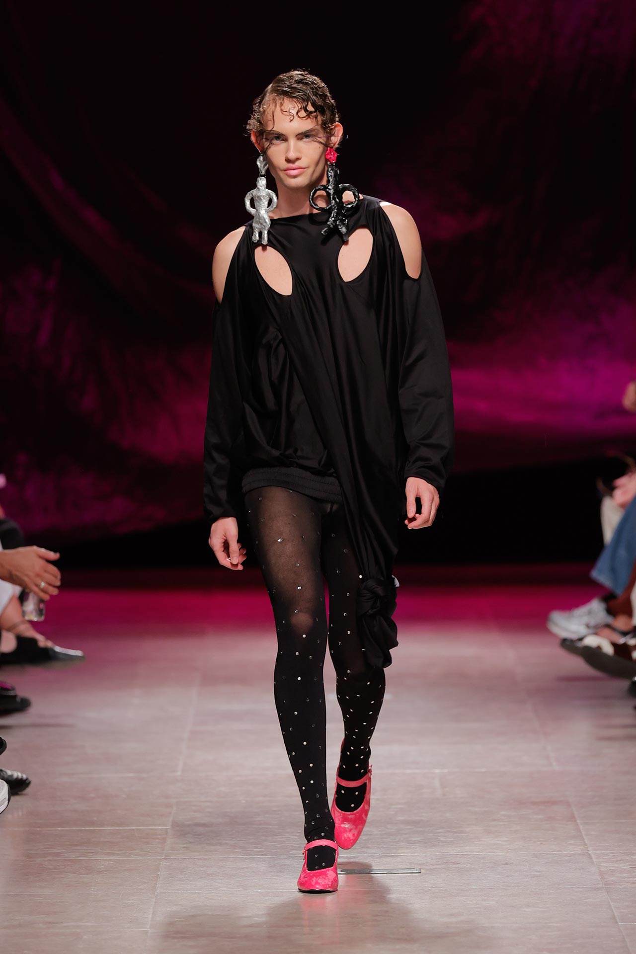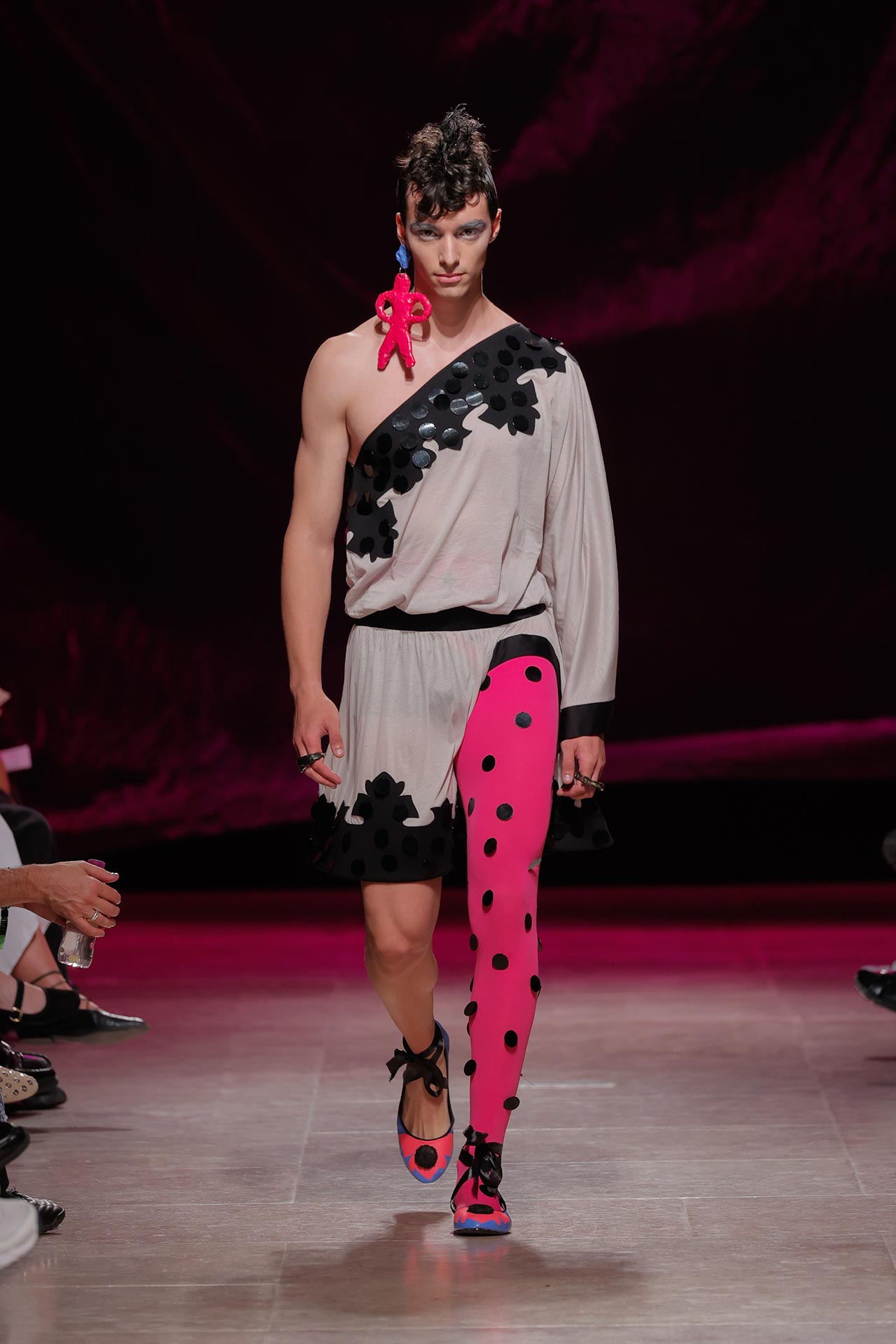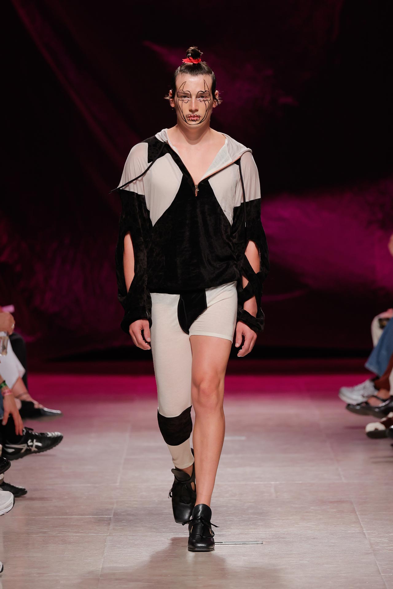 As silhuetas sedutoras foram alcançadas através de técnicas contrastantes, onde malhas leves se combinam com malhas pesadas, criando tensão e movimento intencionais. A dualidade na paleta de cores — rosa e azul, preto e branco — também a expressa. PERLIMPIMPIM manifesta um espaço de expressão criativa, convidando quem veste a participar na conversa.