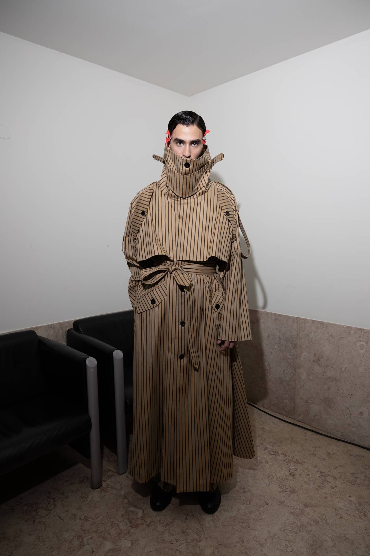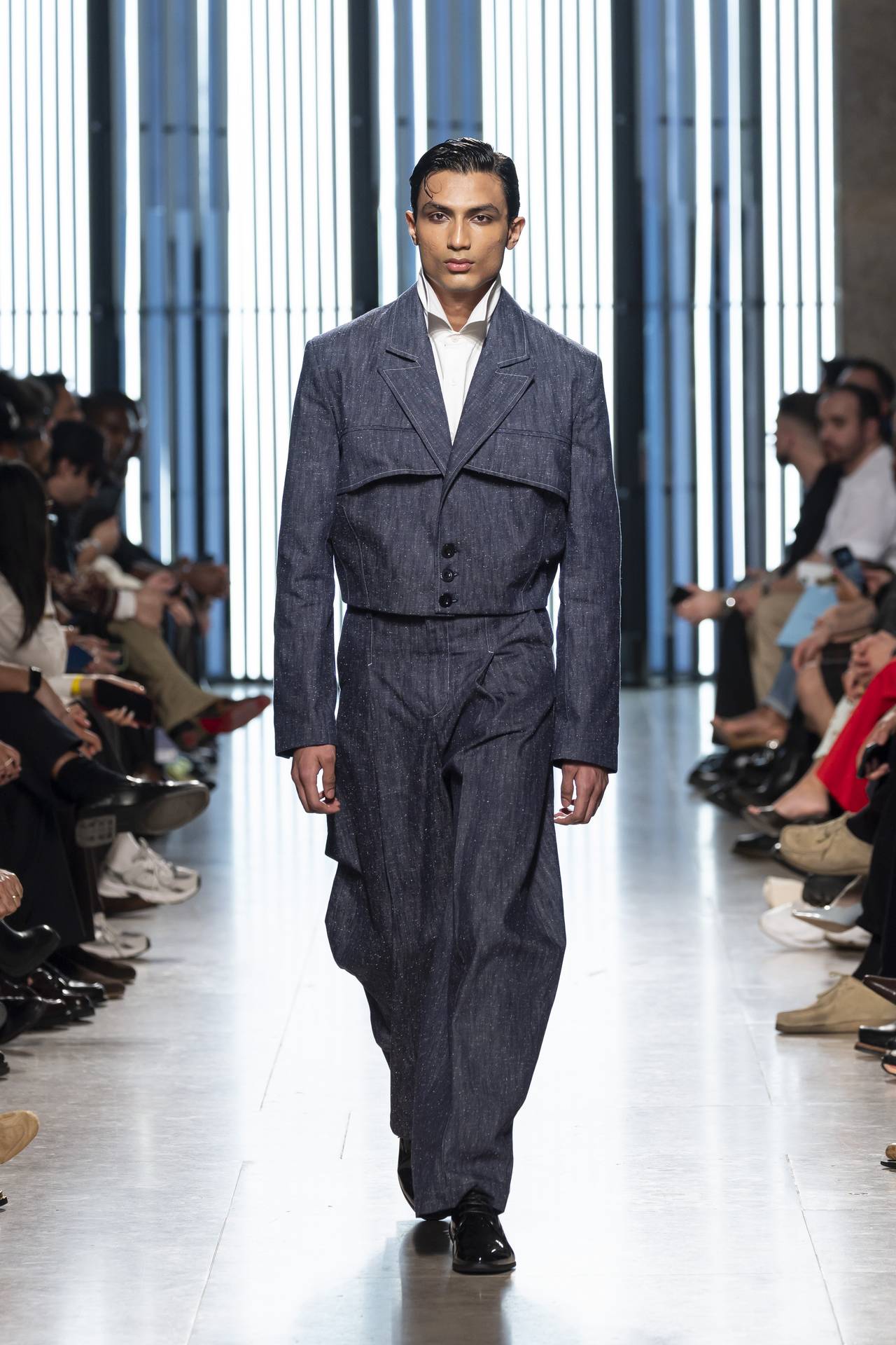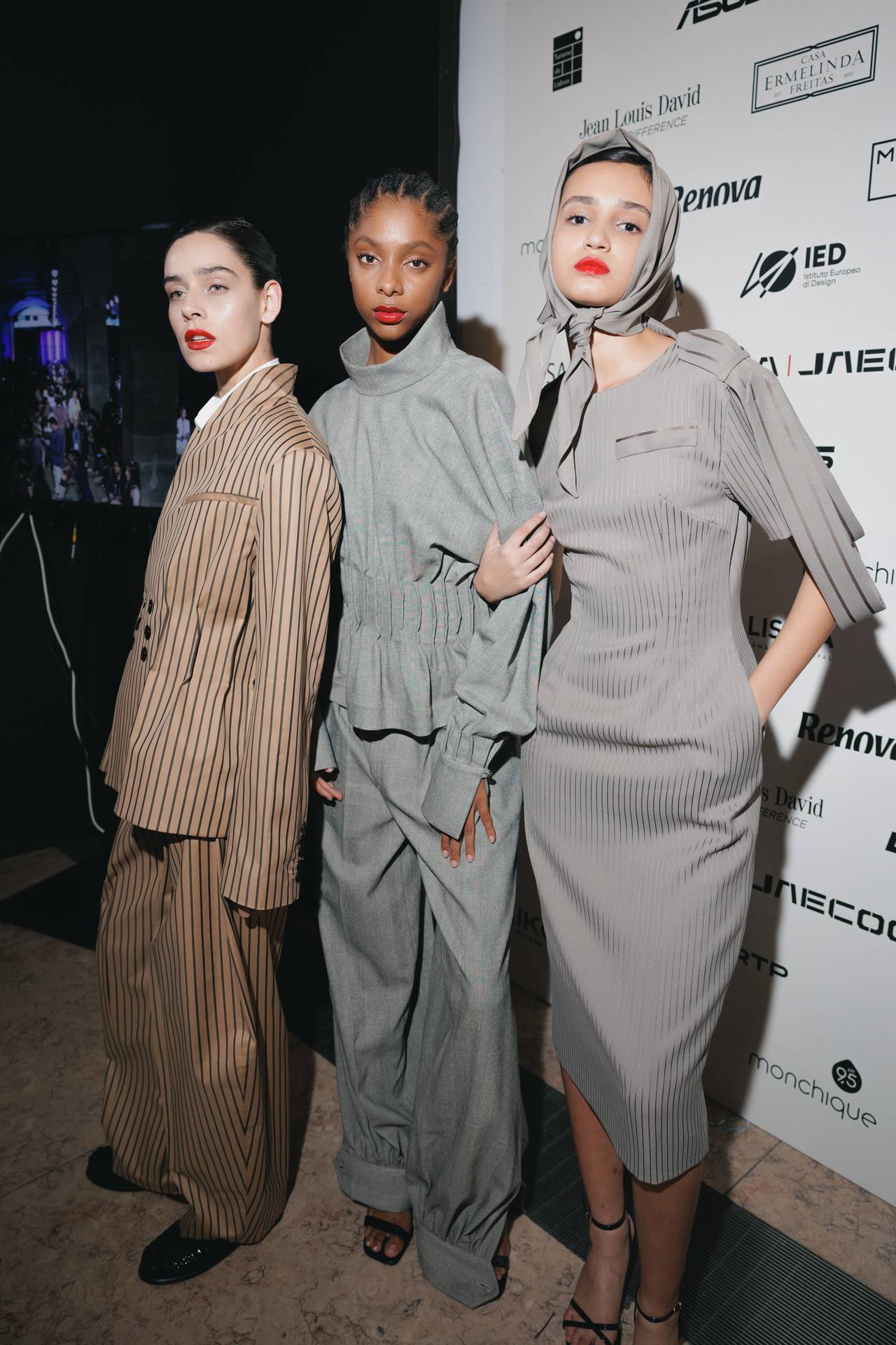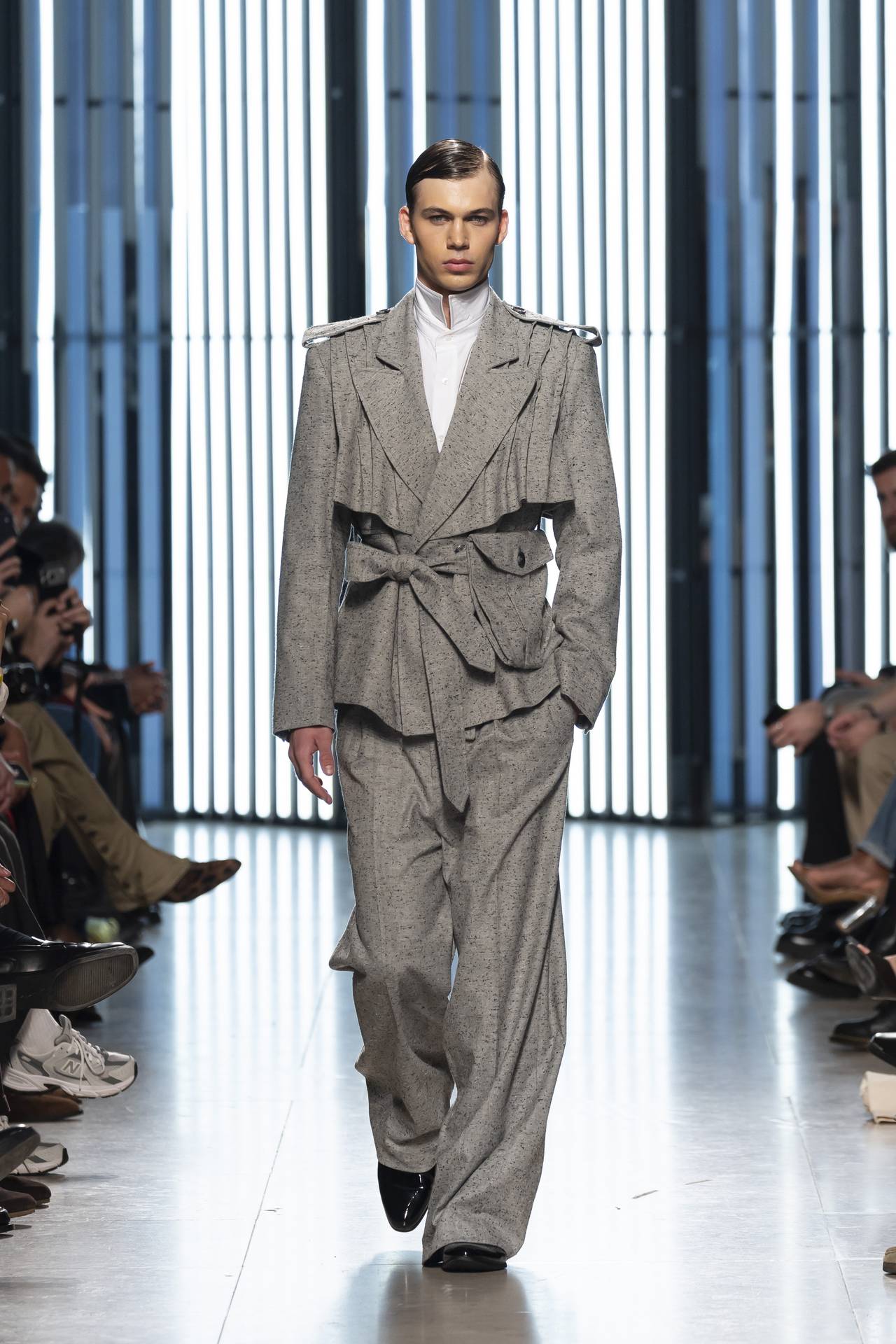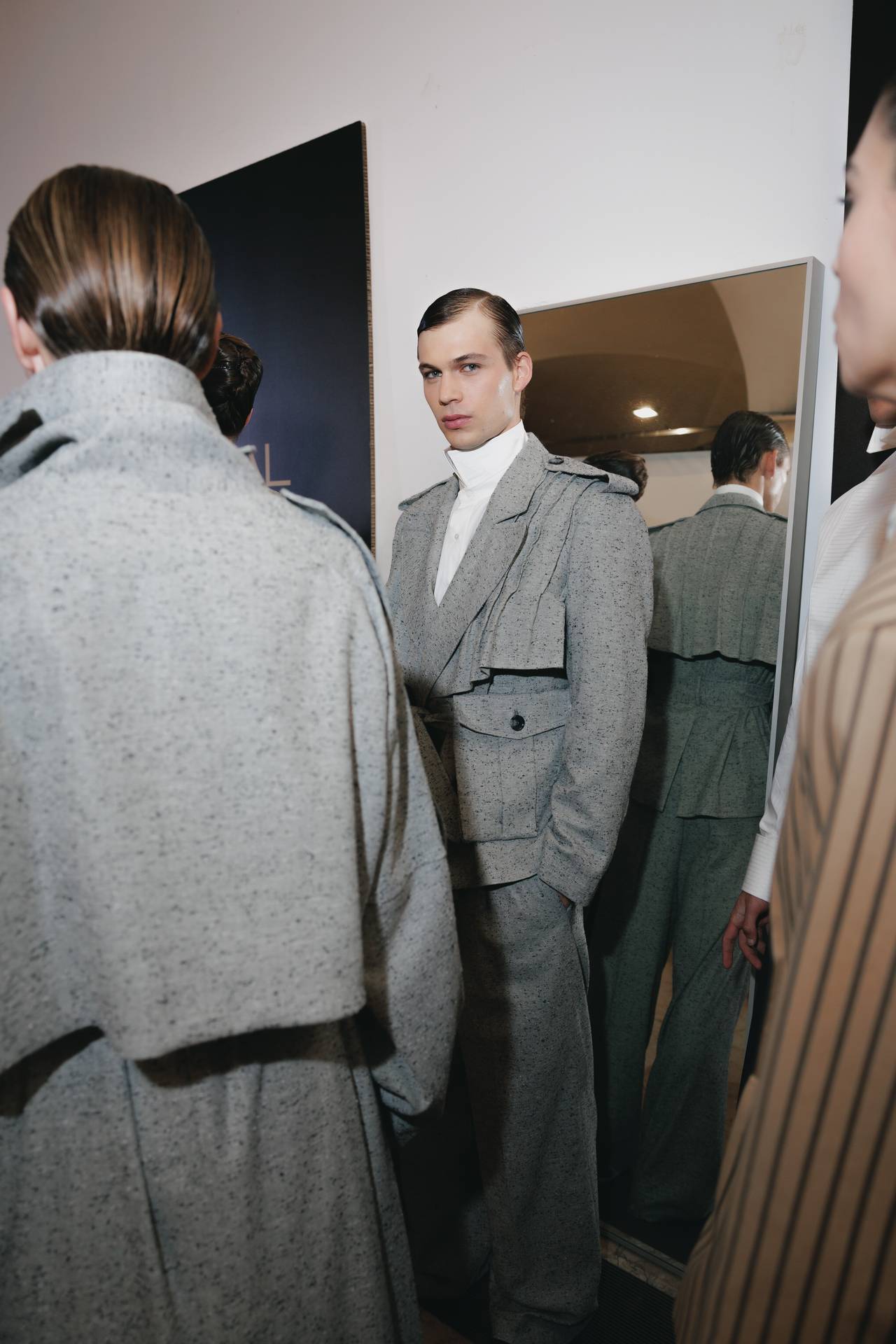 A materialidade assenta na tradição da alfaiataria e em sarjas intemporais, enquanto jacquards de superfície enrugada emergem como metáforas táteis — tecidos com memória própria, marcados por uma beleza vivida, quase herdada. A paleta cromática reflete esta nostalgia serena: uma base de tons cinzentos e preto, complementada por bege e branco, cria um silêncio visual interrompido apenas pelo vermelho-sangue, intenso e pulsante, lembrando que toda a memória é também emoção.