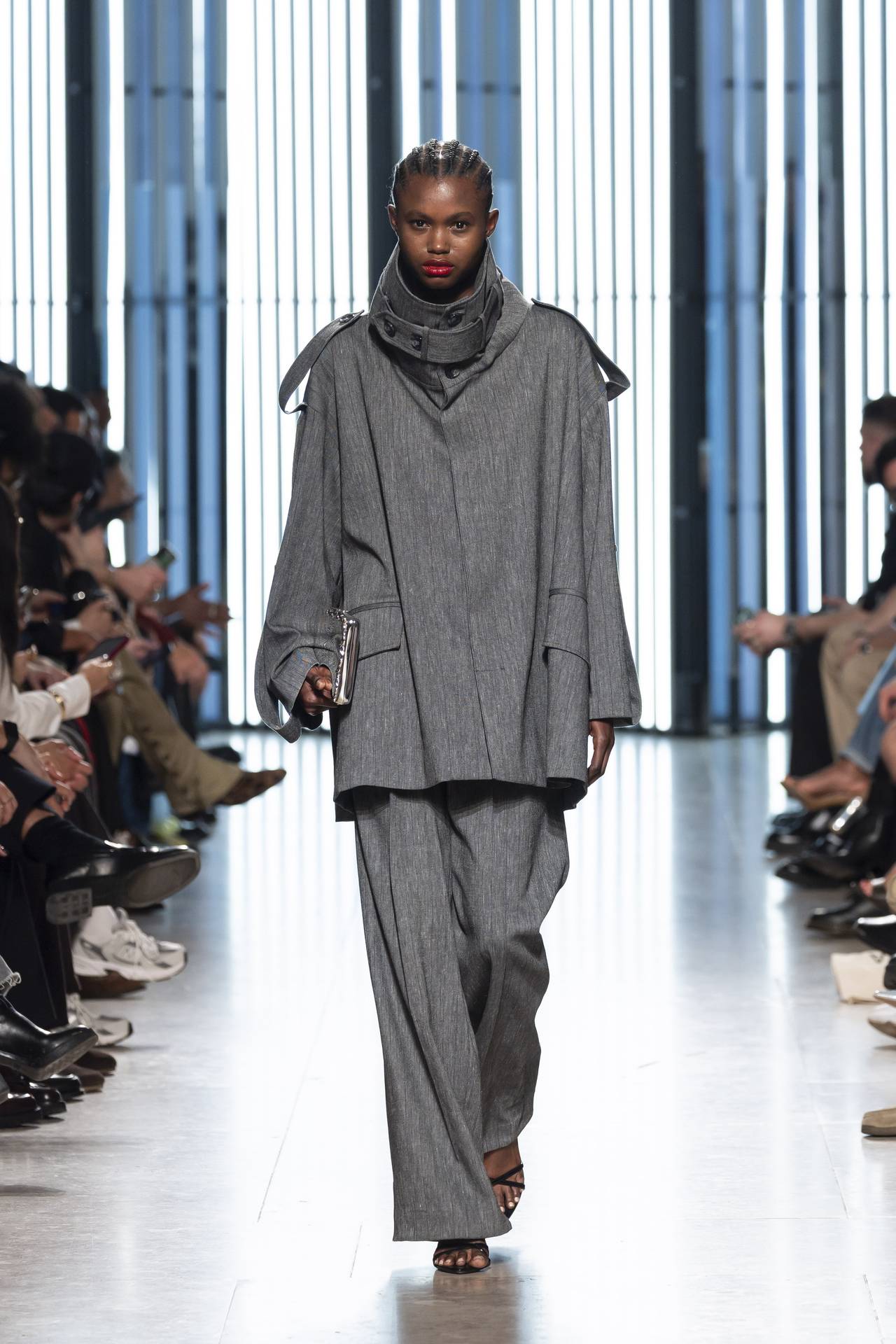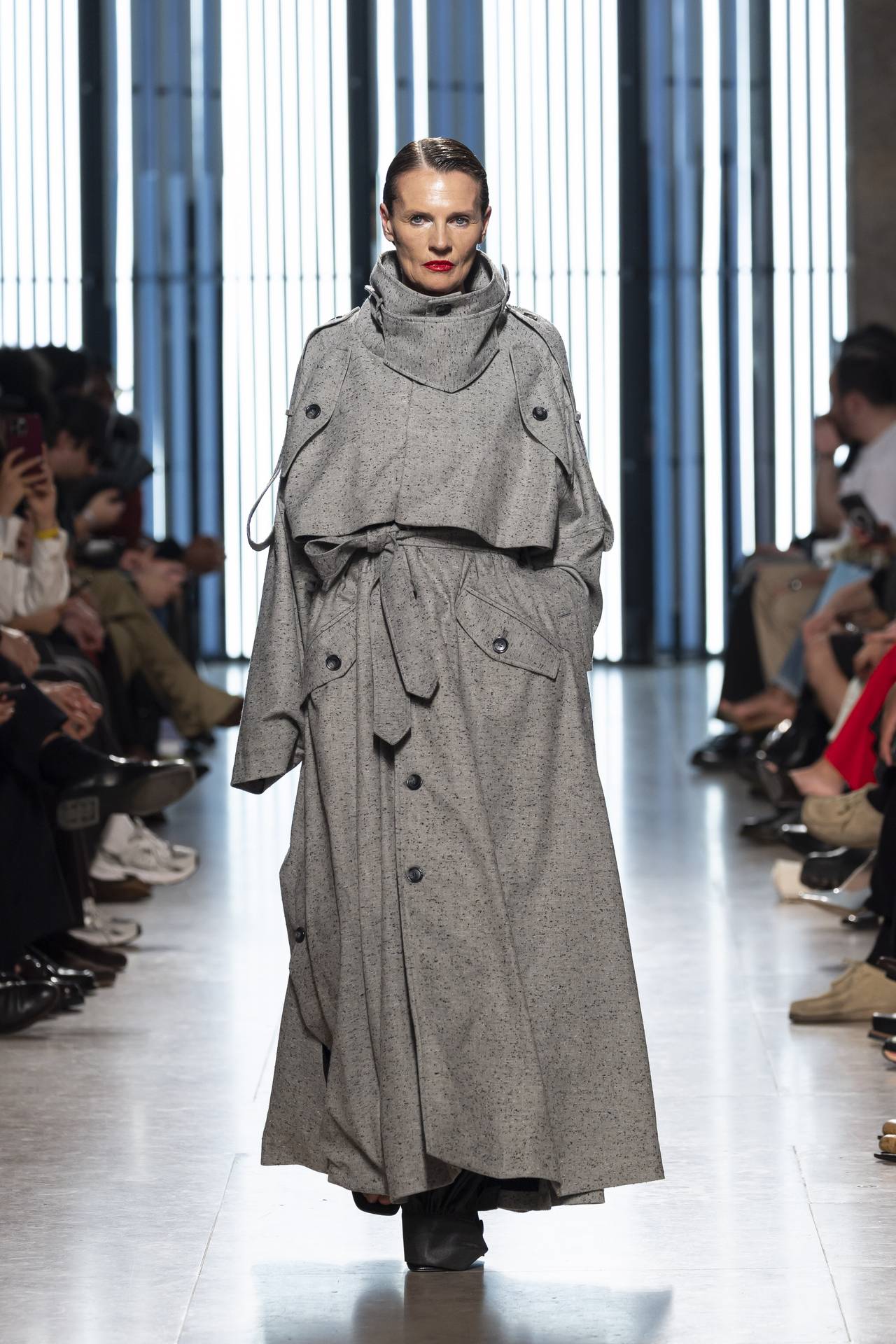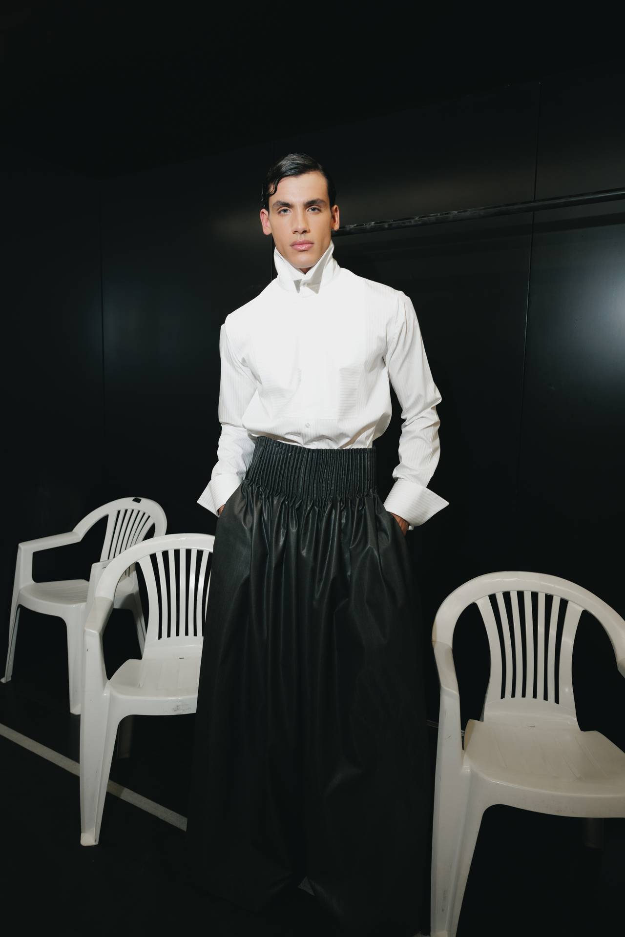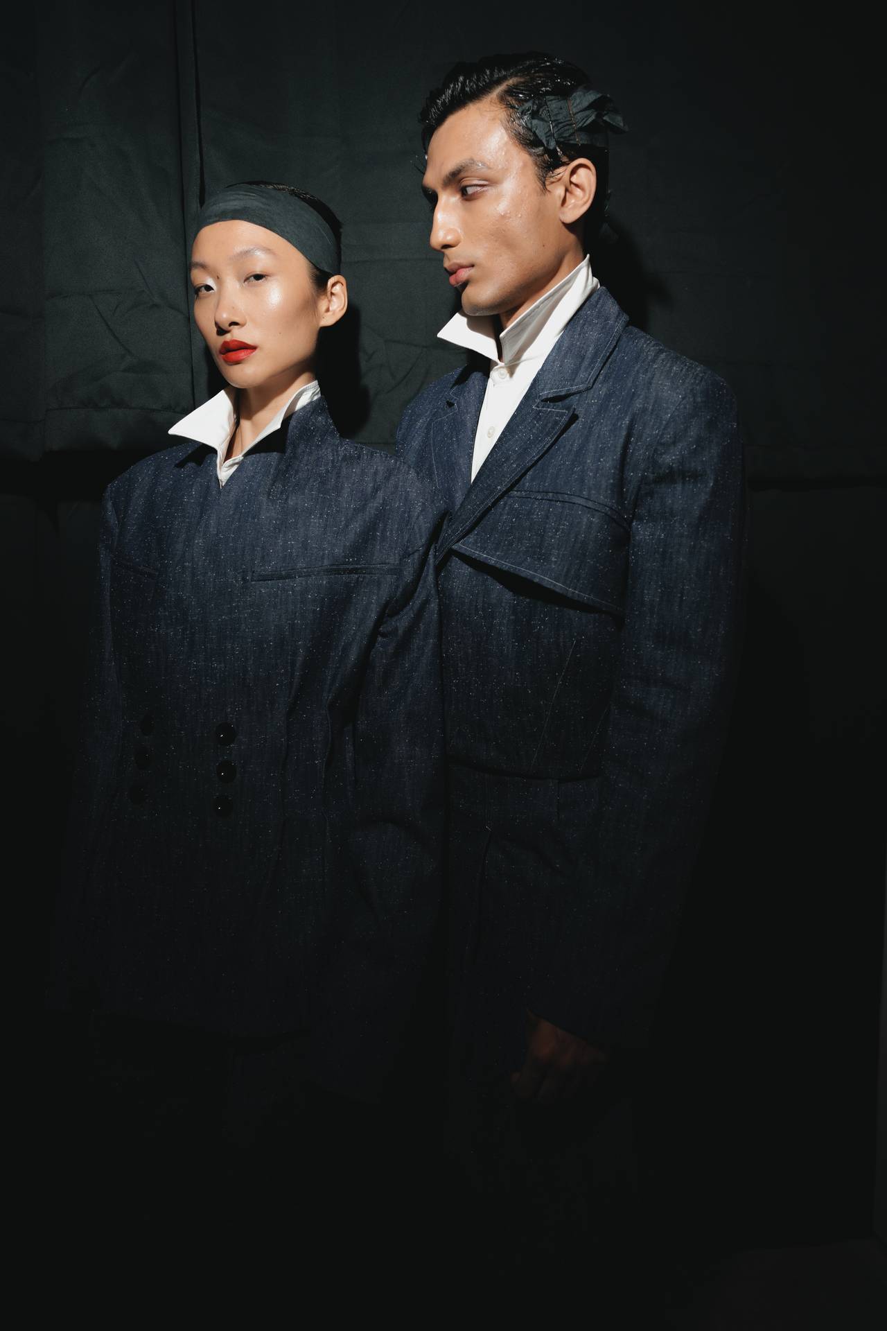A materialidade assenta na tradição da alfaiataria e em sarjas intemporais, enquanto jacquards de superfície enrugada emergem como metáforas táteis — tecidos com memória própria, marcados por uma beleza vivida, quase herdada. A paleta cromática reflete esta nostalgia serena: uma base de tons cinzentos e preto, complementada por bege e branco, cria um silêncio visual interrompido apenas pelo vermelho-sangue, intenso e pulsante, lembrando que toda a memória é também emoção.