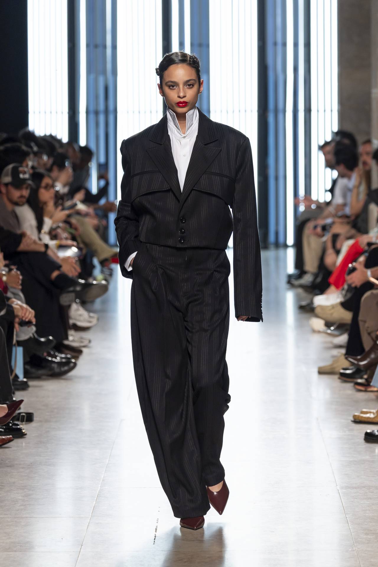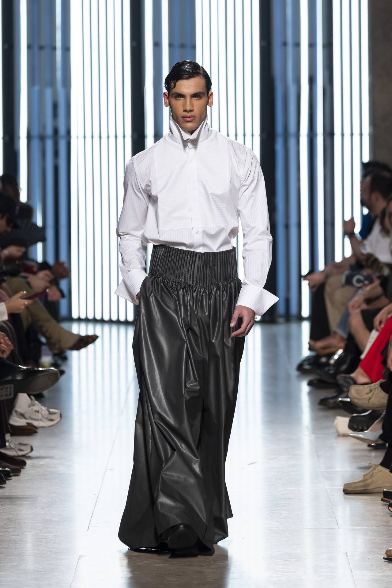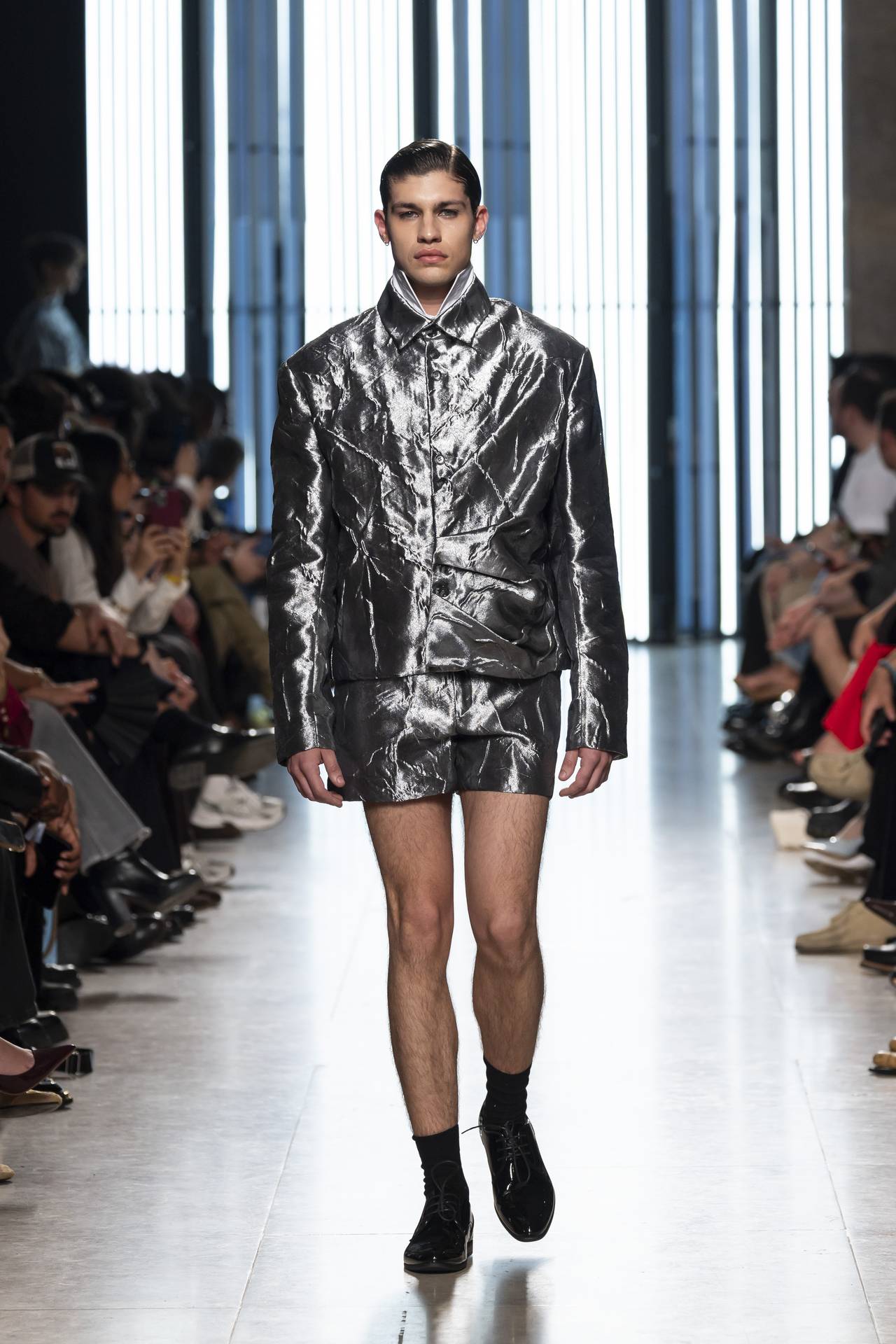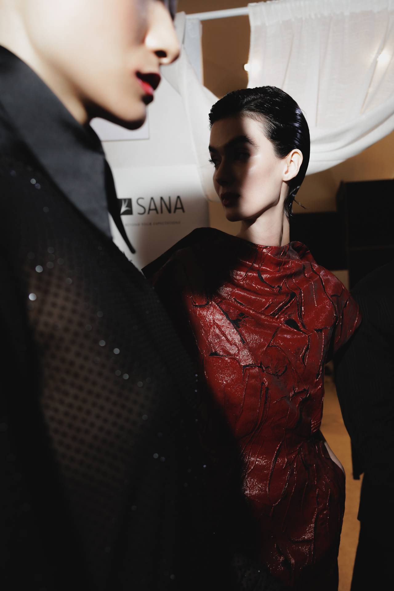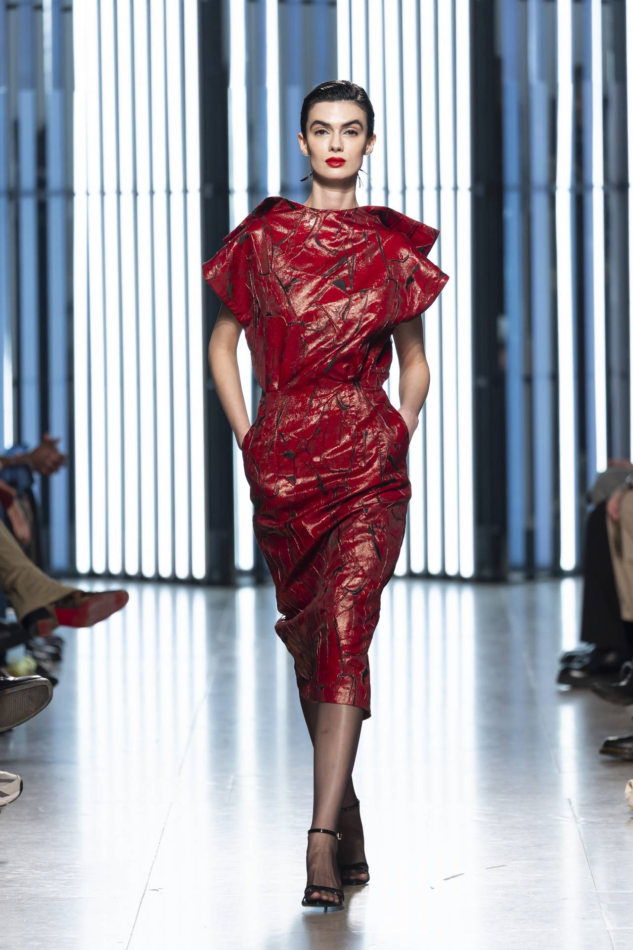 A materialidade assenta na tradição da alfaiataria e em sarjas intemporais, enquanto jacquards de superfície enrugada emergem como metáforas táteis — tecidos com memória própria, marcados por uma beleza vivida, quase herdada. A paleta cromática reflete esta nostalgia serena: uma base de tons cinzentos e preto, complementada por bege e branco, cria um silêncio visual interrompido apenas pelo vermelho-sangue, intenso e pulsante, lembrando que toda a memória é também emoção.
