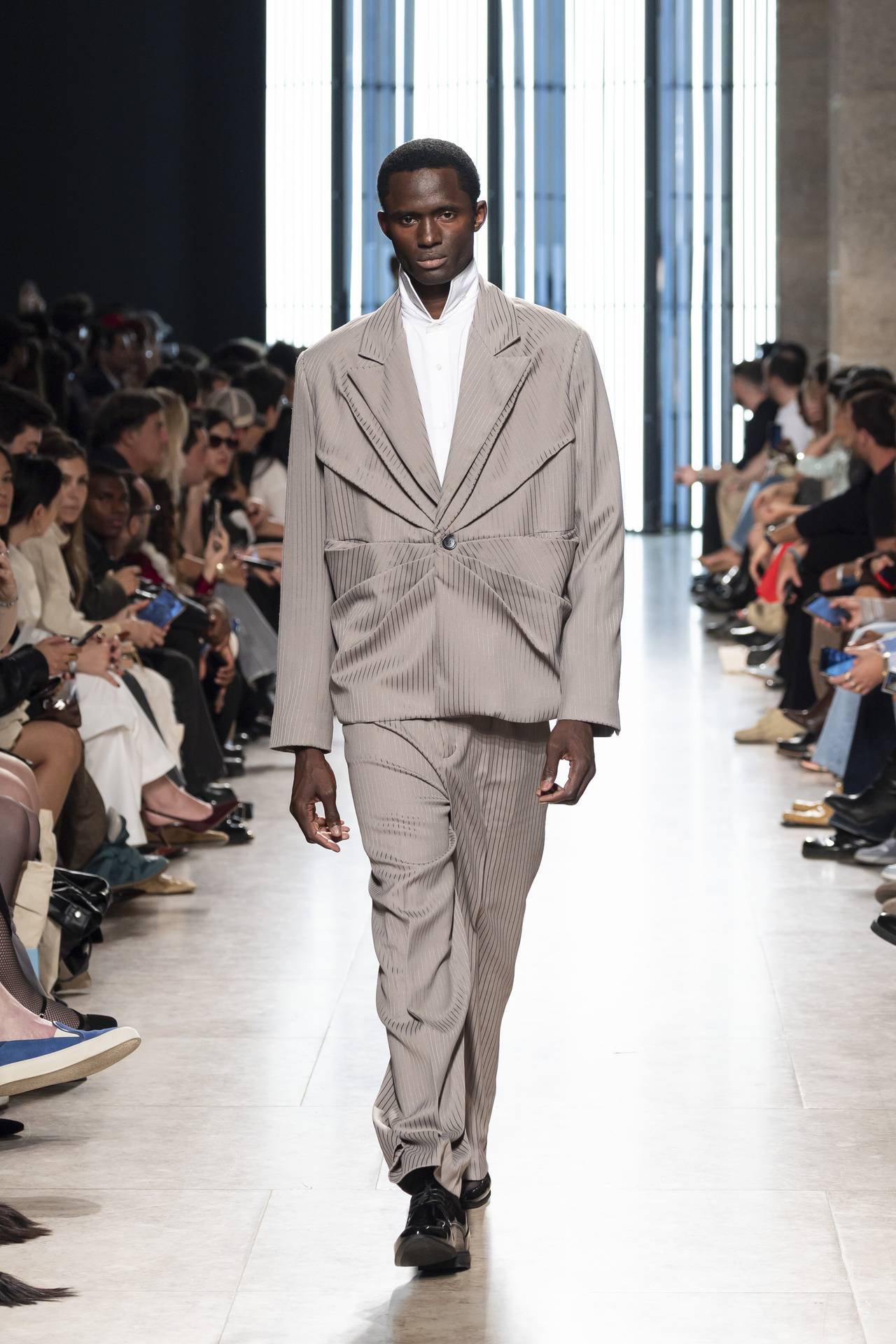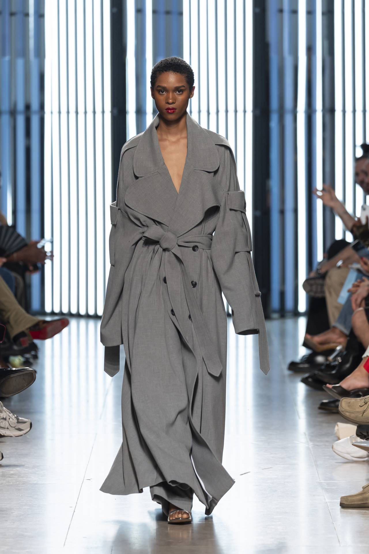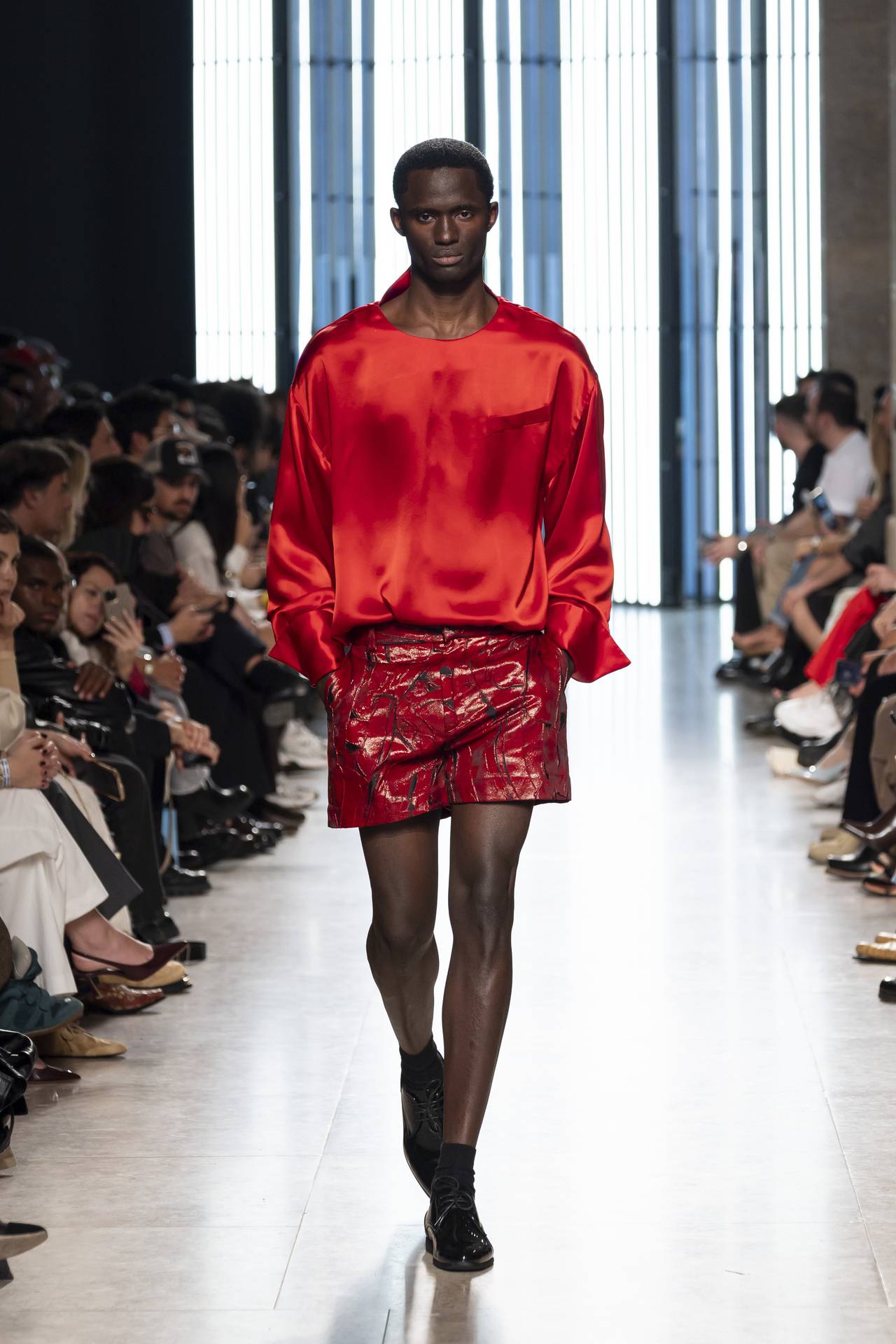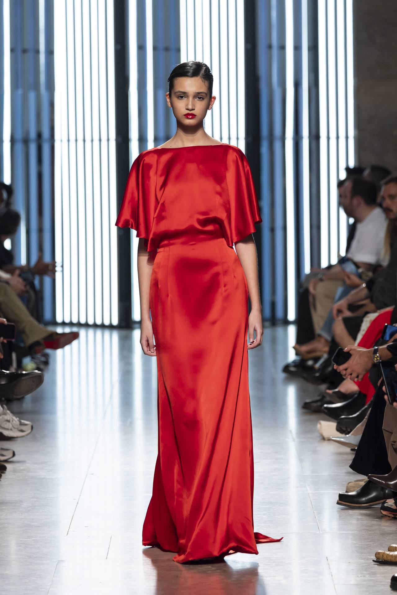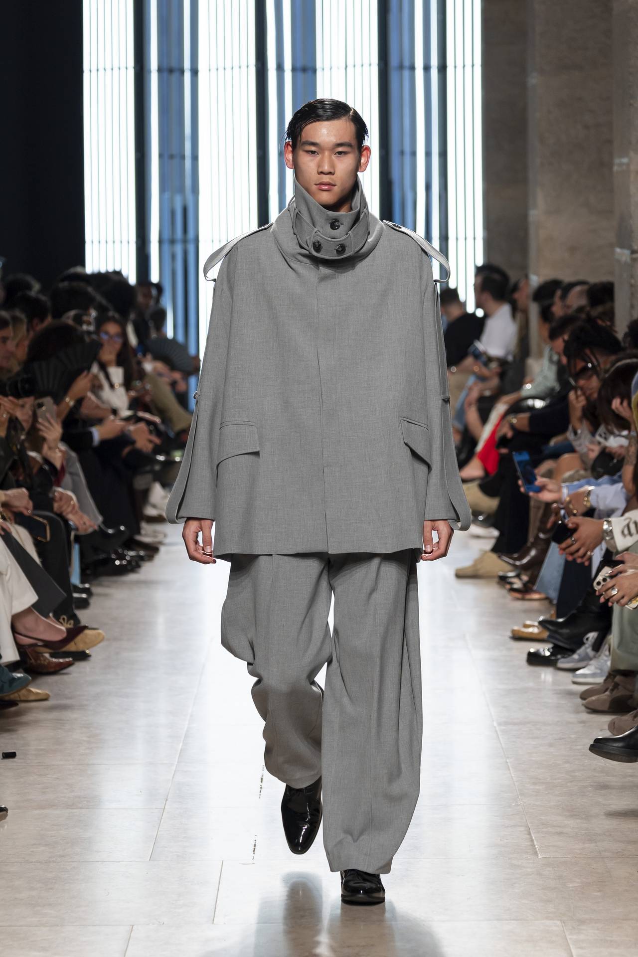 A materialidade assenta na tradição da alfaiataria e em sarjas intemporais, enquanto jacquards de superfície enrugada emergem como metáforas táteis — tecidos com memória própria, marcados por uma beleza vivida, quase herdada. A paleta cromática reflete esta nostalgia serena: uma base de tons cinzentos e preto, complementada por bege e branco, cria um silêncio visual interrompido apenas pelo vermelho-sangue, intenso e pulsante, lembrando que toda a memória é também emoção.