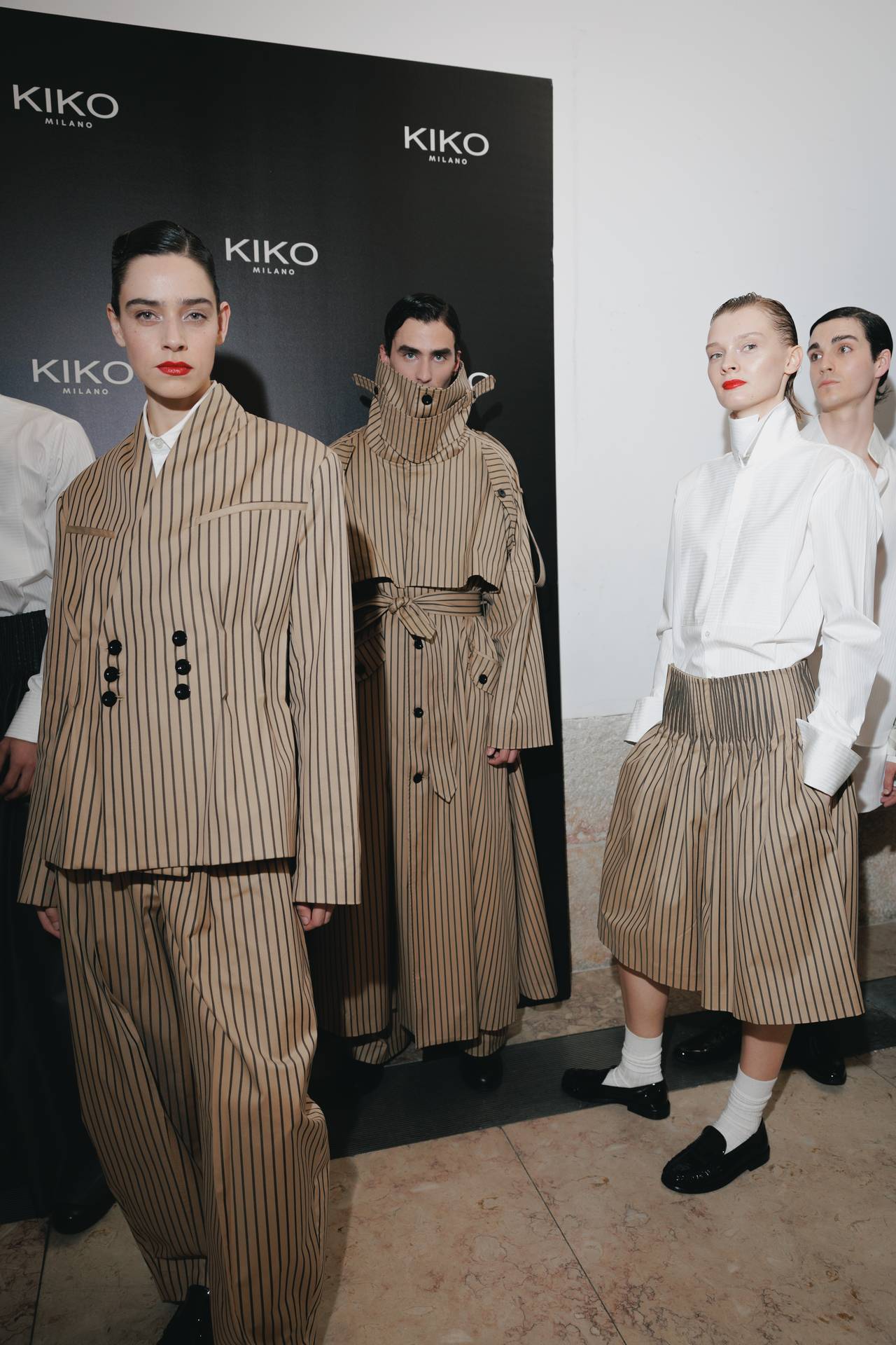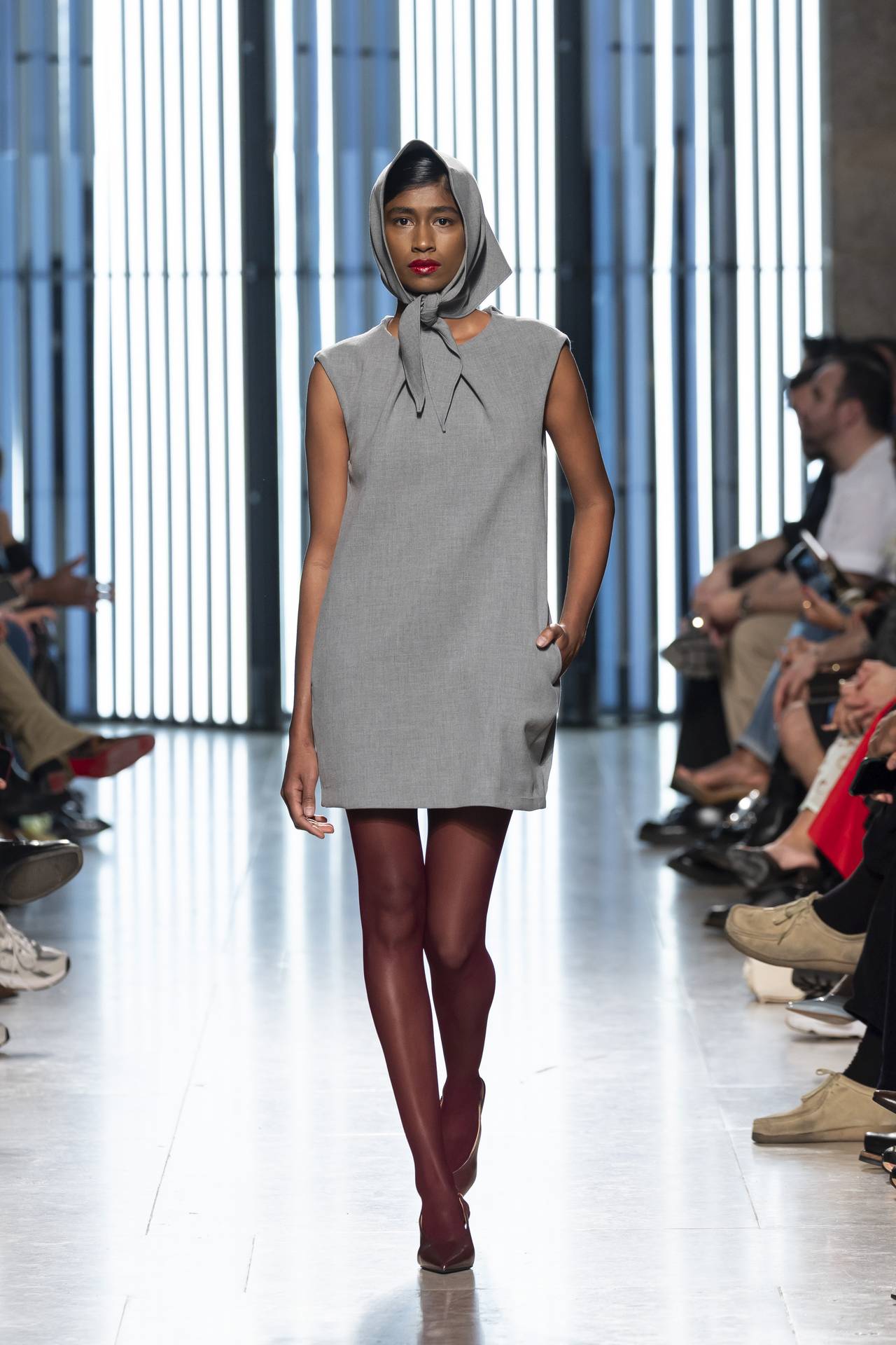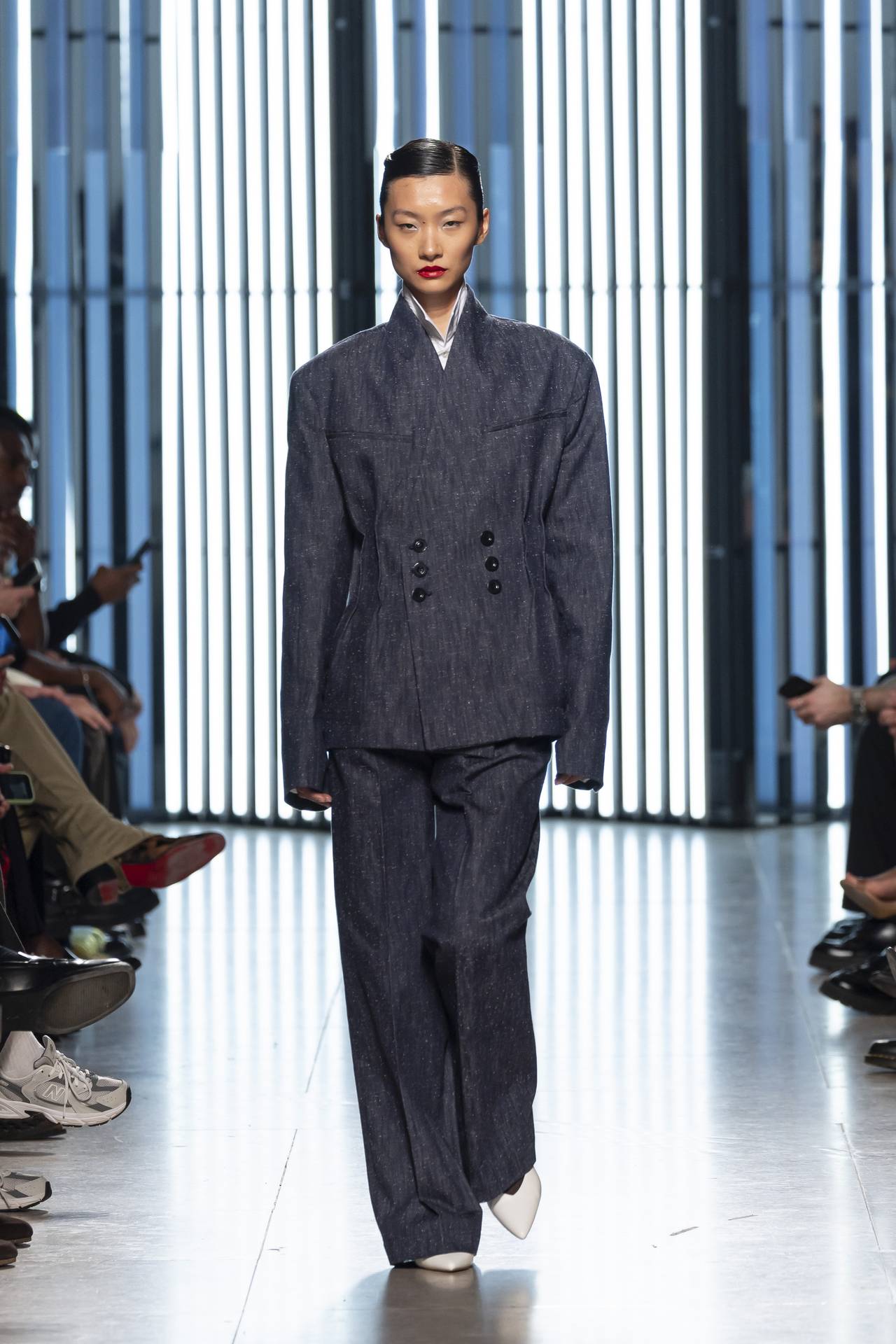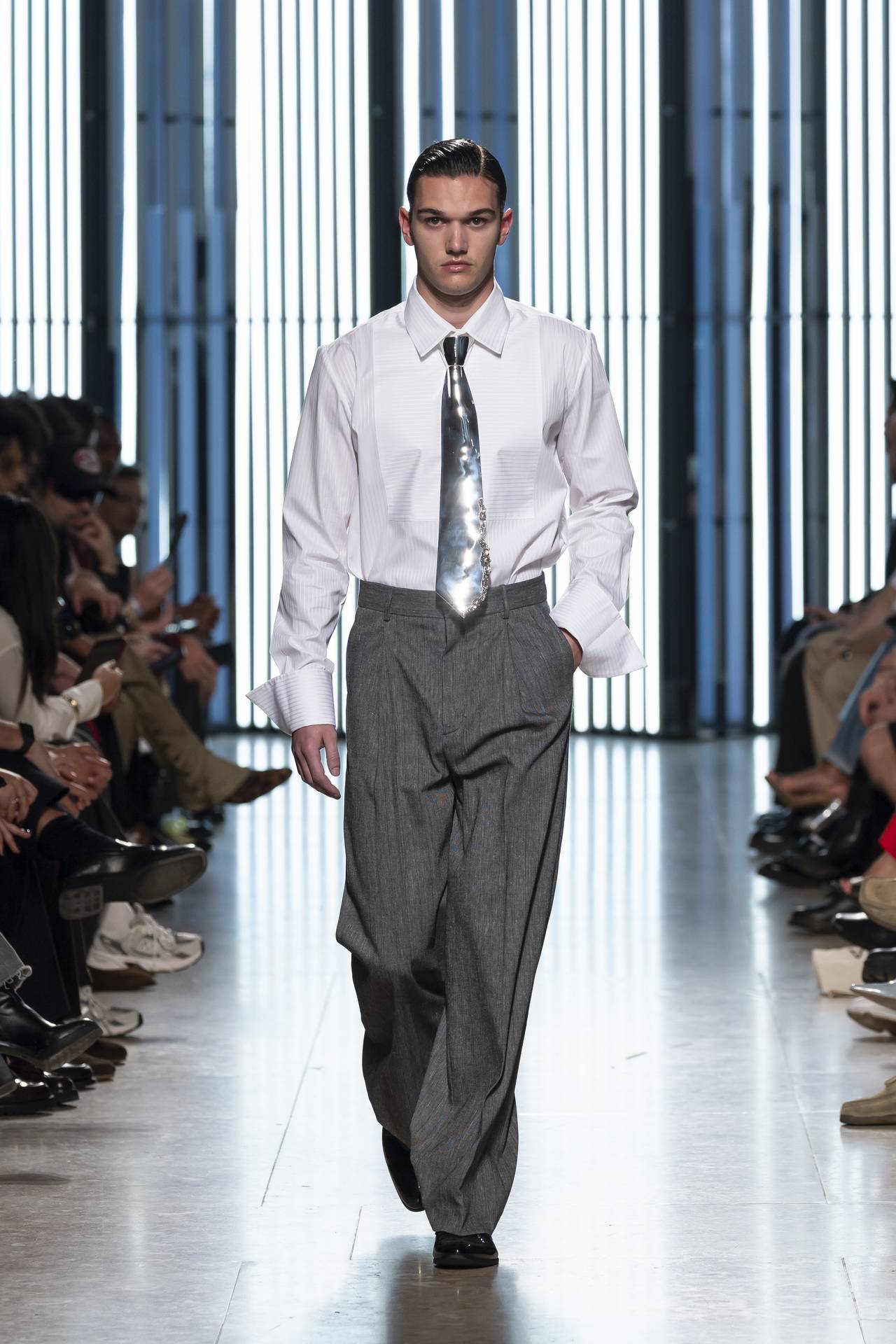 A materialidade assenta na tradição da alfaiataria e em sarjas intemporais, enquanto jacquards de superfície enrugada emergem como metáforas táteis — tecidos com memória própria, marcados por uma beleza vivida, quase herdada. A paleta cromática reflete esta nostalgia serena: uma base de tons cinzentos e preto, complementada por bege e branco, cria um silêncio visual interrompido apenas pelo vermelho-sangue, intenso e pulsante, lembrando que toda a memória é também emoção.