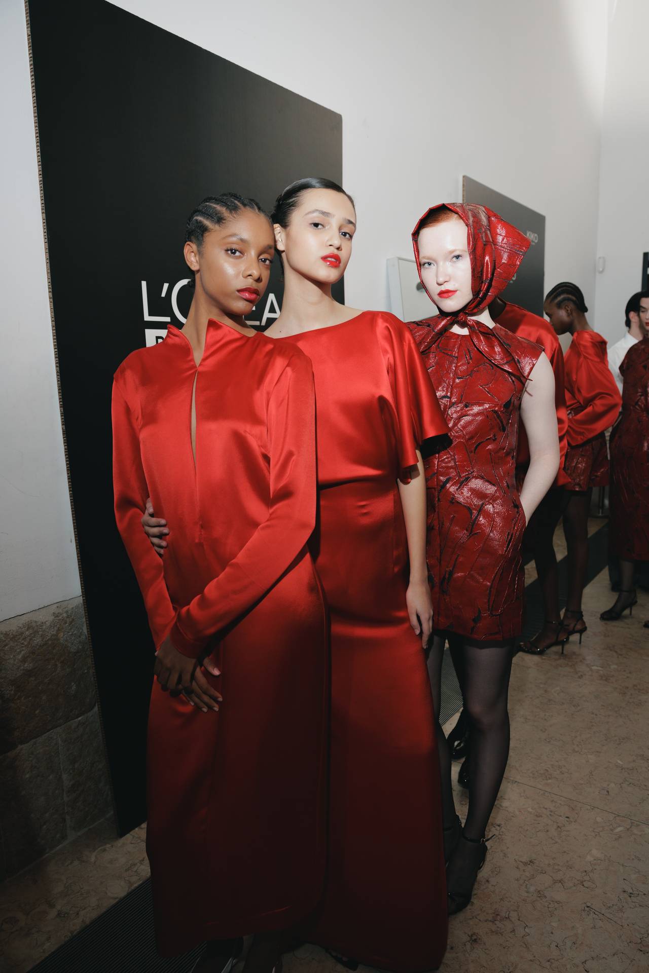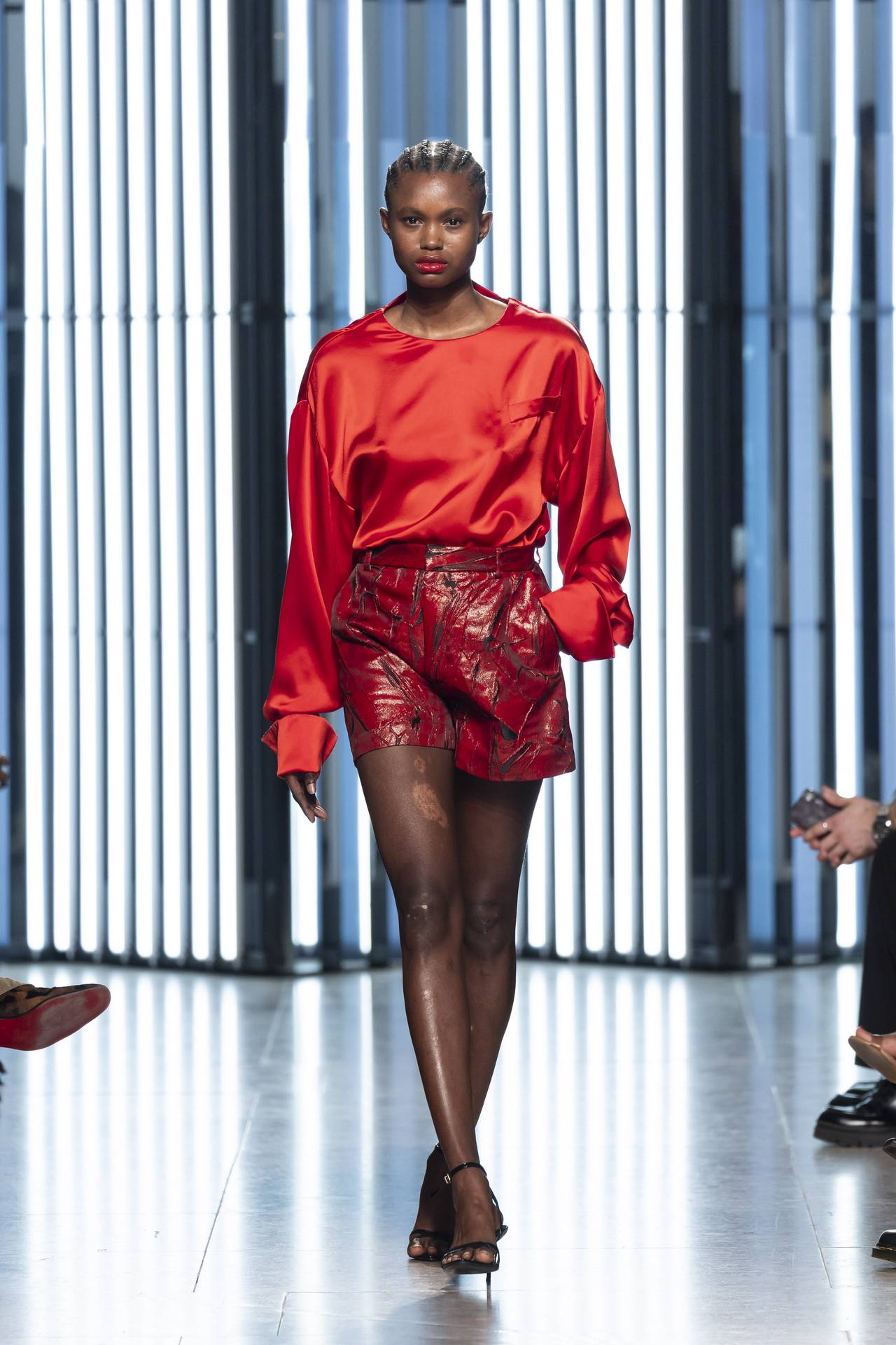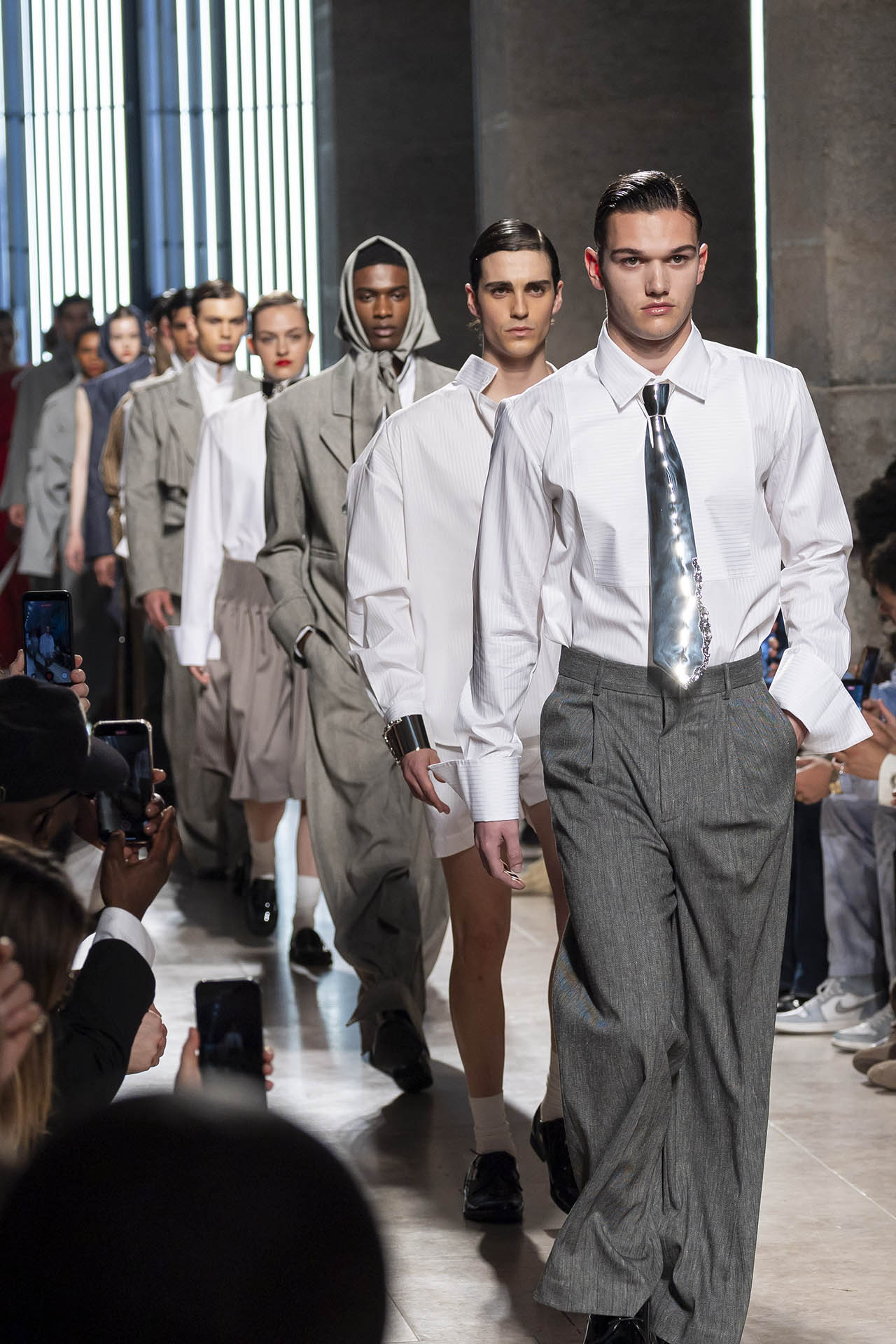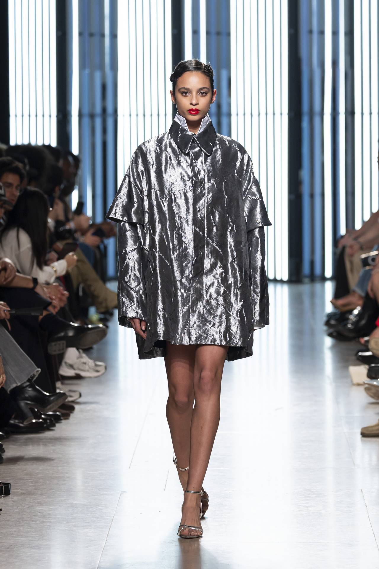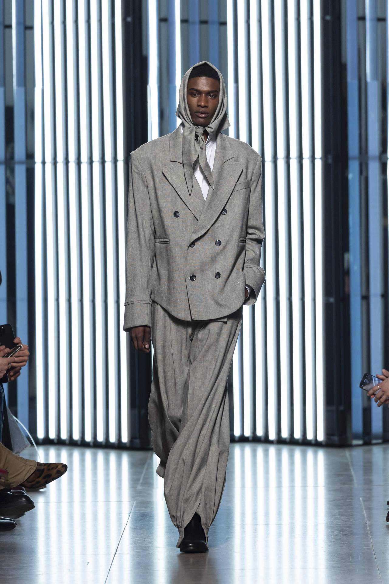 A materialidade assenta na tradição da alfaiataria e em sarjas intemporais, enquanto jacquards de superfície enrugada emergem como metáforas táteis — tecidos com memória própria, marcados por uma beleza vivida, quase herdada. A paleta cromática reflete esta nostalgia serena: uma base de tons cinzentos e preto, complementada por bege e branco, cria um silêncio visual interrompido apenas pelo vermelho-sangue, intenso e pulsante, lembrando que toda a memória é também emoção.