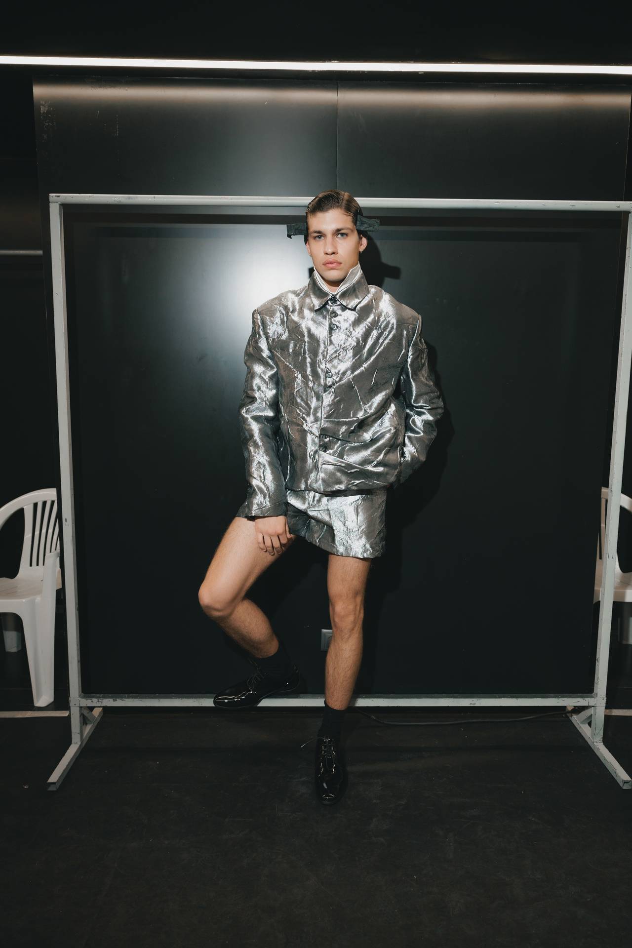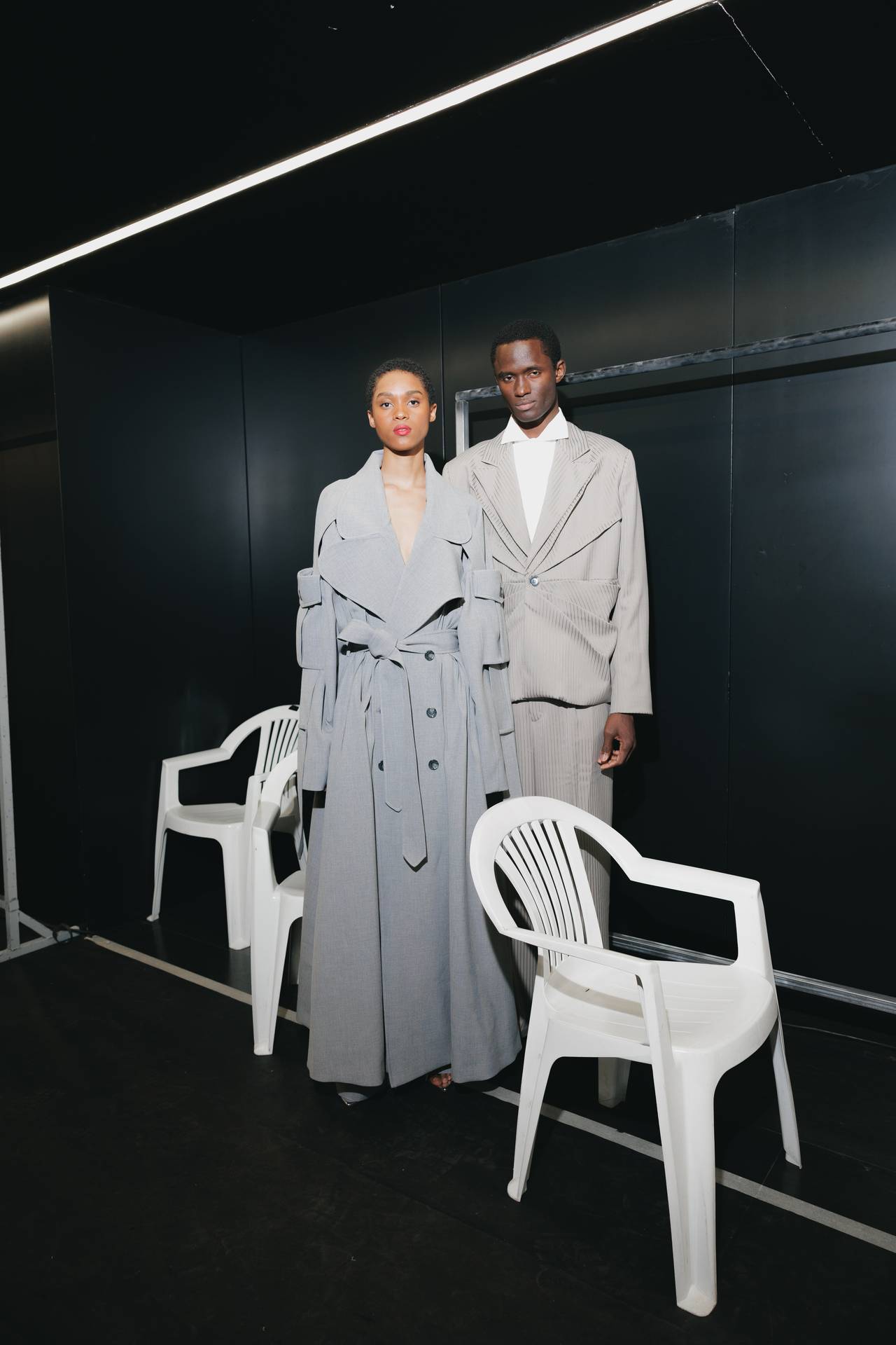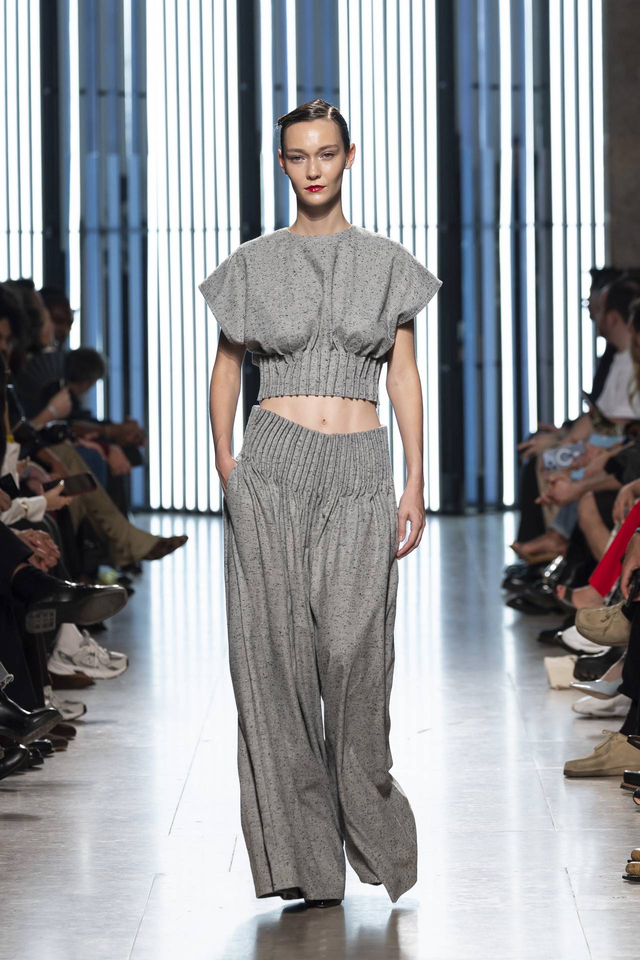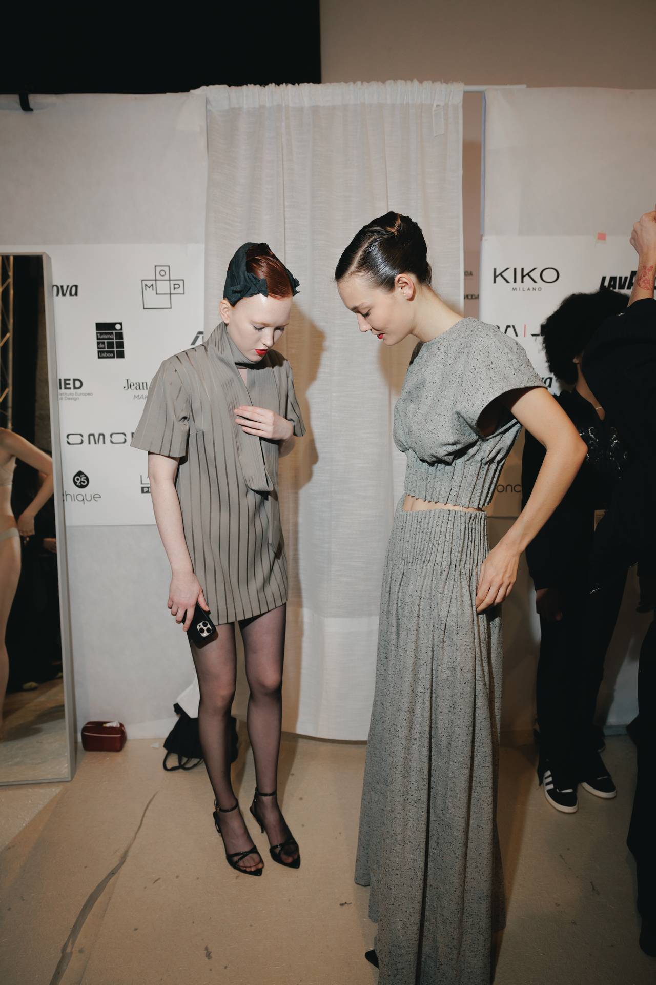 As silhuetas evocam esta dualidade entre presença e ausência: cinturas marcadas que agarram o corpo contrastam com ombros estruturados ou cavas descaídas, sugerindo uma atitude despreocupada, quase instintiva. Instala-se uma tensão delicada entre controlo e abandono, entre rigor e liberdade — como se as peças carregassem o peso suave do passado, oscilando entre aquilo que se recorda e aquilo que se reinventa.