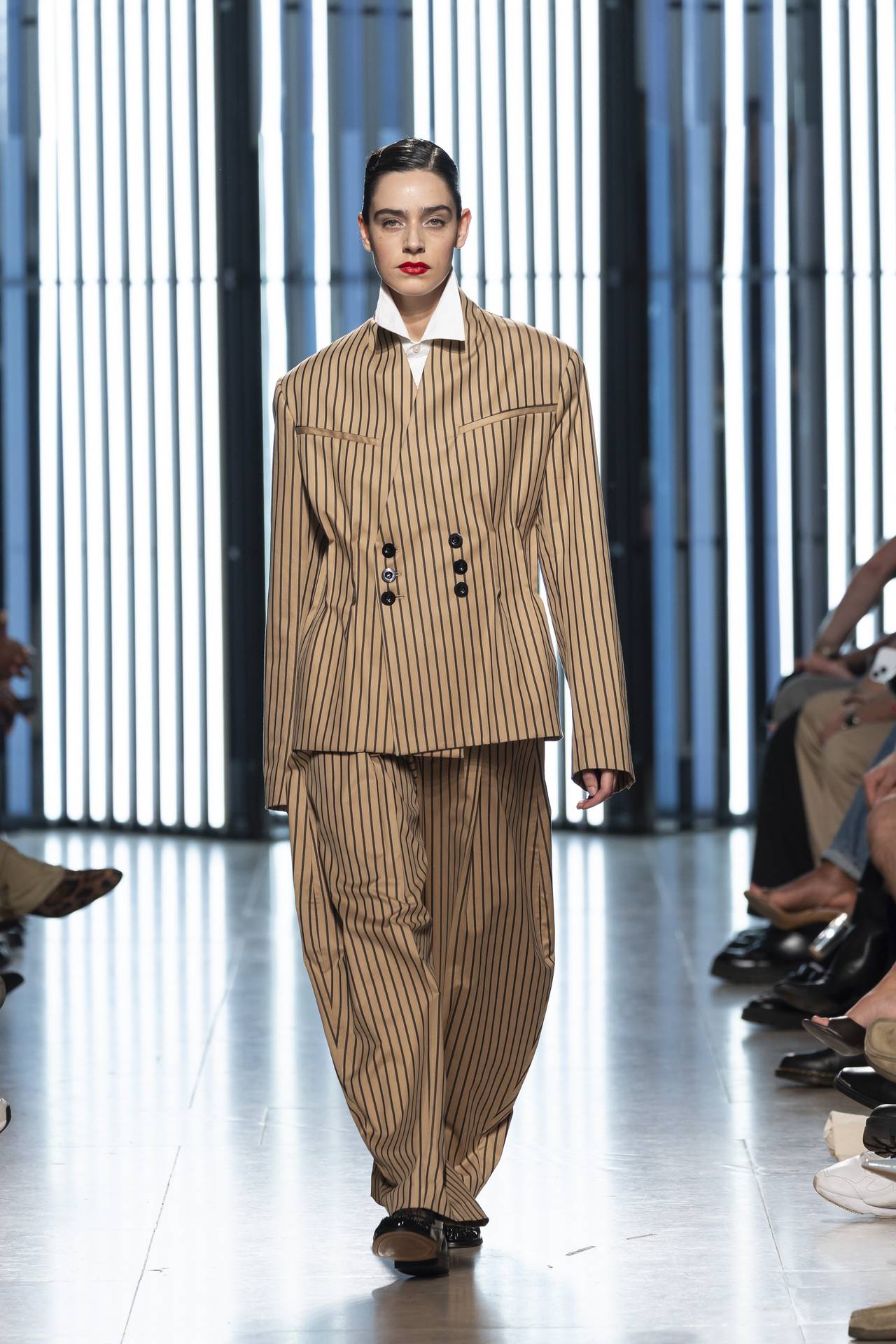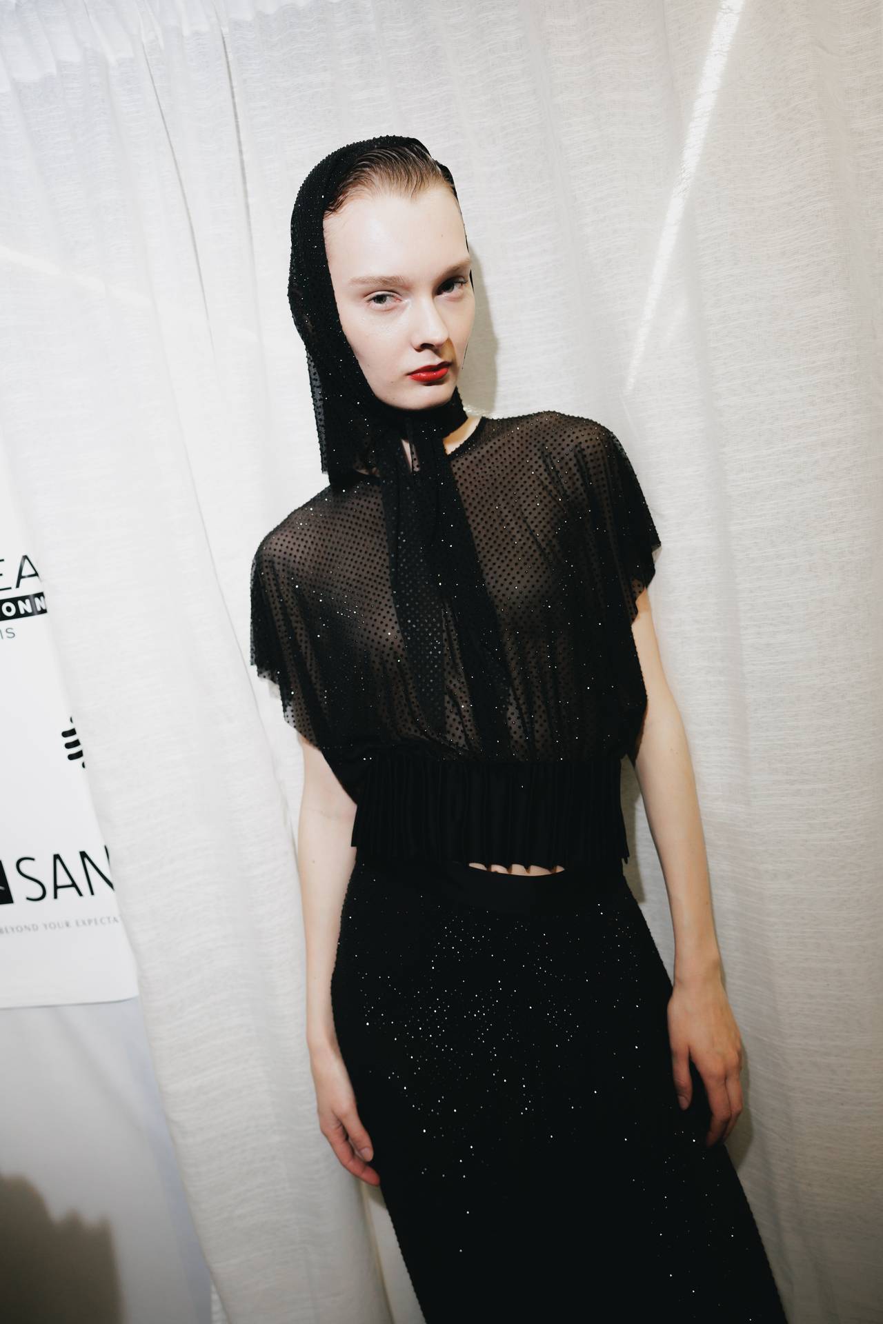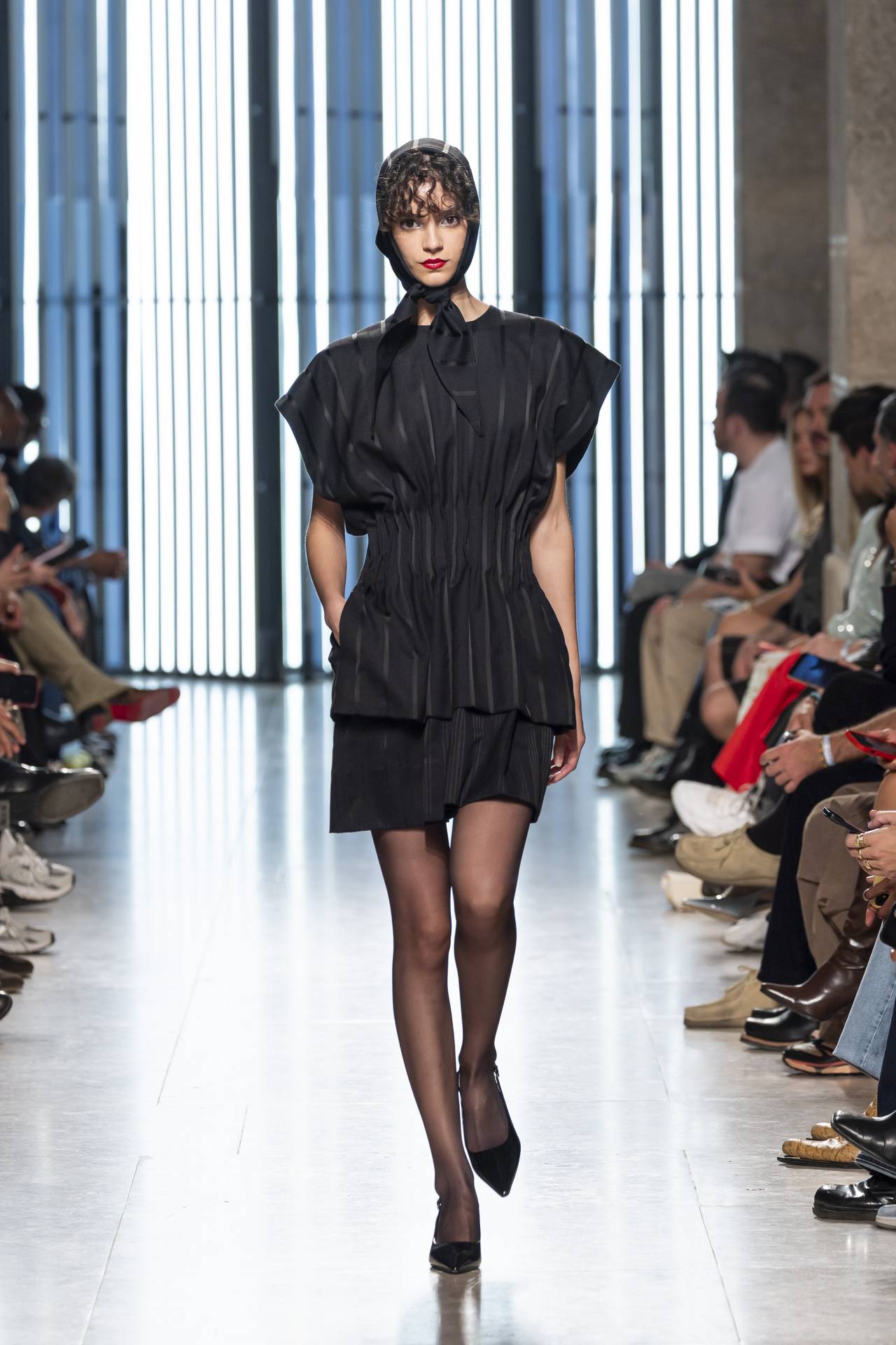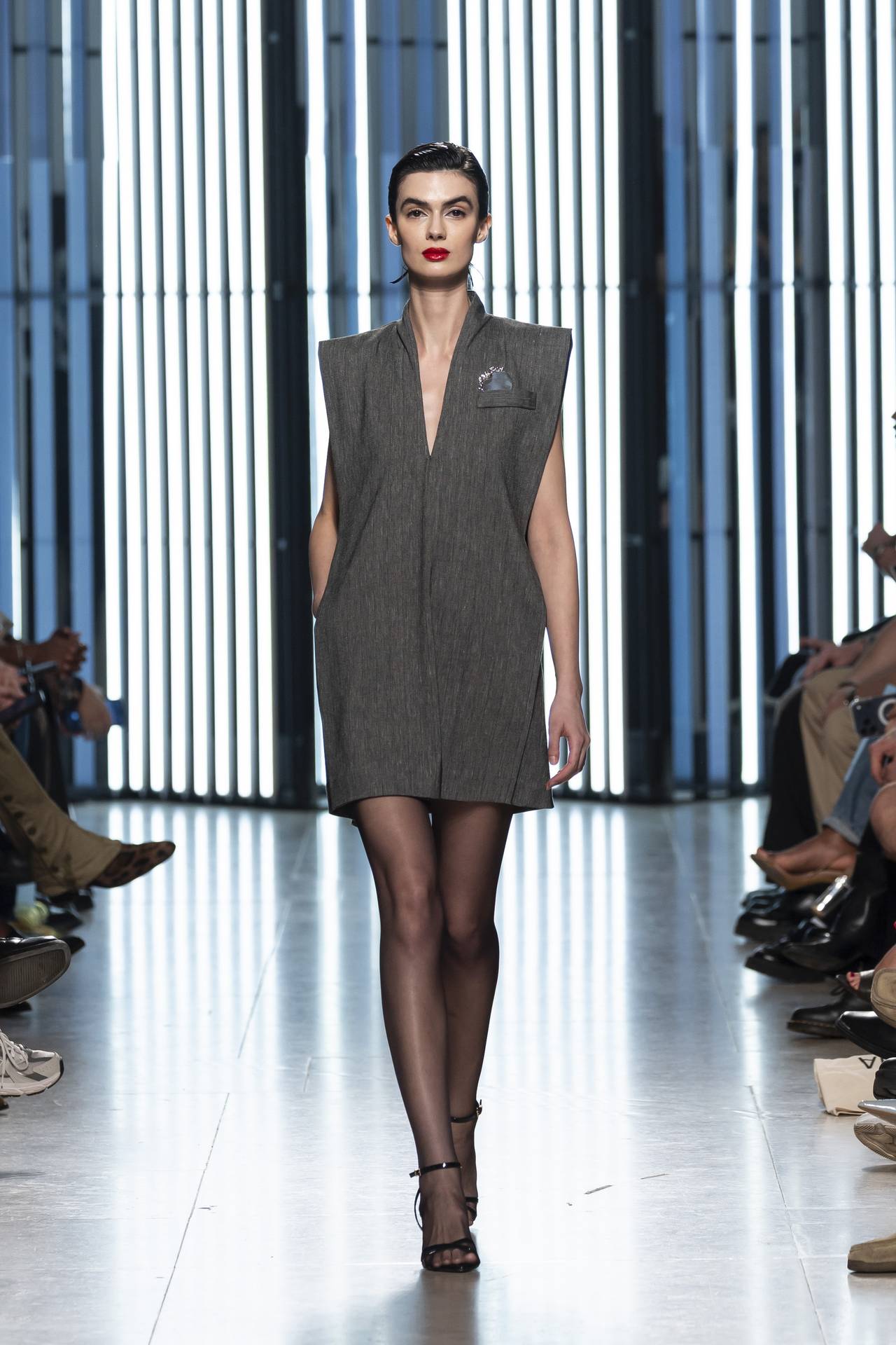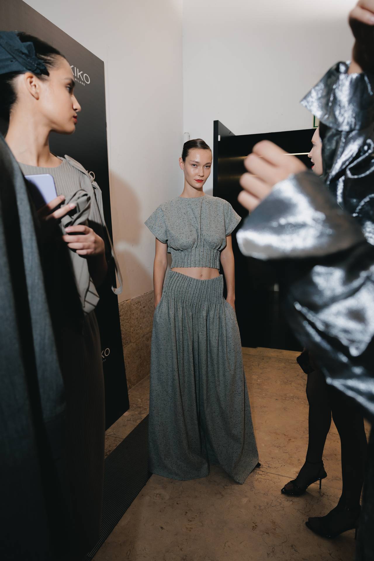 As silhuetas evocam esta dualidade entre presença e ausência: cinturas marcadas que agarram o corpo contrastam com ombros estruturados ou cavas descaídas, sugerindo uma atitude despreocupada, quase instintiva. Instala-se uma tensão delicada entre controlo e abandono, entre rigor e liberdade — como se as peças carregassem o peso suave do passado, oscilando entre aquilo que se recorda e aquilo que se reinventa.