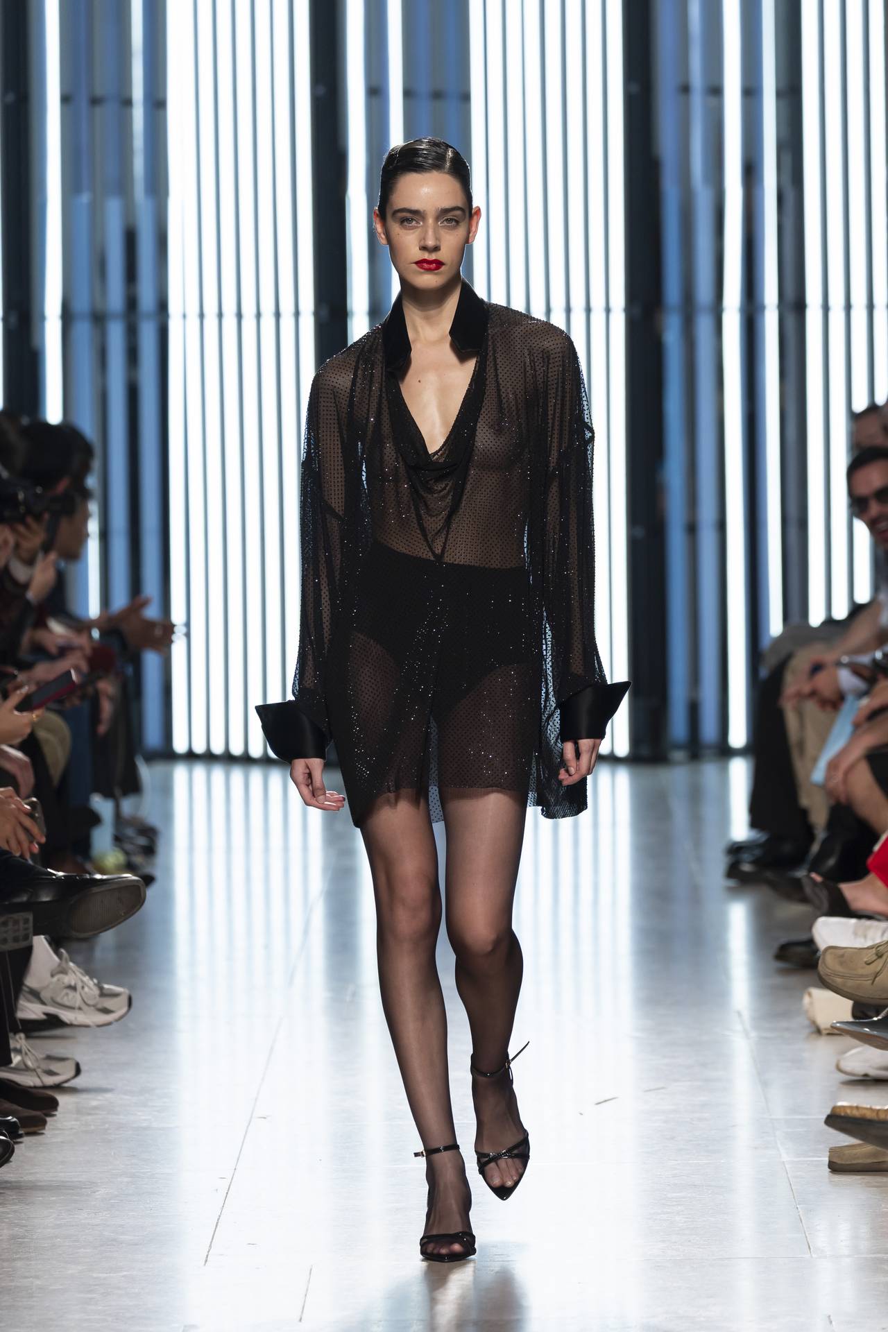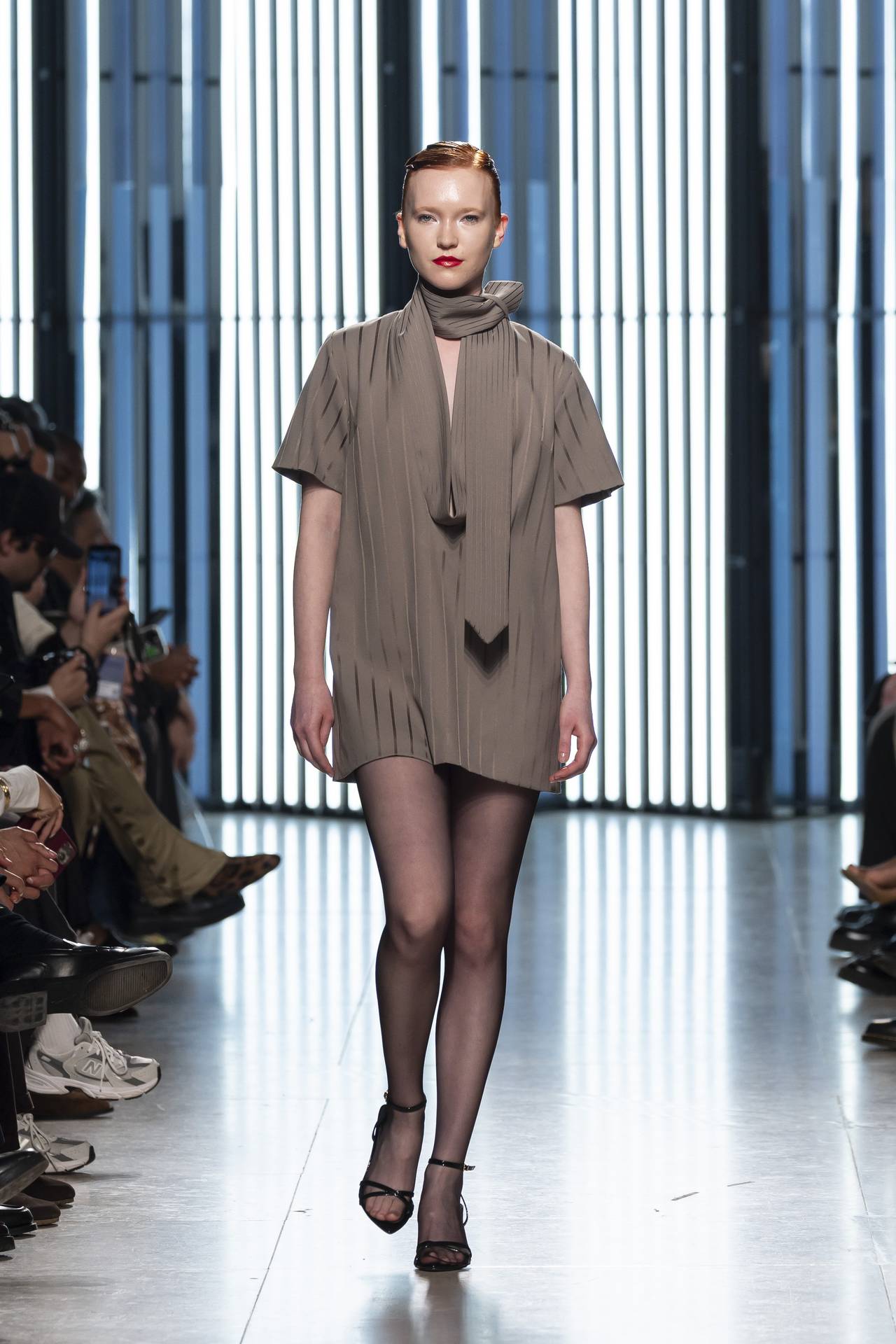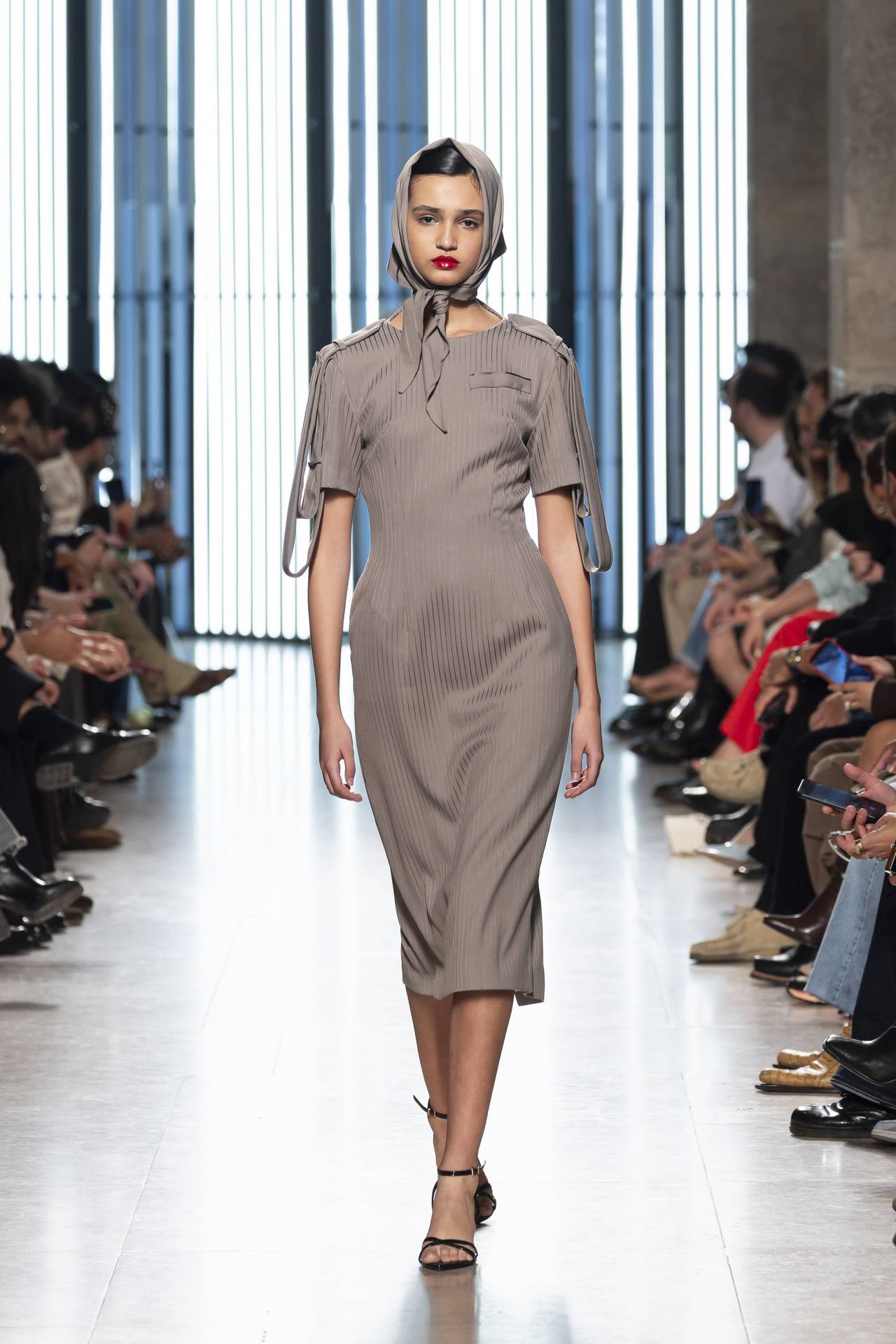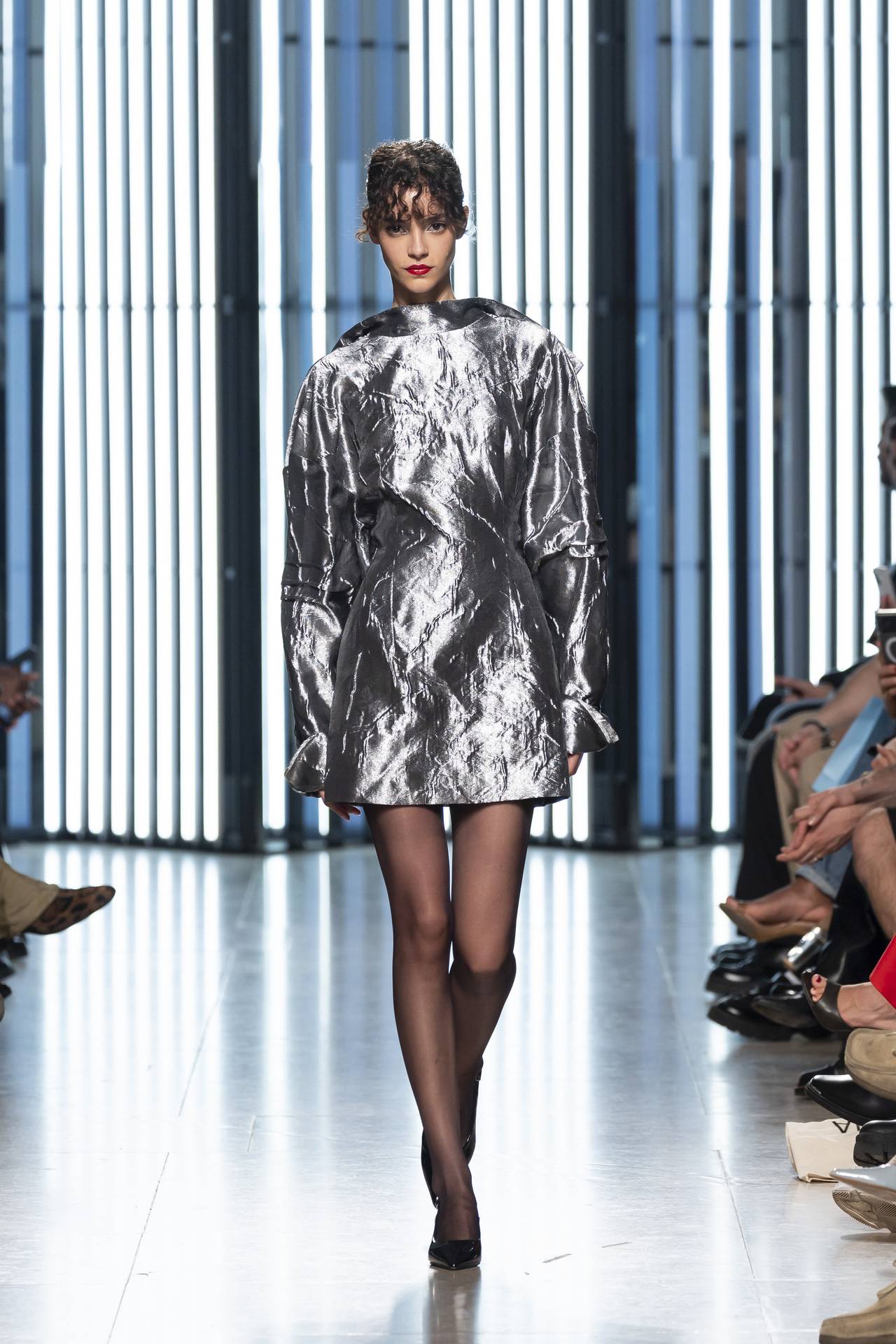 As silhuetas evocam esta dualidade entre presença e ausência: cinturas marcadas que agarram o corpo contrastam com ombros estruturados ou cavas descaídas, sugerindo uma atitude despreocupada, quase instintiva. Instala-se uma tensão delicada entre controlo e abandono, entre rigor e liberdade — como se as peças carregassem o peso suave do passado, oscilando entre aquilo que se recorda e aquilo que se reinventa.