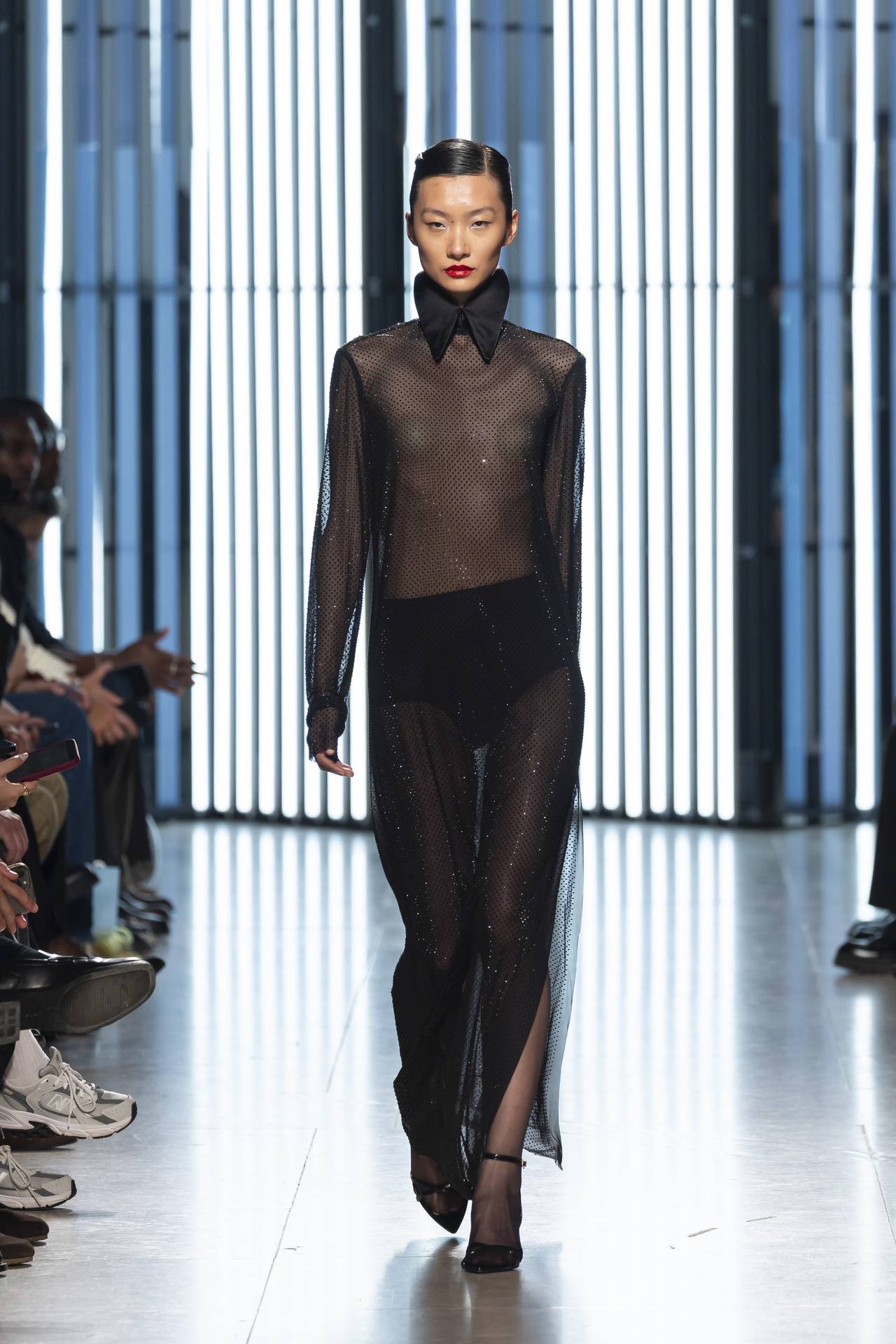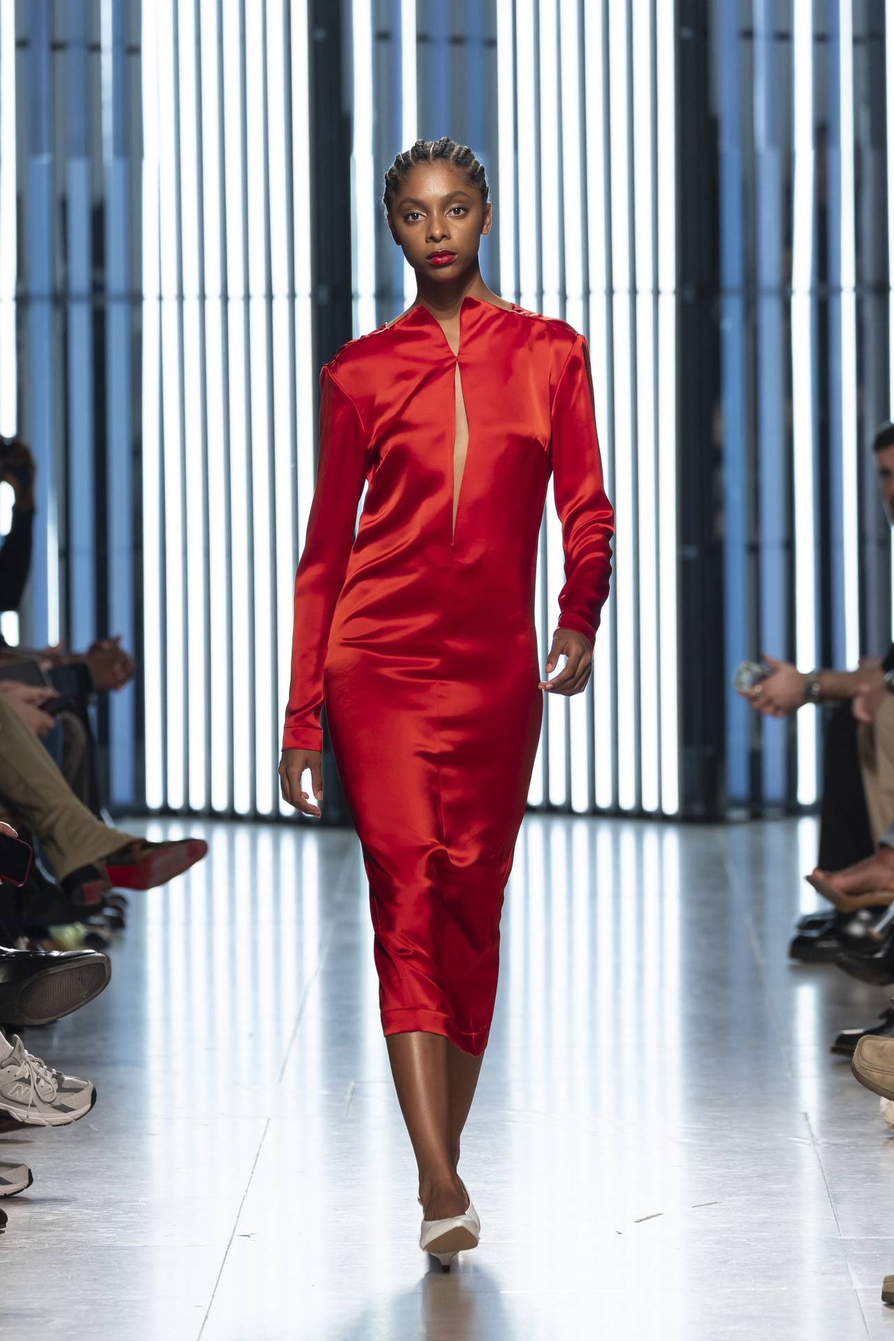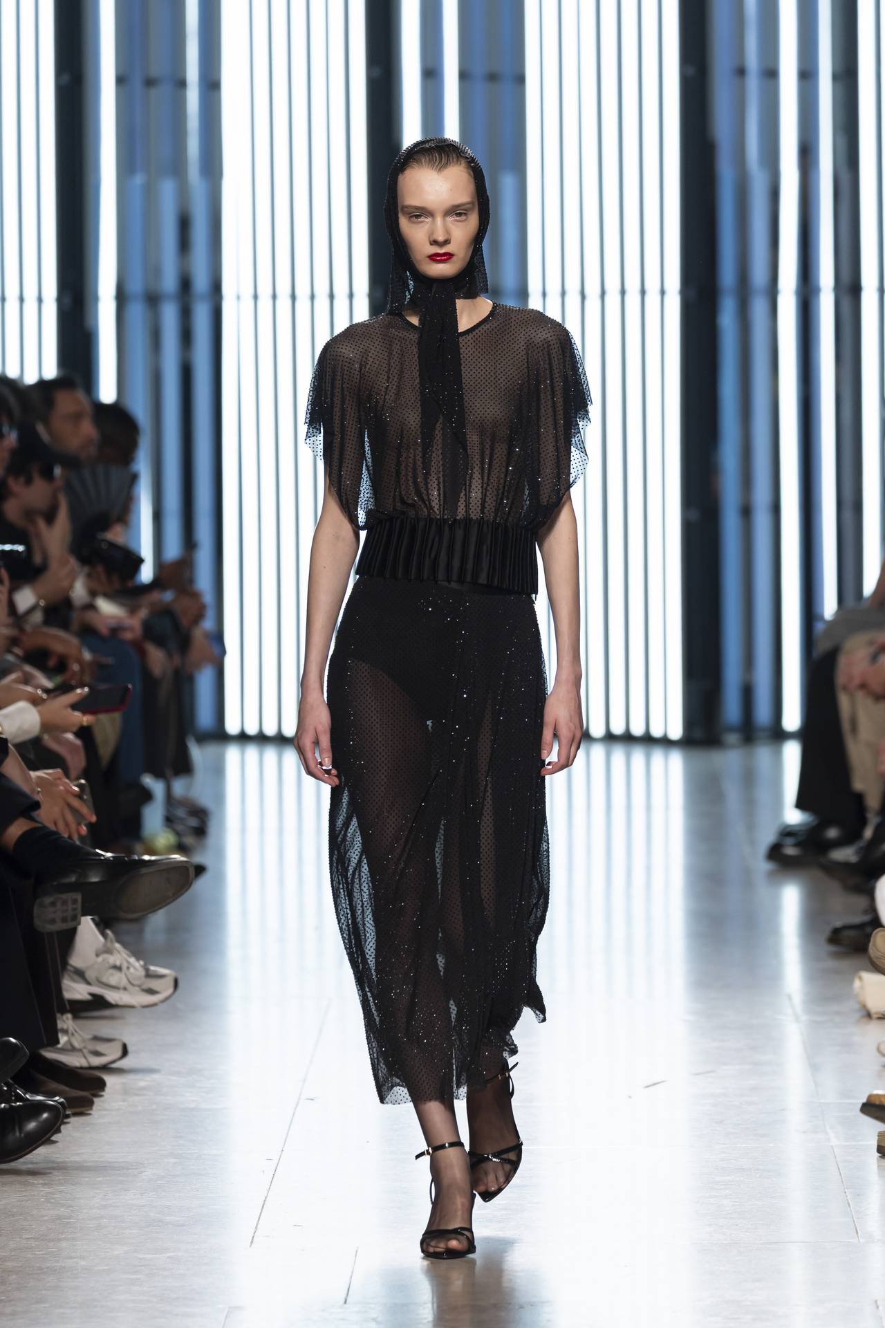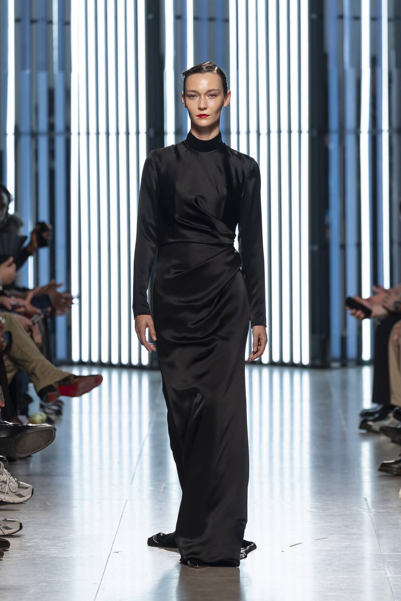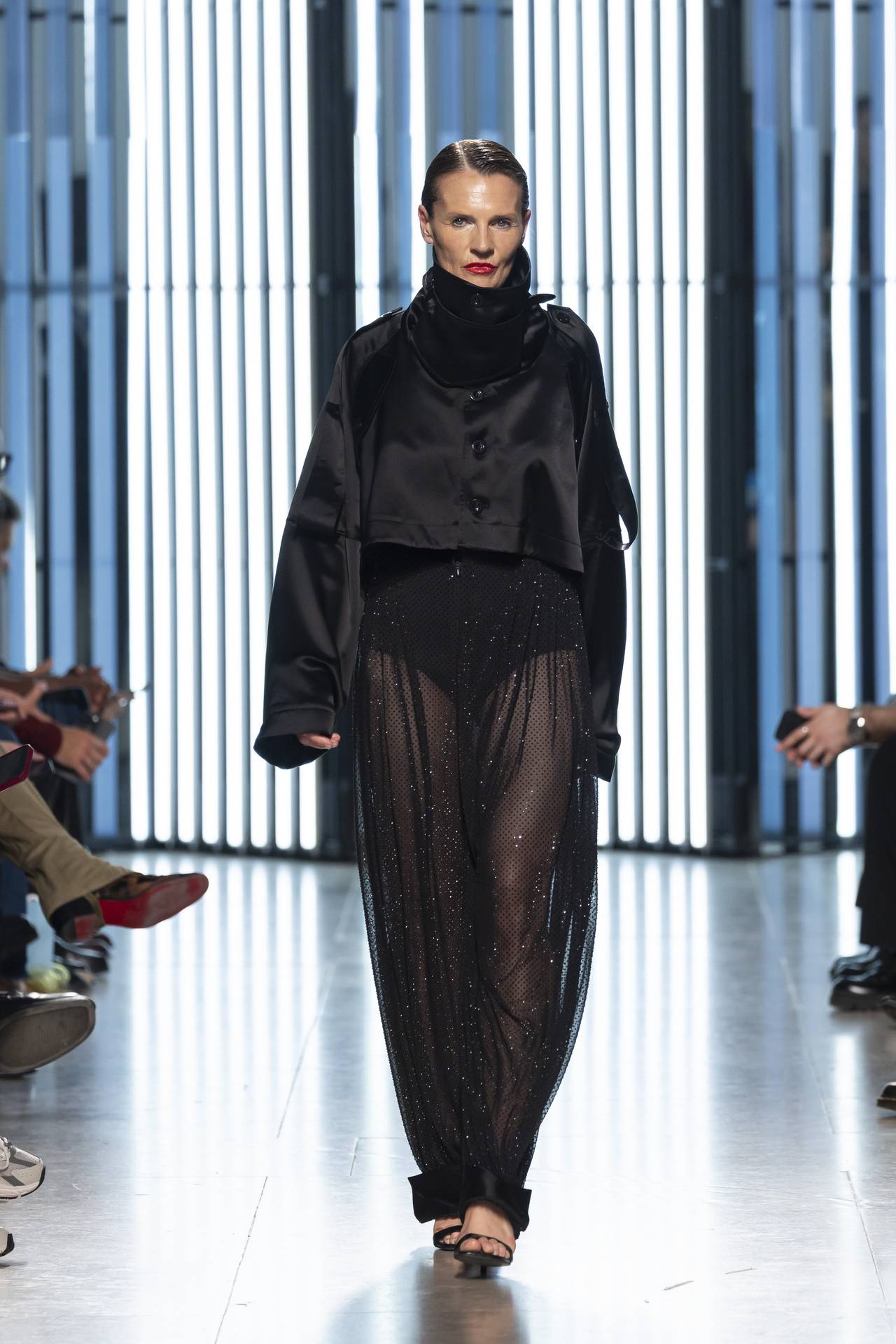 As silhuetas evocam esta dualidade entre presença e ausência: cinturas marcadas que agarram o corpo contrastam com ombros estruturados ou cavas descaídas, sugerindo uma atitude despreocupada, quase instintiva. Instala-se uma tensão delicada entre controlo e abandono, entre rigor e liberdade — como se as peças carregassem o peso suave do passado, oscilando entre aquilo que se recorda e aquilo que se reinventa.