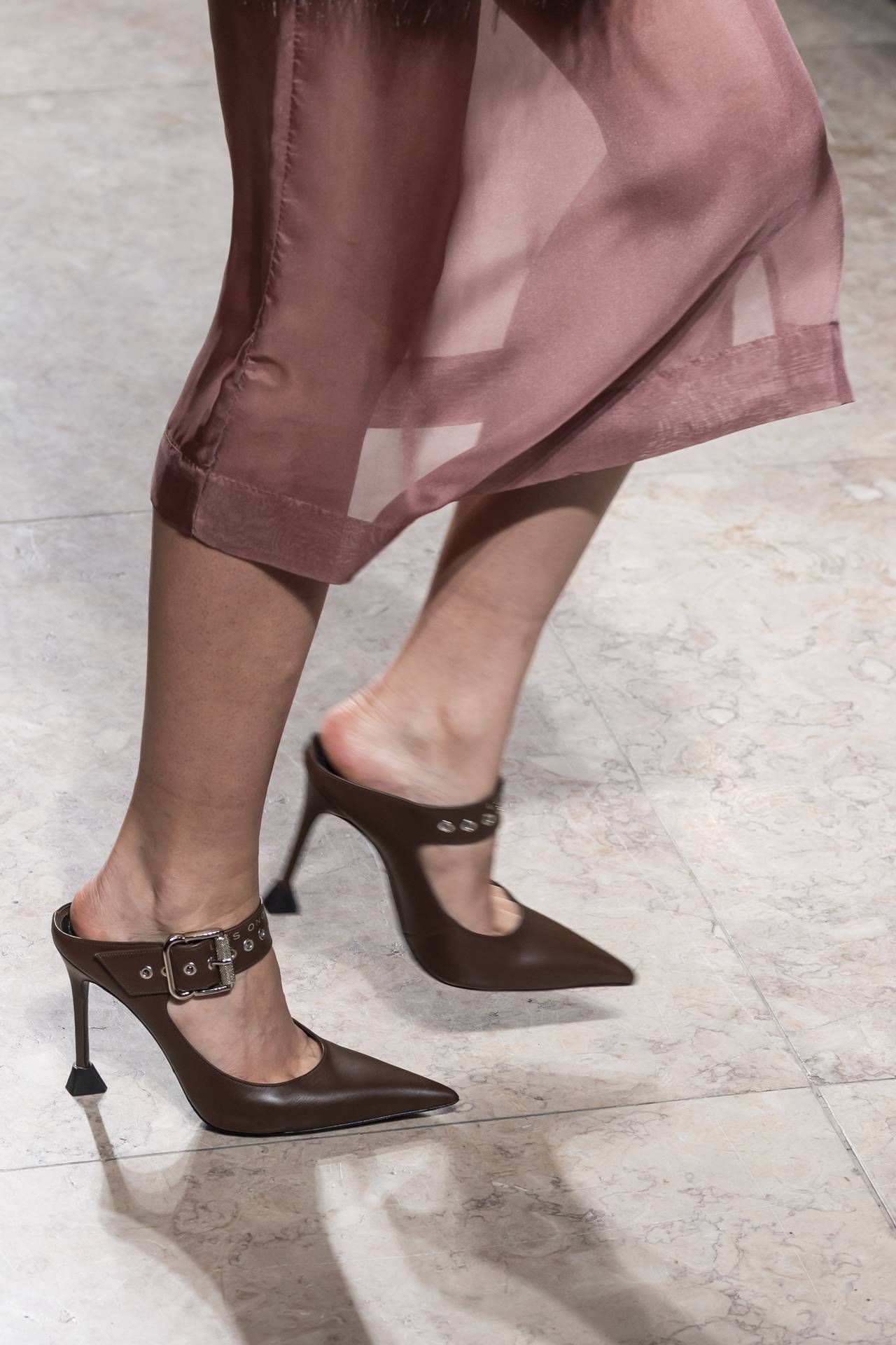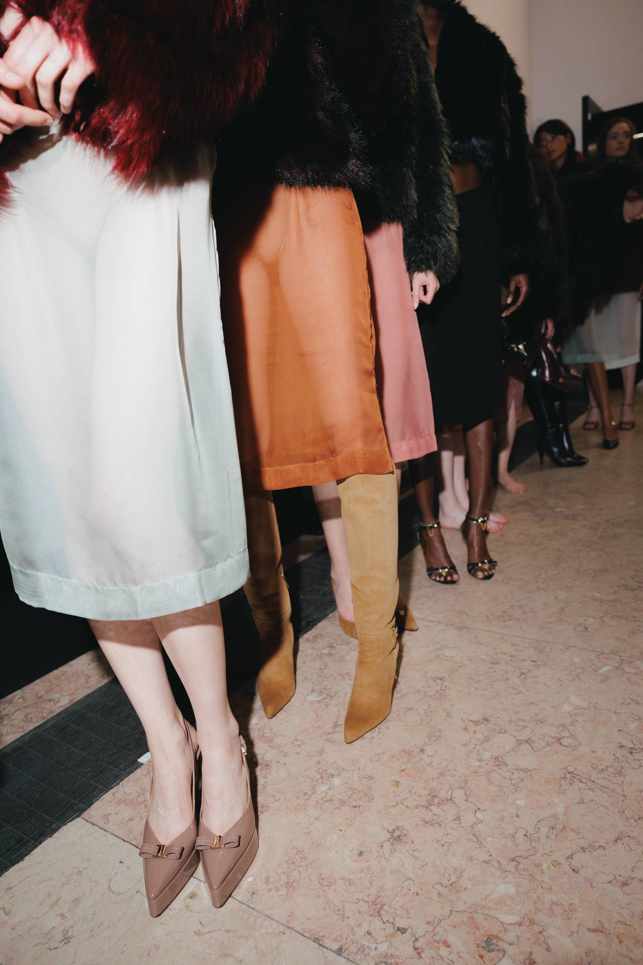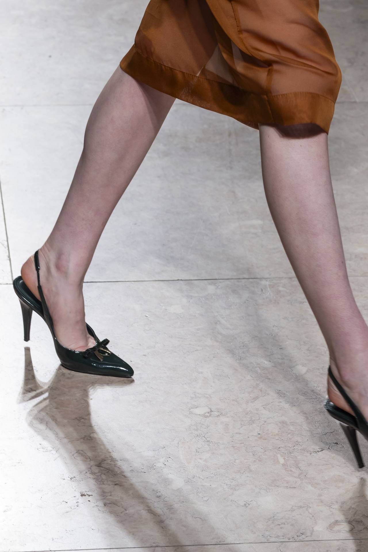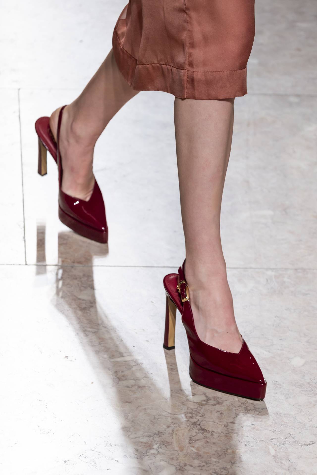 Stilettos extra pointed contrastam com formas retro arredondadas, criando tensão entre elegância clássica e ousadia contemporânea. Vernizes profundos e camurças suaves evocam o passado numa paleta sofisticada de grená, verde bosque, bordeaux, tan, taupe, castanhos intensos e preto absoluto. Sem cristais, a força reside na pureza das linhas e na silhueta.