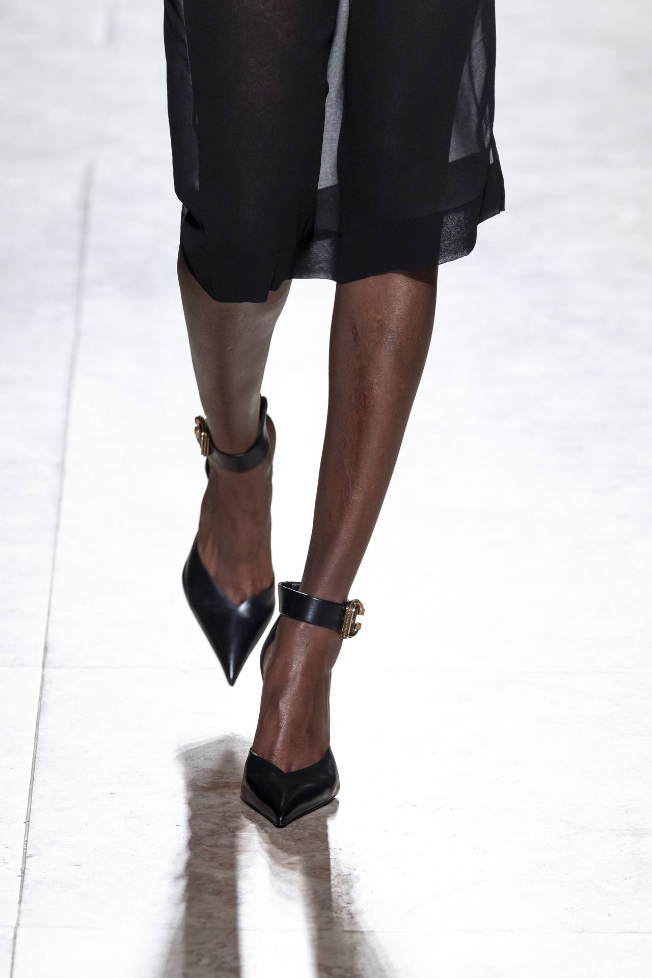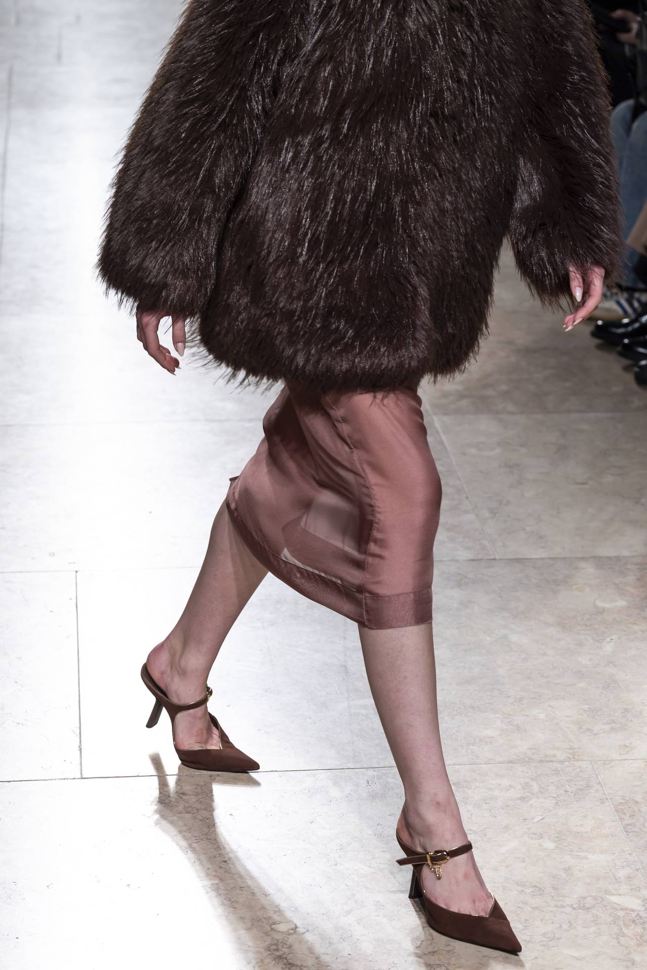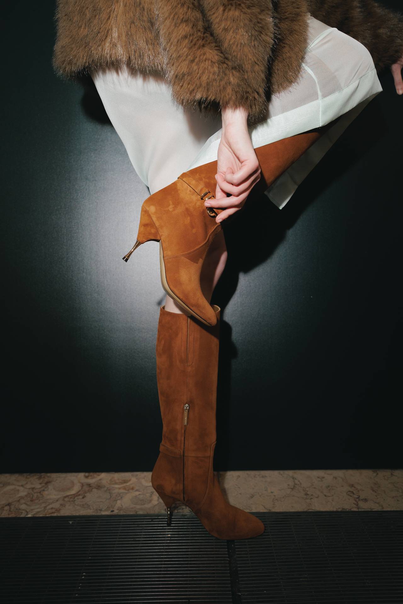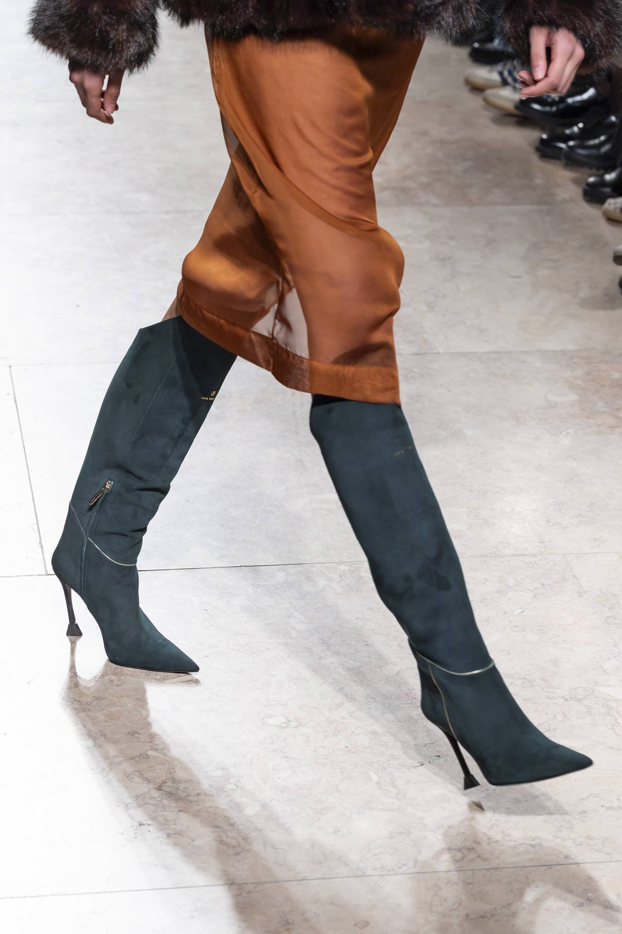 Stilettos extra pointed contrastam com formas retro arredondadas, criando tensão entre elegância clássica e ousadia contemporânea. Vernizes profundos e camurças suaves evocam o passado numa paleta sofisticada de grená, verde bosque, bordeaux, tan, taupe, castanhos intensos e preto absoluto. Sem cristais, a força reside na pureza das linhas e na silhueta.