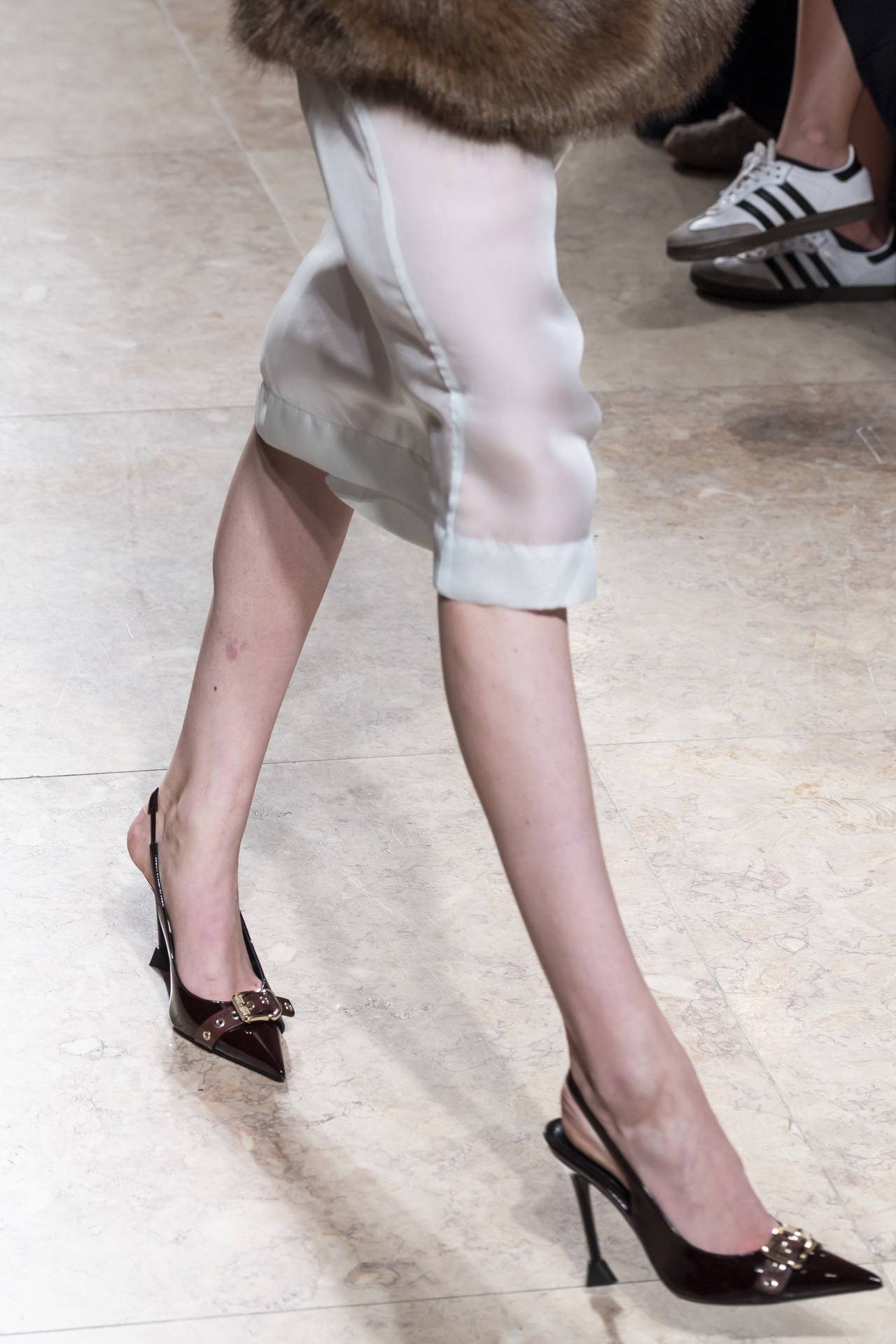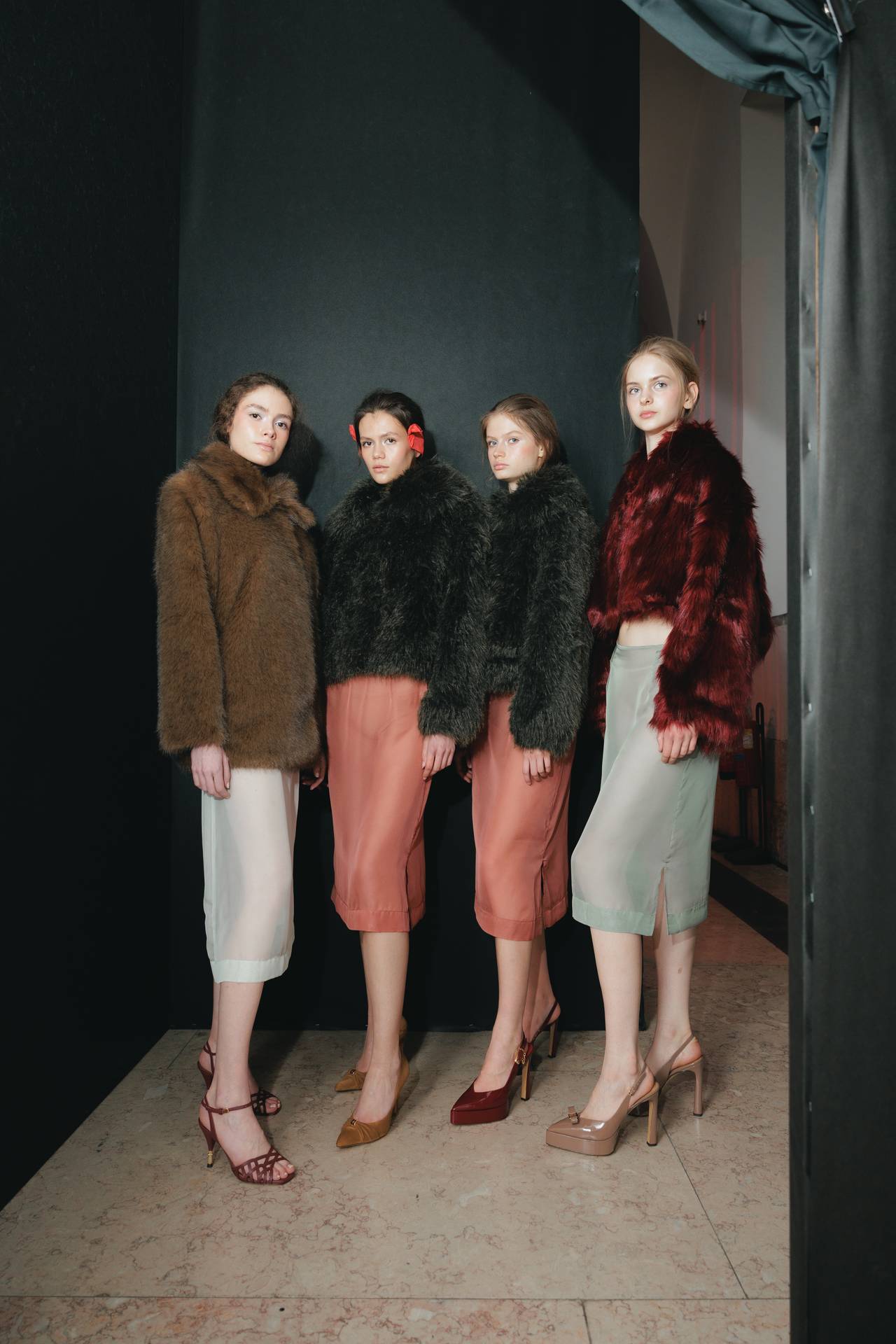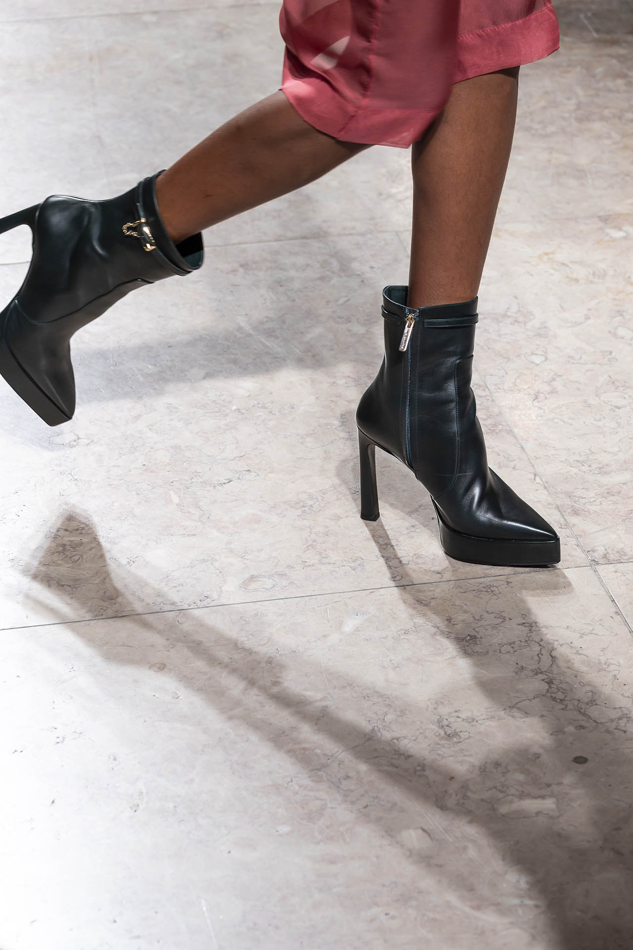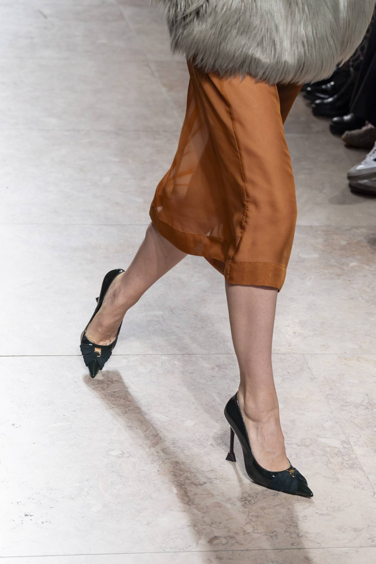 Stilettos extra pointed contrastam com formas retro arredondadas, criando tensão entre elegância clássica e ousadia contemporânea. Vernizes profundos e camurças suaves evocam o passado numa paleta sofisticada de grená, verde bosque, bordeaux, tan, taupe, castanhos intensos e preto absoluto. Sem cristais, a força reside na pureza das linhas e na silhueta.