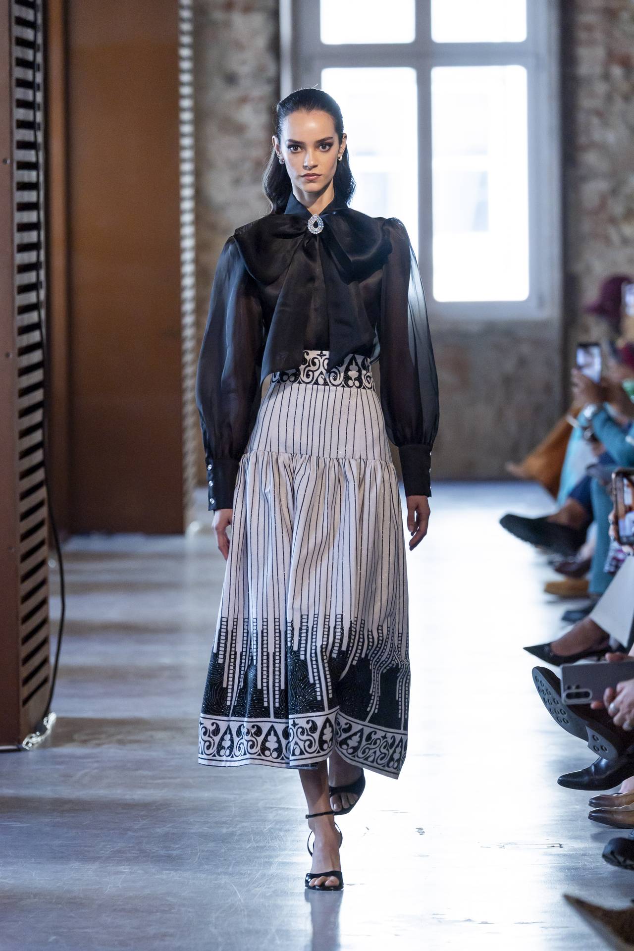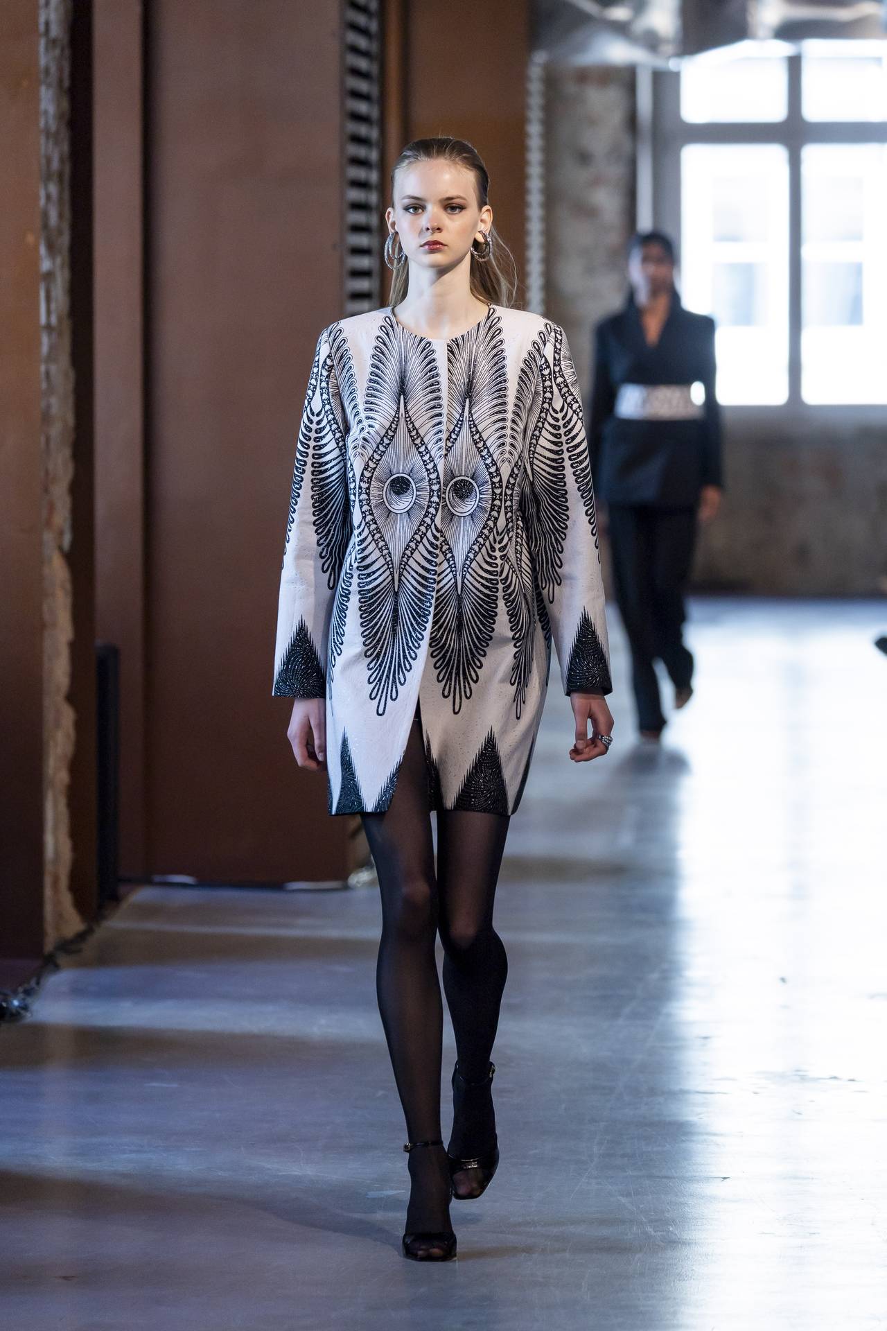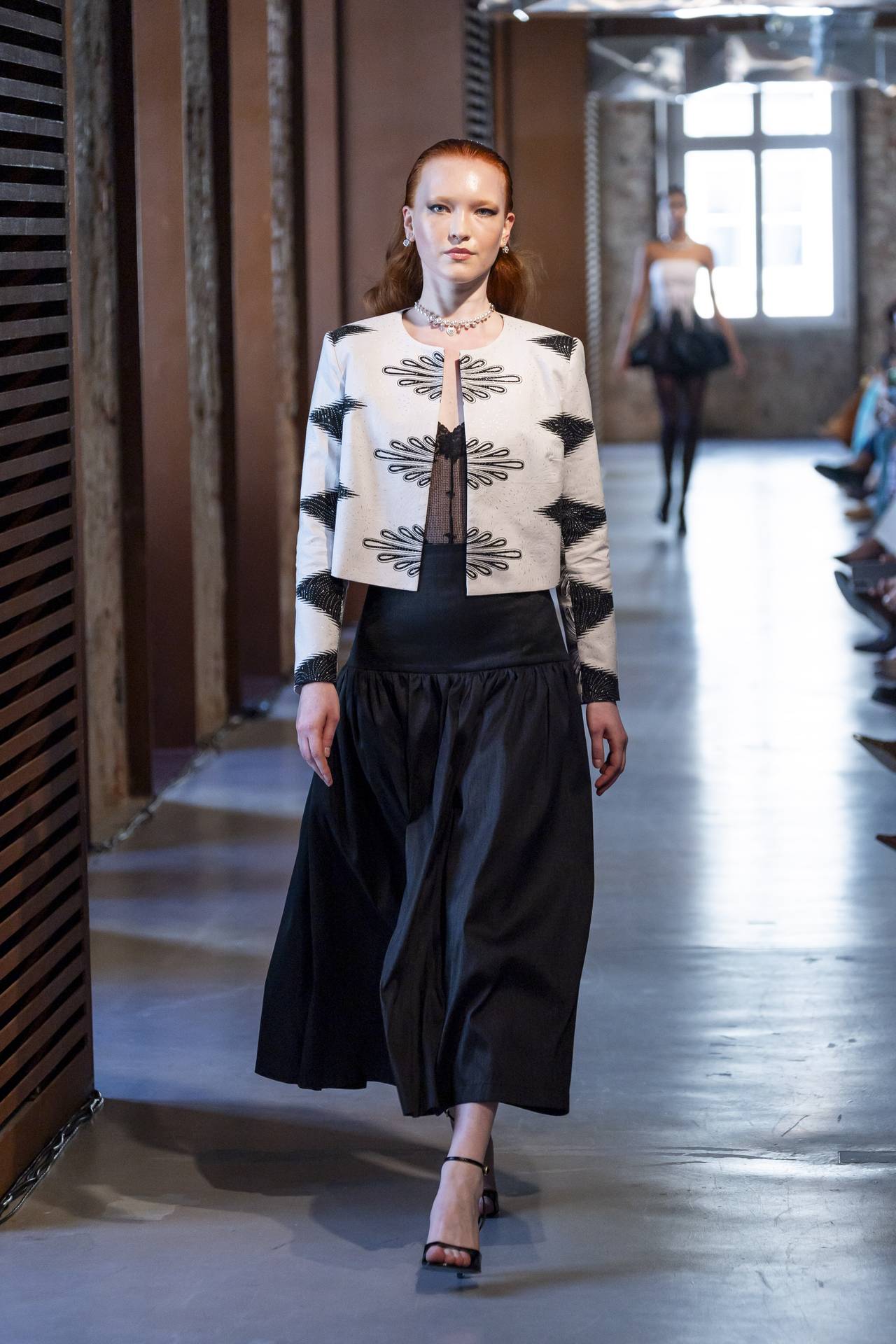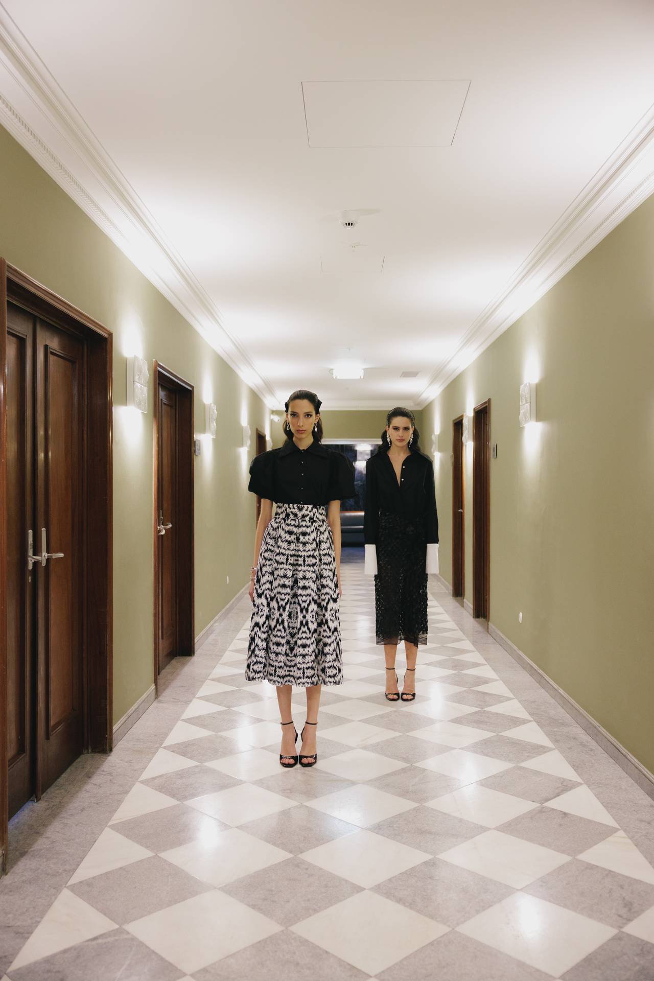 Tecidos africanos raros em preto e branco são integrados e combinados com sedas e rendas, criando contrastes de textura e uma sensação de riqueza material. A coleção realça a mulher e valoriza a autenticidade através de peças versáteis e elegantes, pensadas para um guarda-roupa consciente e duradouro.