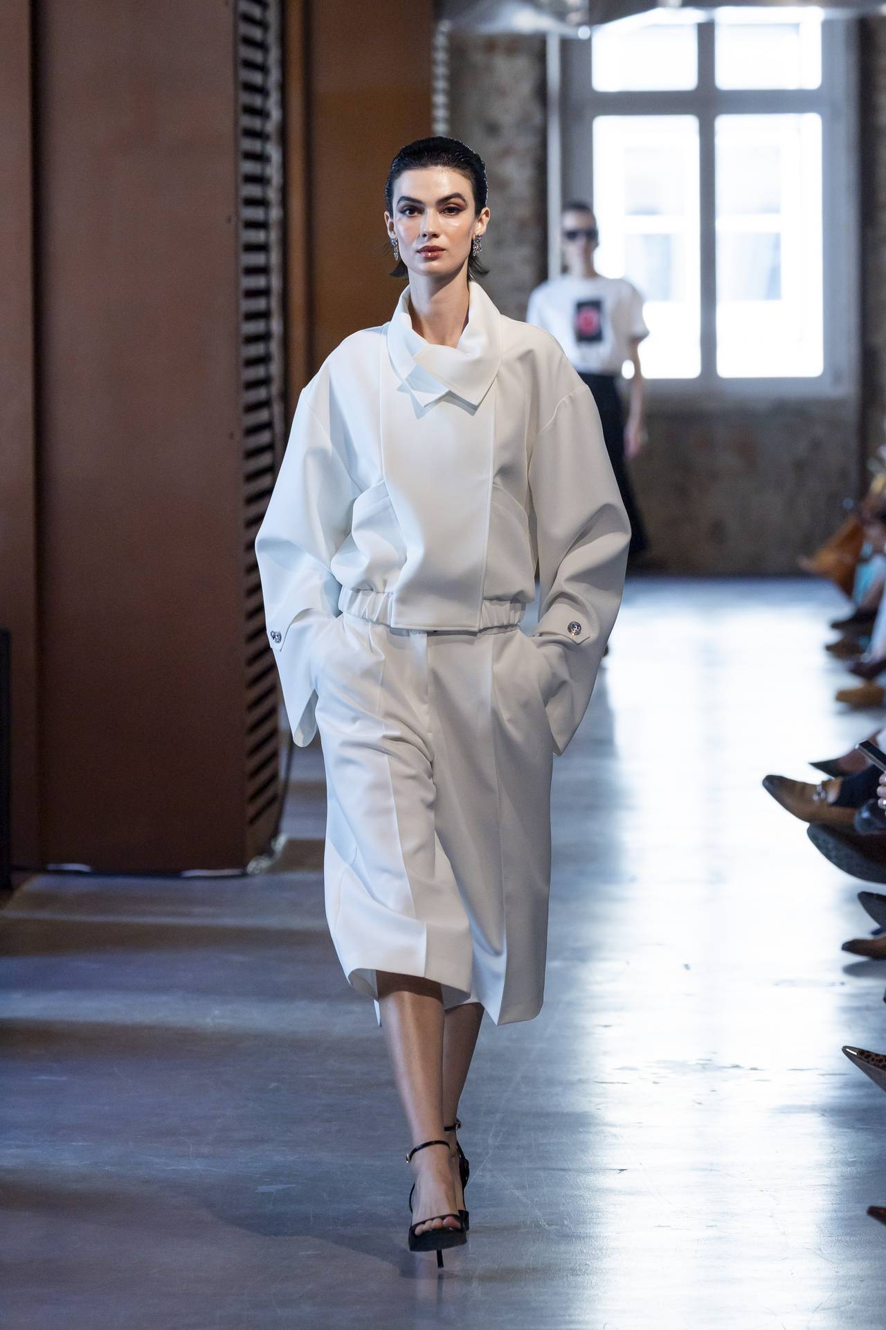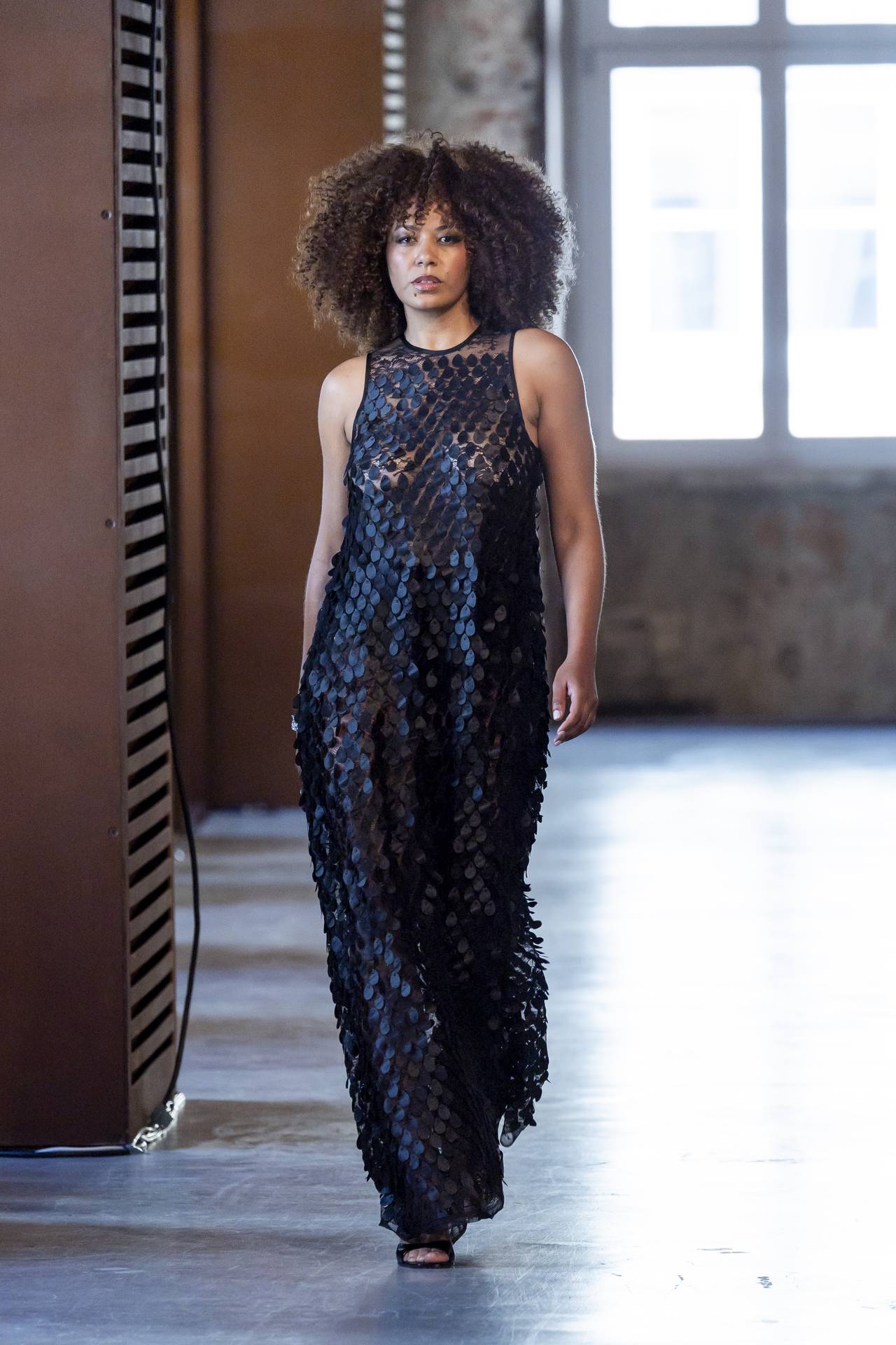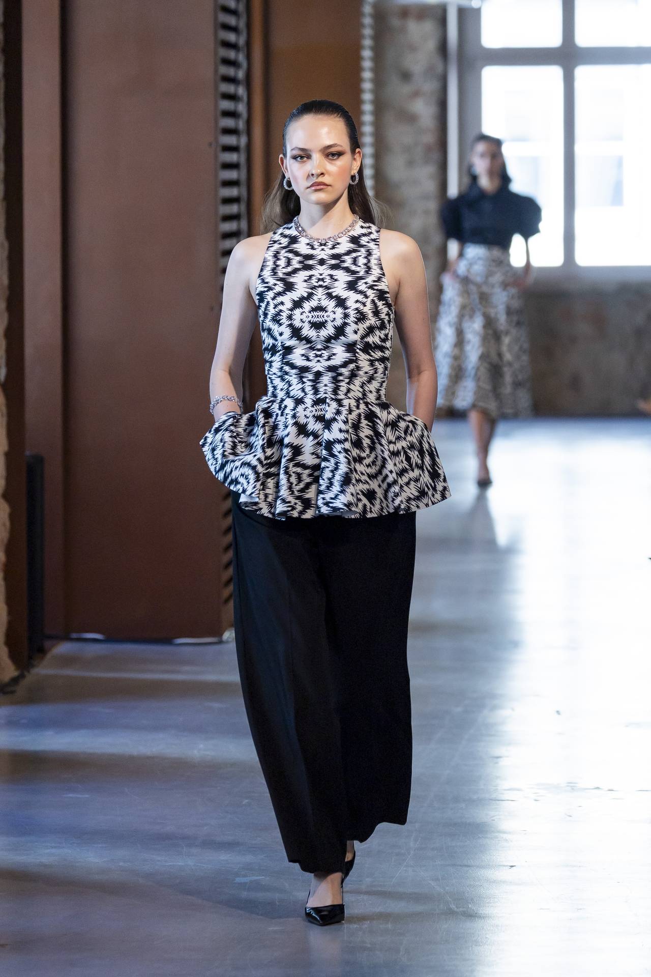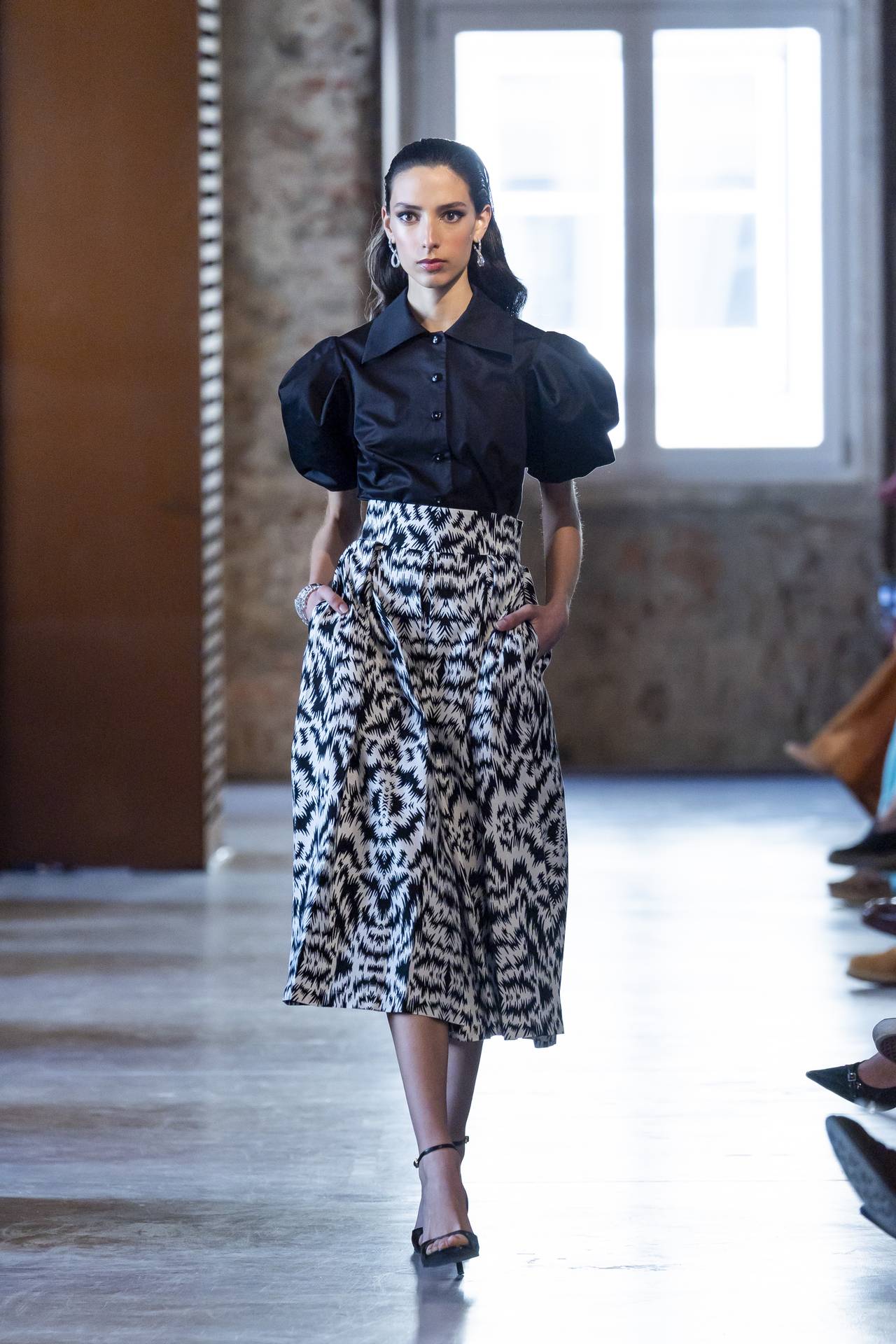 Tecidos africanos raros em preto e branco são integrados e combinados com sedas e rendas, criando contrastes de textura e uma sensação de riqueza material. A coleção realça a mulher e valoriza a autenticidade através de peças versáteis e elegantes, pensadas para um guarda-roupa consciente e duradouro.